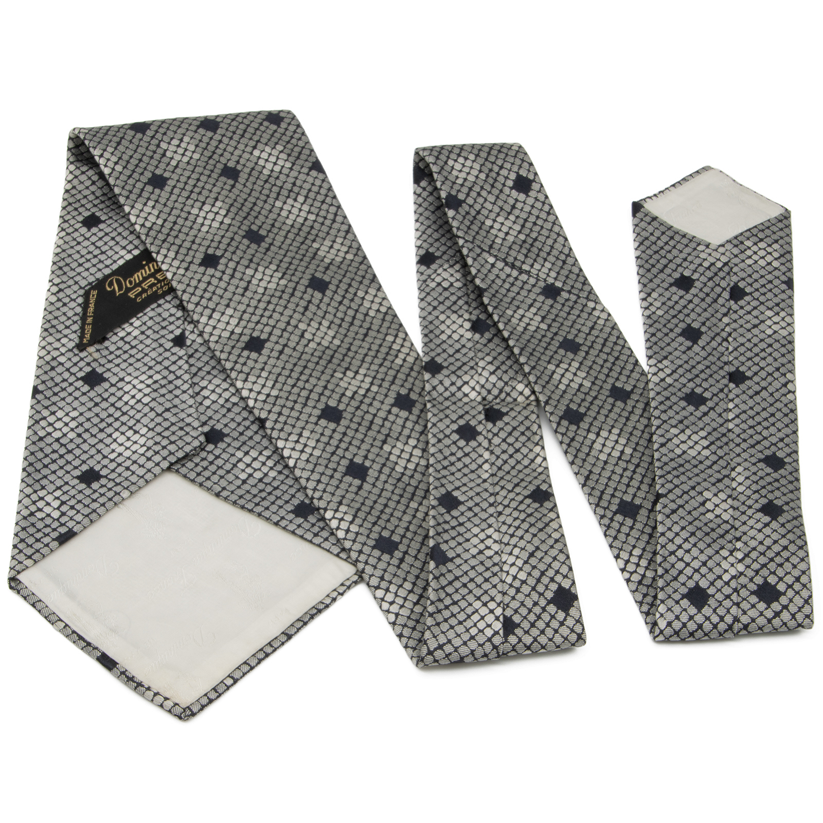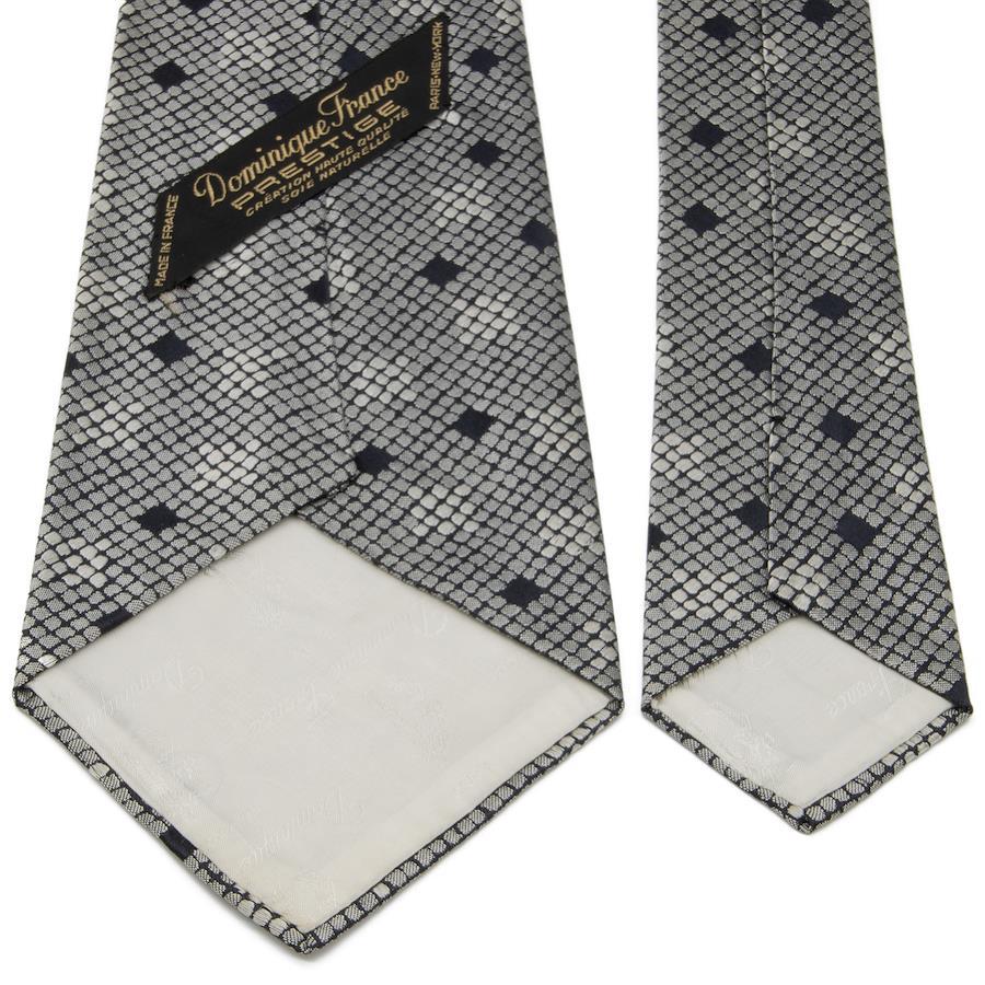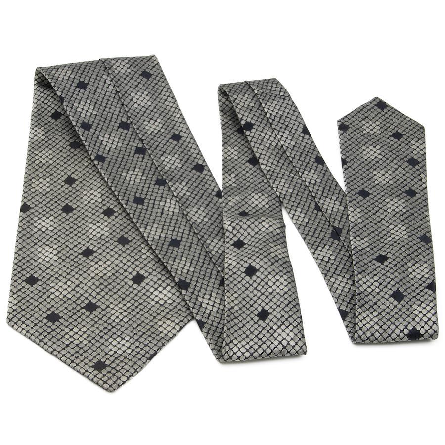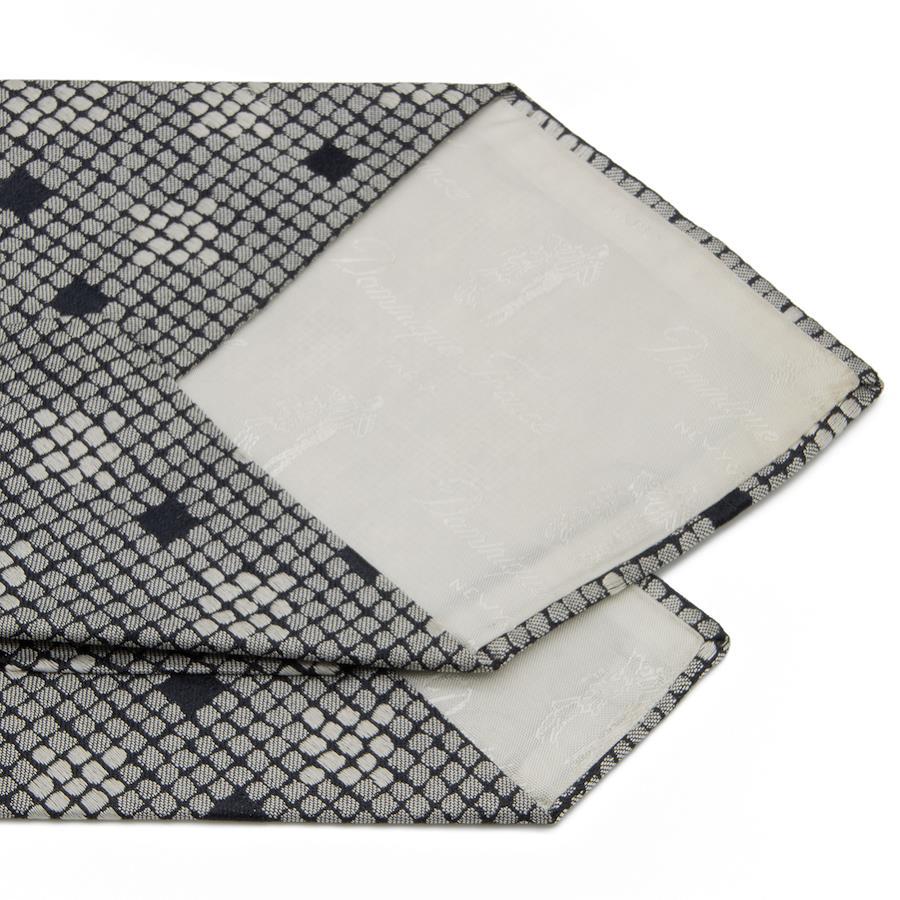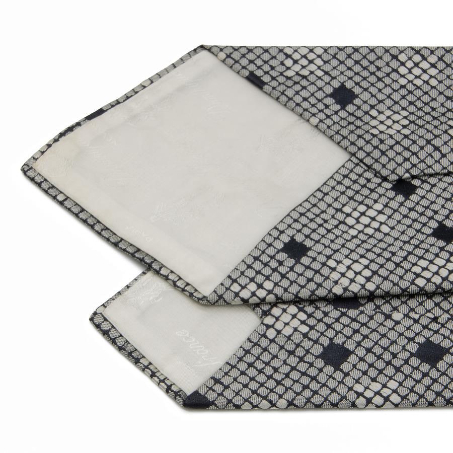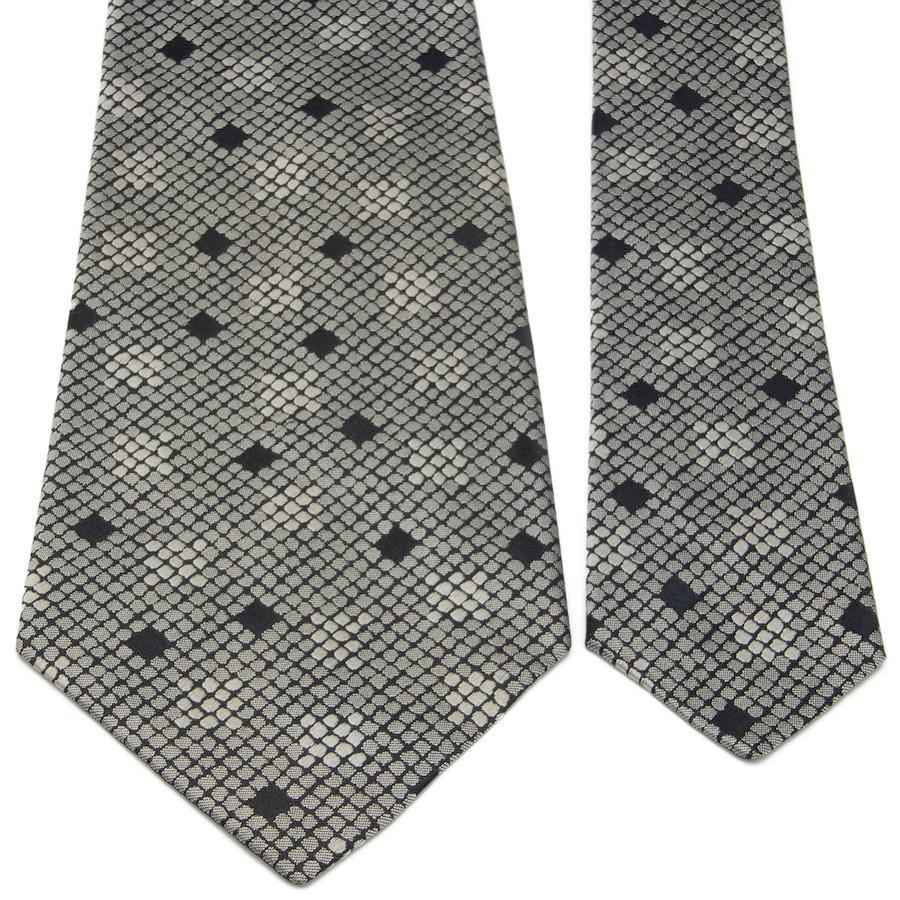 こちらのネクタイは、シルバー系を基調とした中にブラック系のひし形やスクエアが規則的に配された、オールオーバーのジャガード柄が特徴でございます。