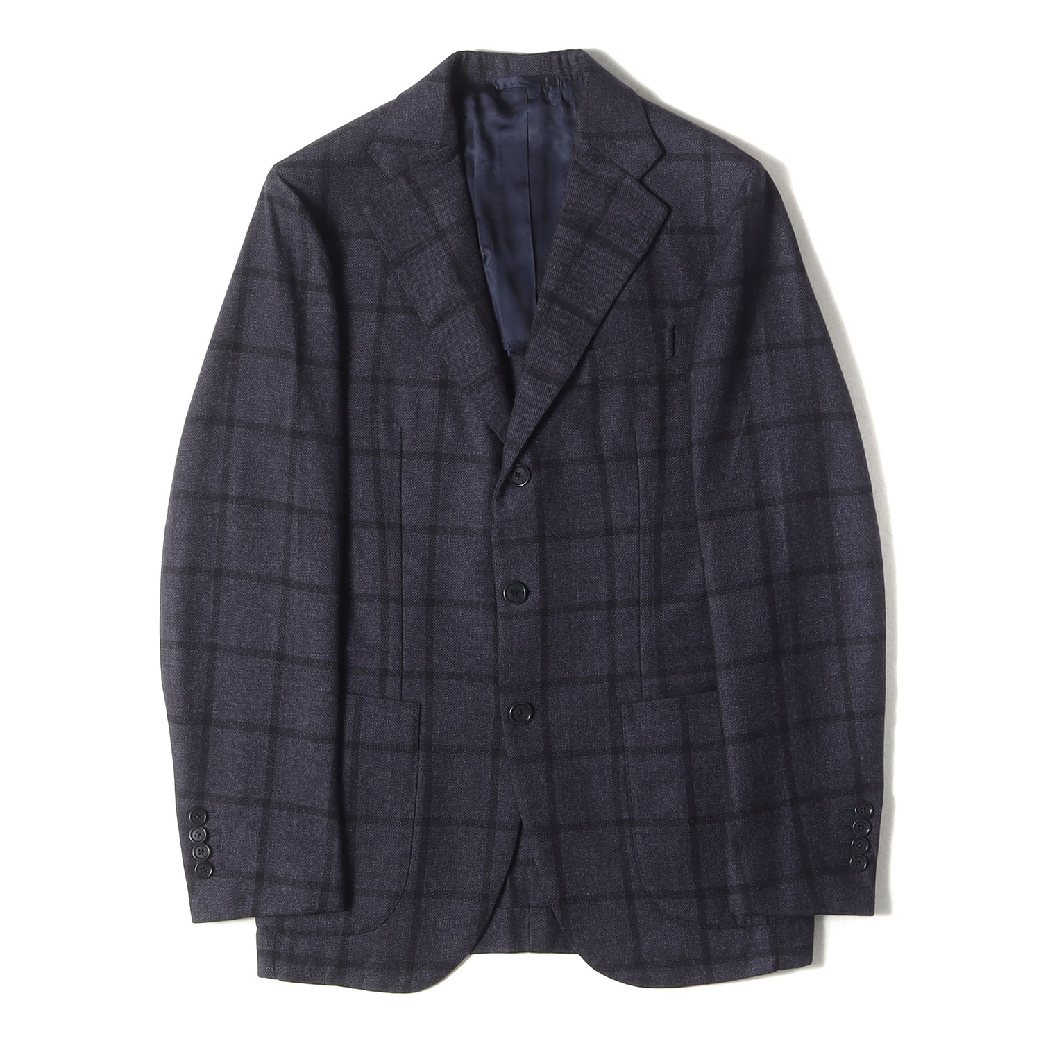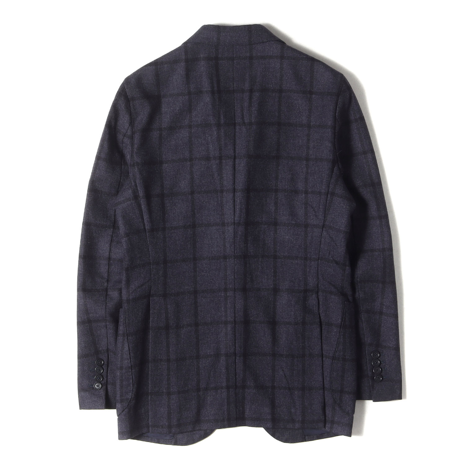 商品説明ウインドーペンチェック柄があしらわれたウール生地を使用し、フロント段返り3つボタン、背抜き裏地、袖先本切羽4つボタン、フロントダーツ、サイドベンツ仕様で仕上げられた3Bテーラードジャケットです。