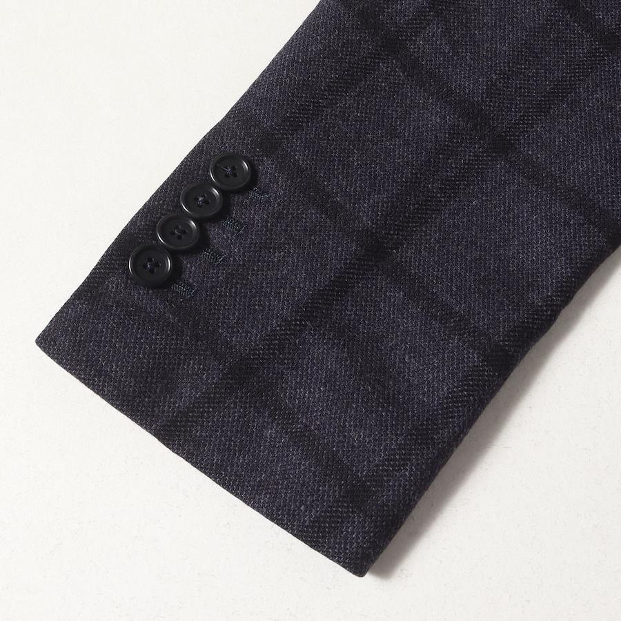 ウインドーペンチェック柄があしらわれたウール生地を使用し、フロント段返り3つボタン、背抜き裏地、袖先本切羽4つボタン、フロントダーツ、サイドベンツ仕様で仕上げられた3Bテーラードジャケットです。