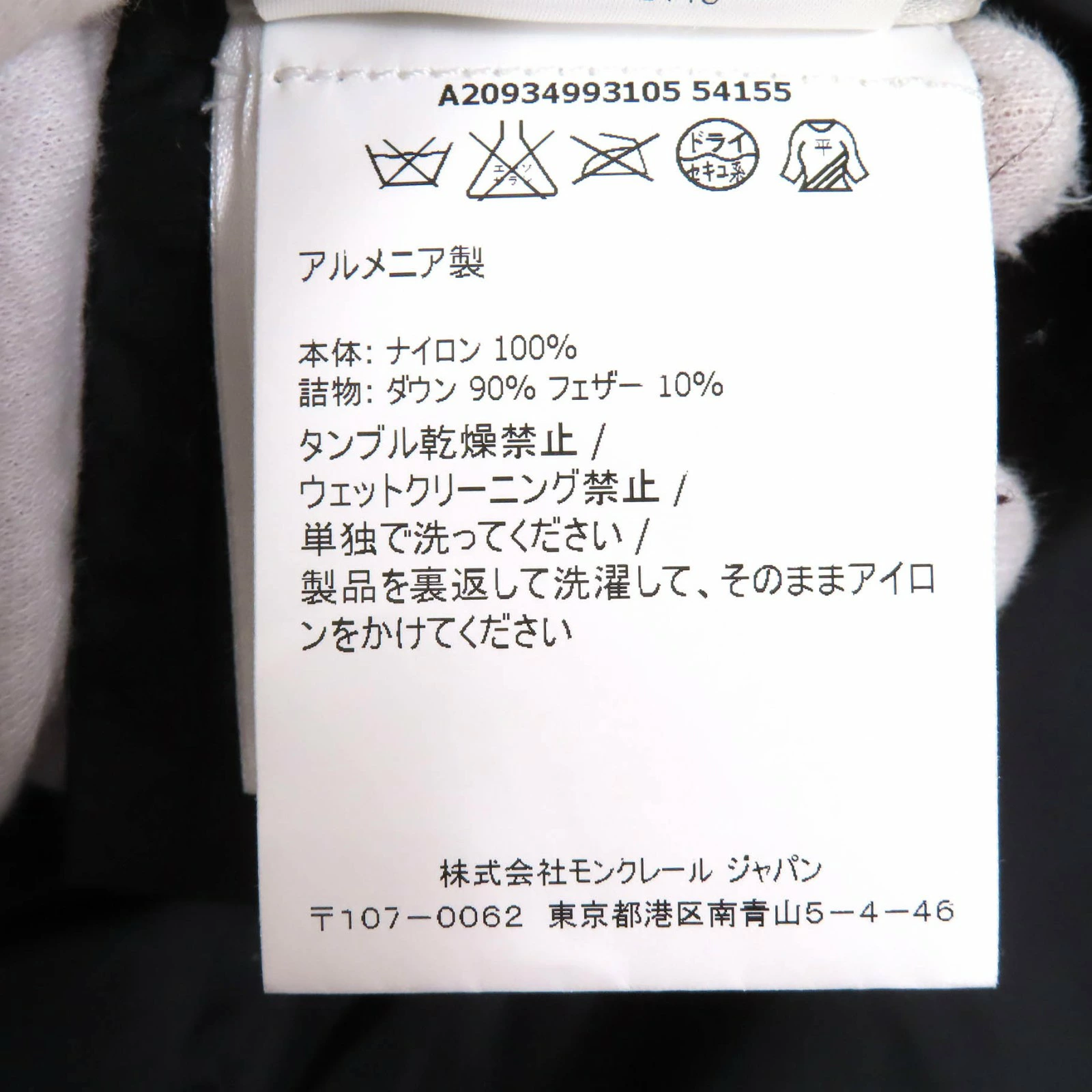 | 素材 (material) | 表地:ナイロン100% 裏地:ナイロン100% 一部:ナイロン100% :ナイロン100% 中綿:ダウン90% :フェザー10% | ||||||||||||||||
