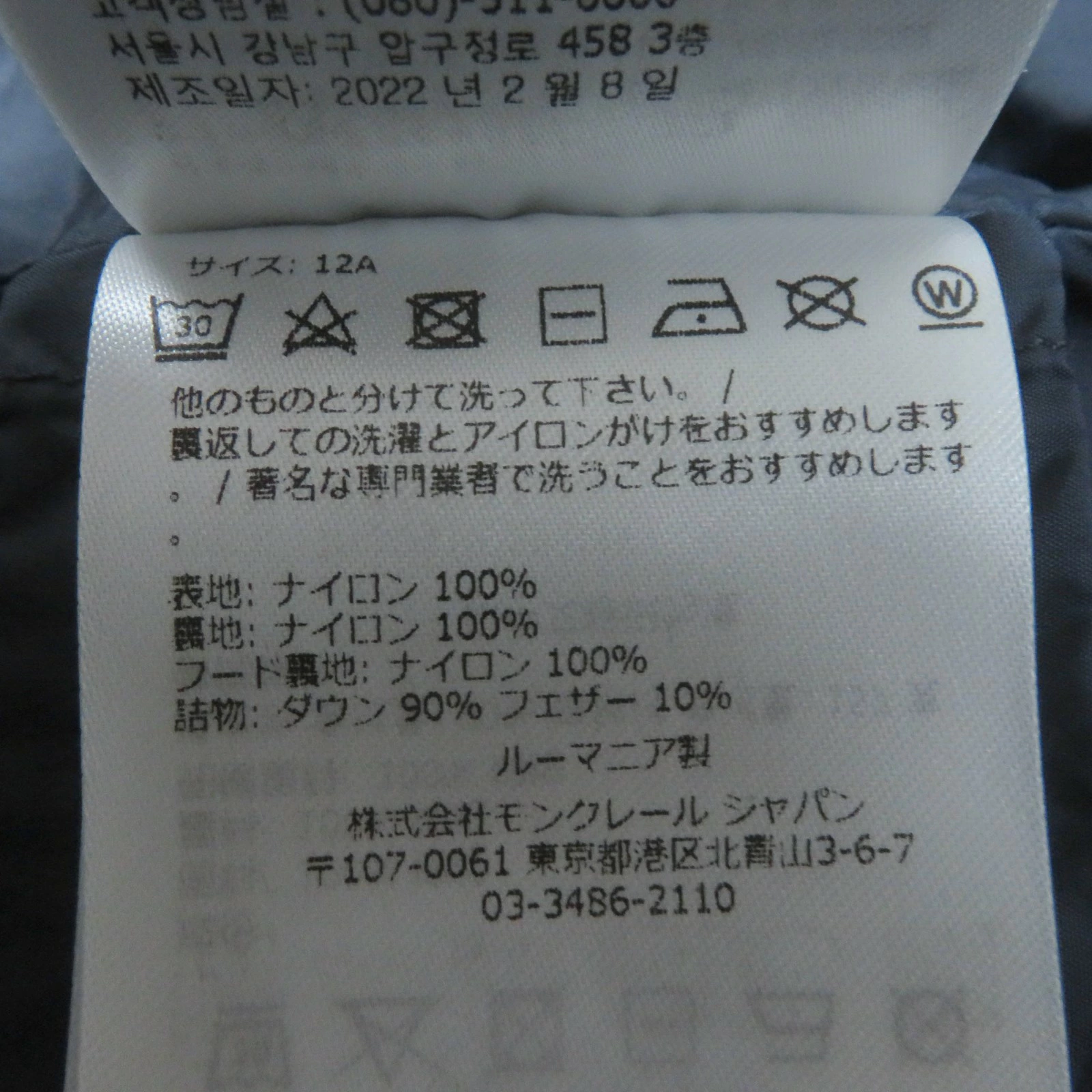 | 素材 (material) | 本体:ナイロン100% 裏地:ナイロン100% 一部:ナイロン100% 中綿:ダウン90% :フェザー10% | ||||||||||||||||