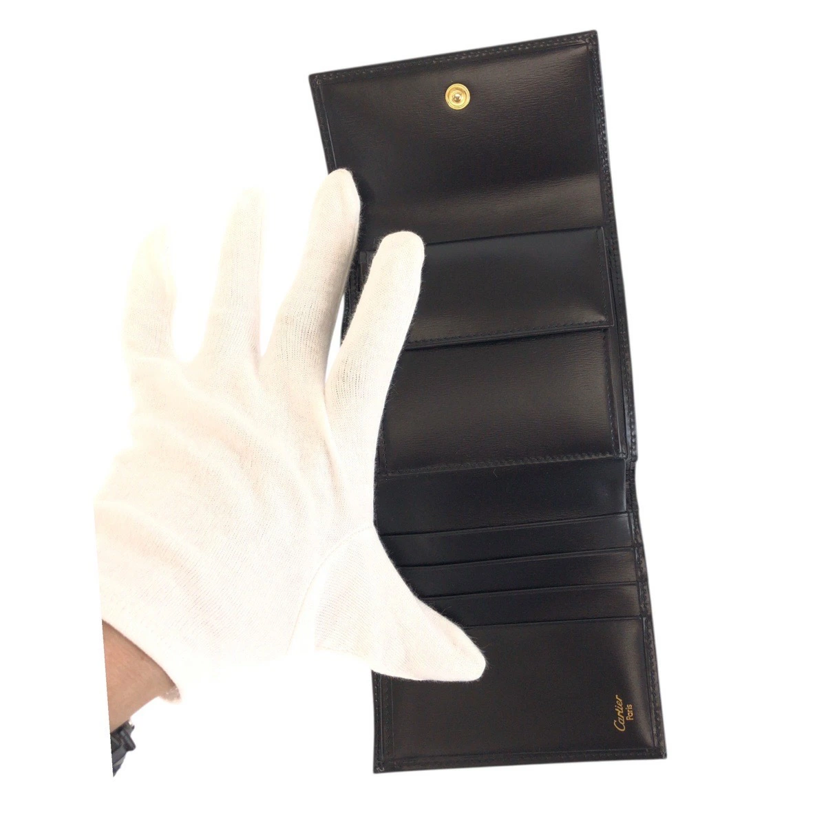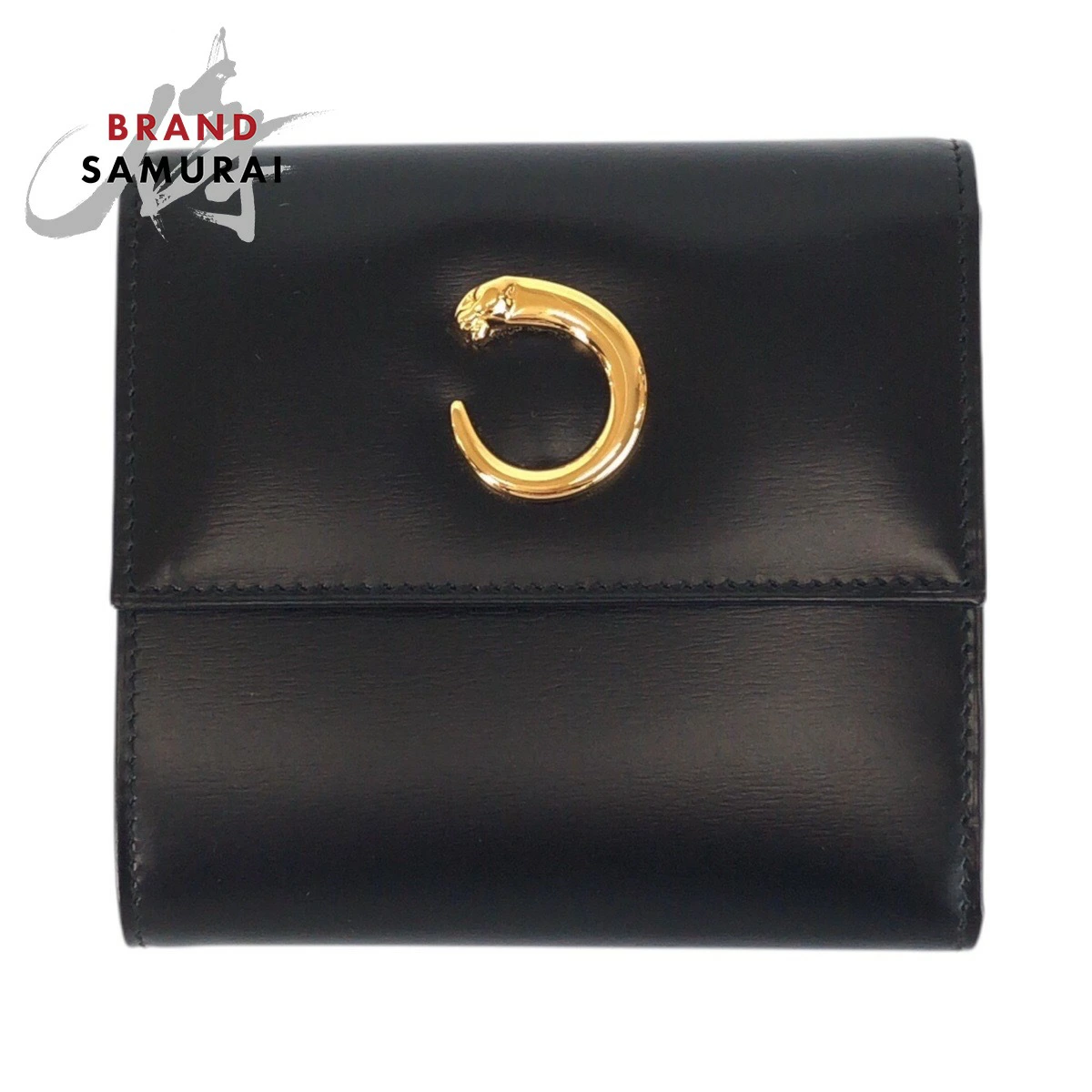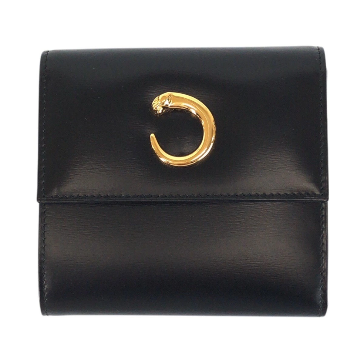 Excellent condition CARTIER Panther black calfskin tri-fold wallet with gold hardware. Compact wallet for women. 505163. [Pre-owned]
