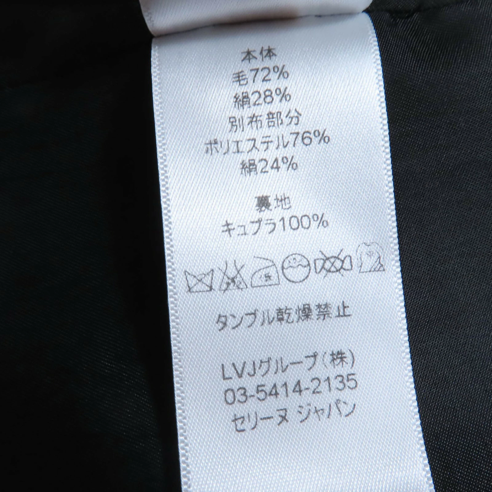 | 素材 (material) | 本体:ウール72% :シルク28% 一部:ポリエステル76% :シルク24% 裏地:キュプラ100% | ||||||||||||||||