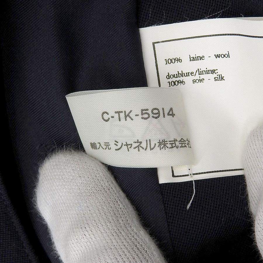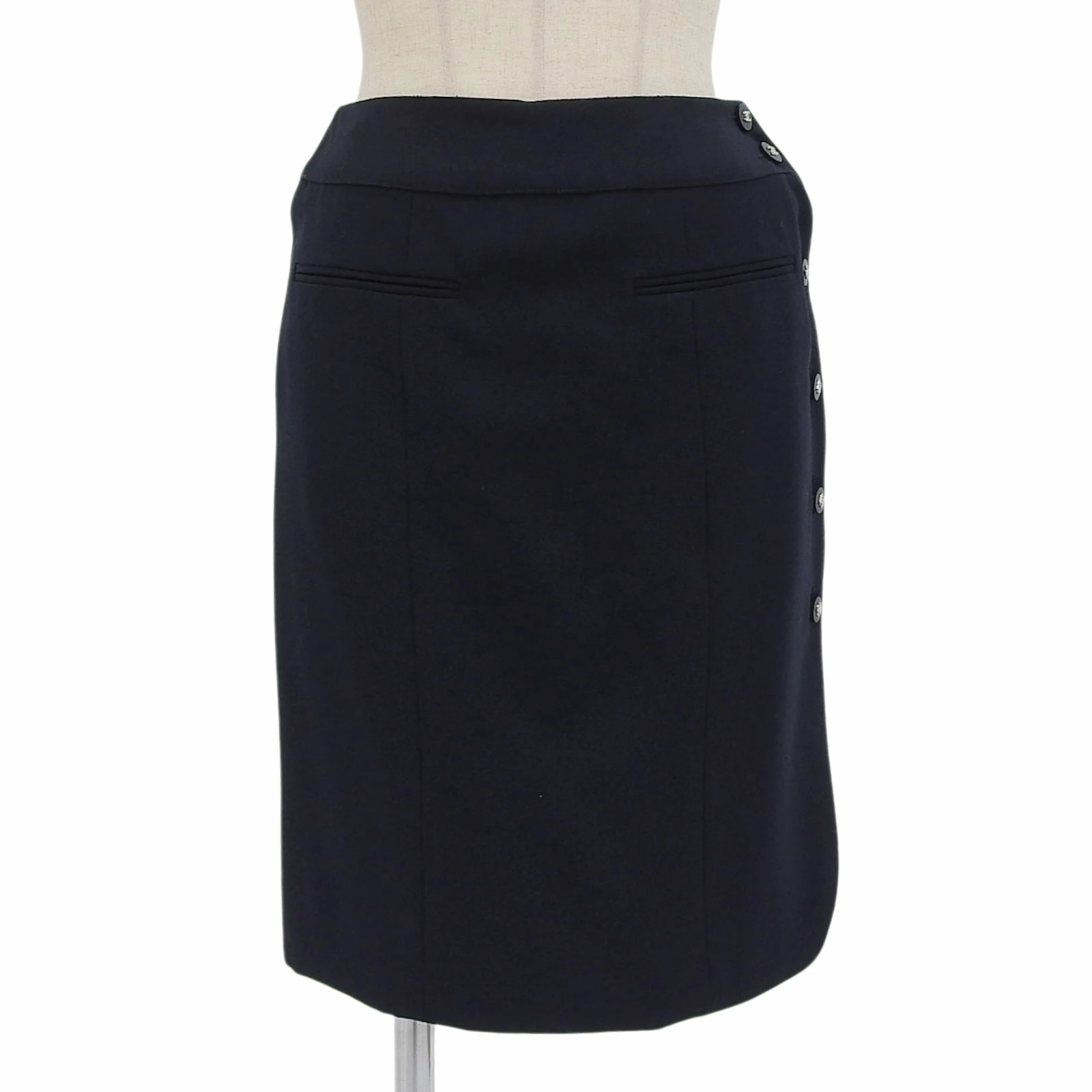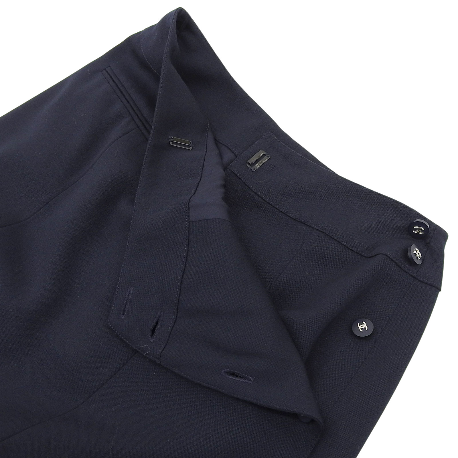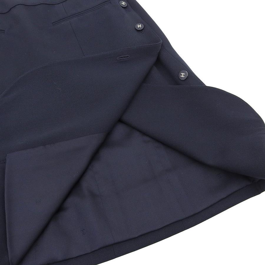 Excellent condition CHANEL 96P P06492 100% wool with 100% silk lining. Knee-length wrap skirt with Coco Mark buttons. Dark navy. Size 36. Made in France. Authentic. Pre-owned.
