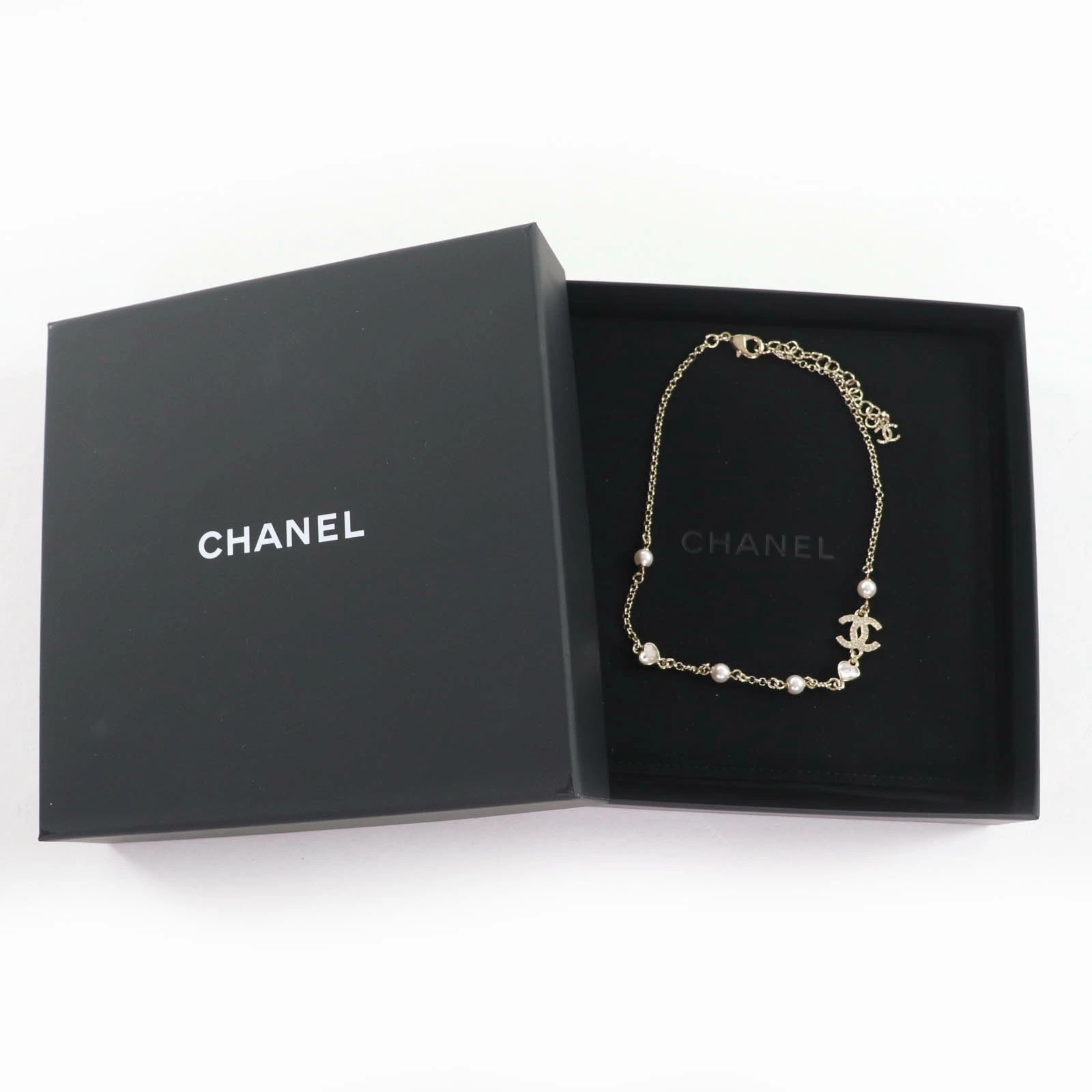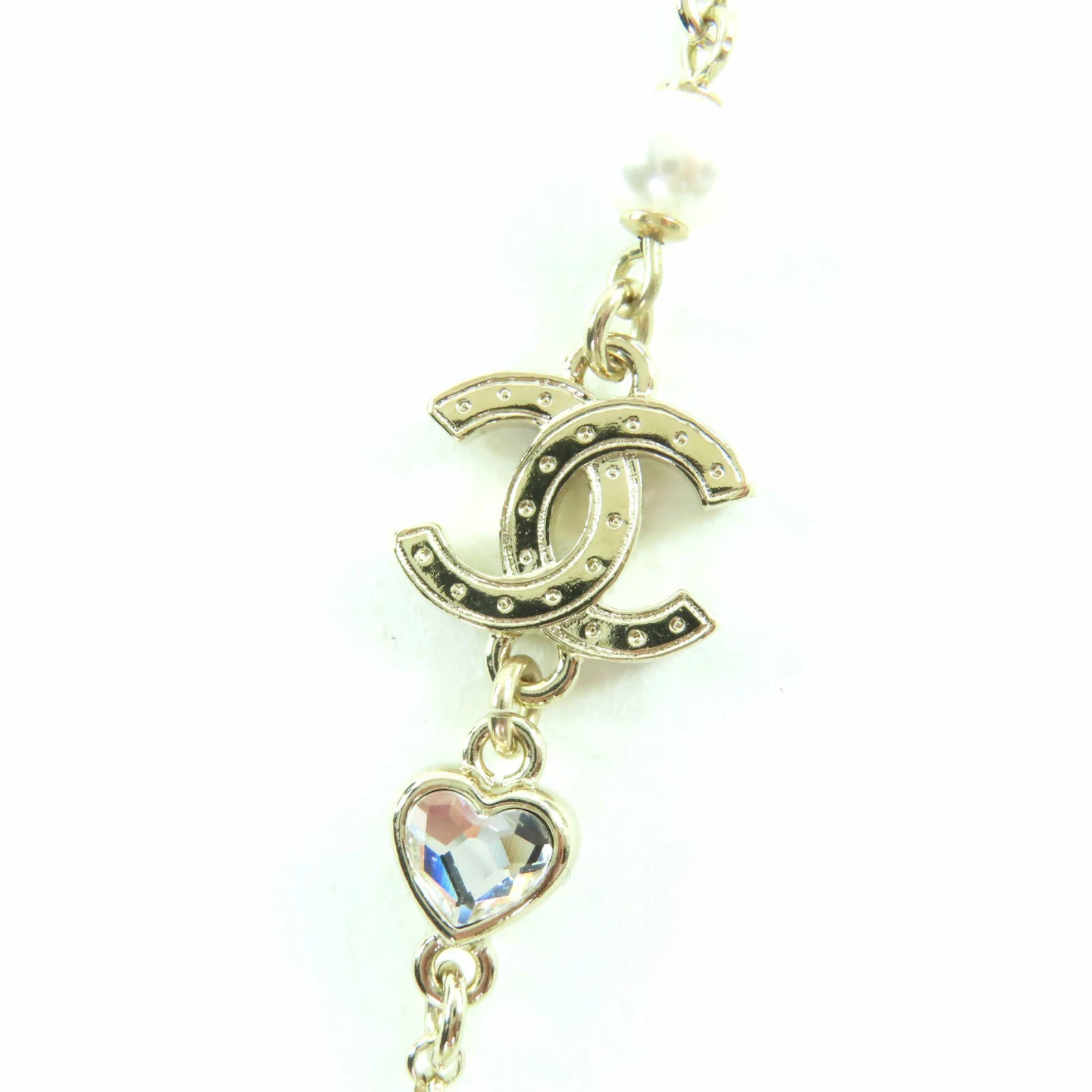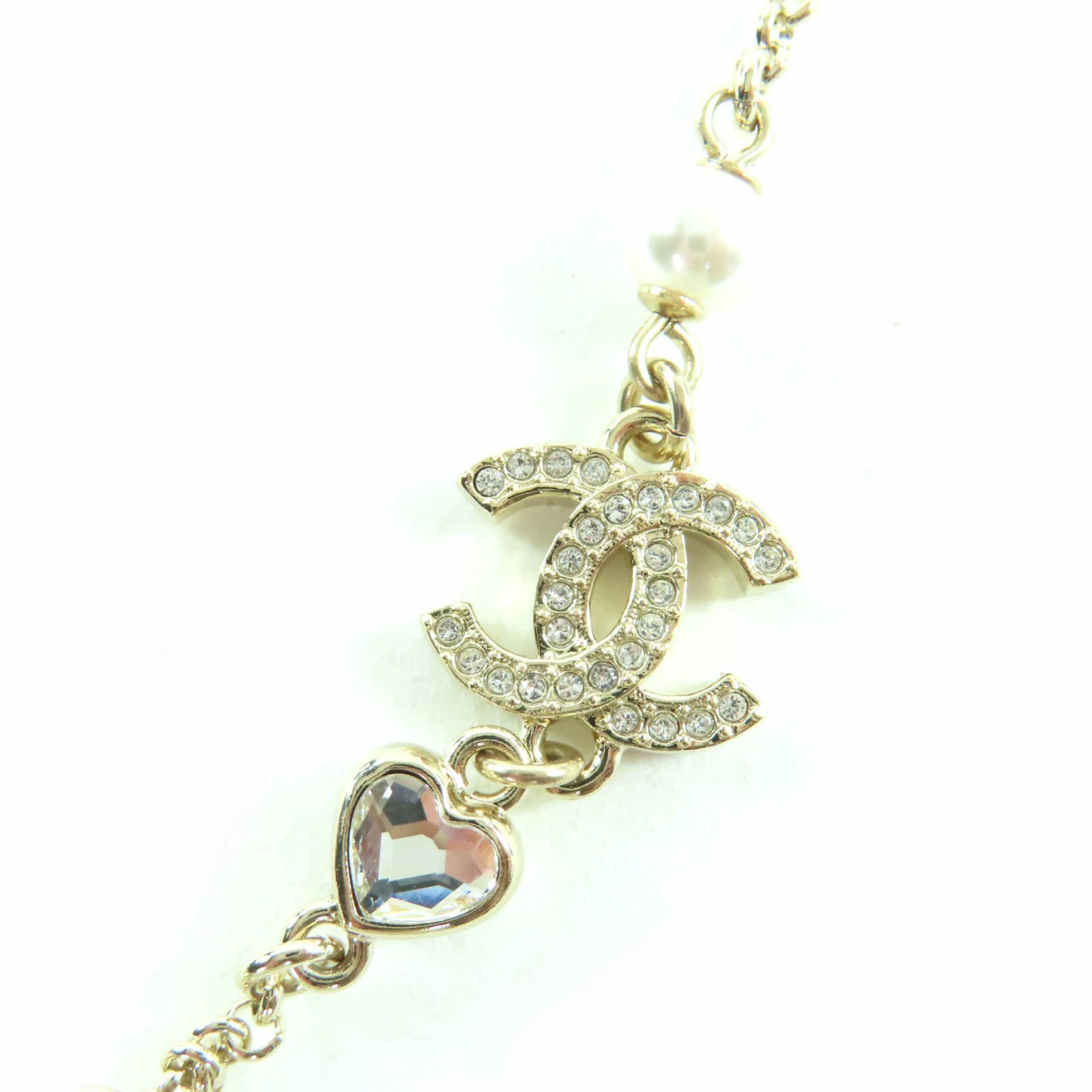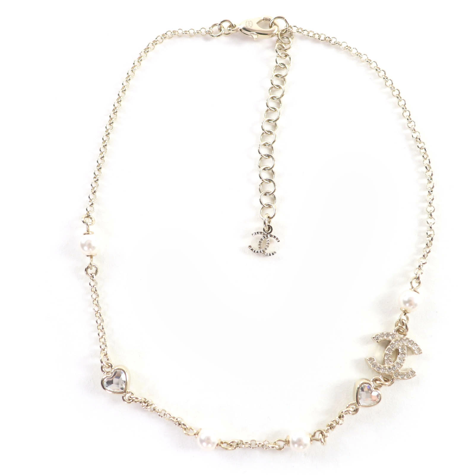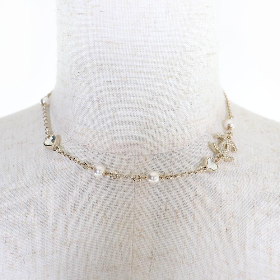 Excellent condition CHANEL B23B metal Coco Mark rhinestone and faux pearl necklace in gold. Comes with box and dust bag. Made in Italy. Pre-owned.