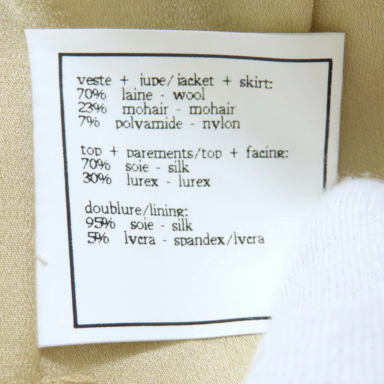 | 素材 (material) | 表地:ウール70% :モヘア23% :ポリアミド7% 裏地:シルク95% :スパンデックス5% | ||||||||||||||||
