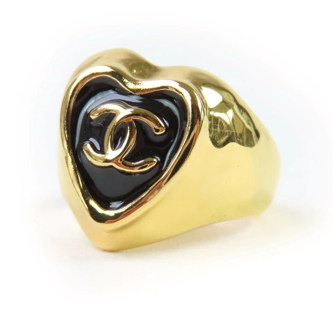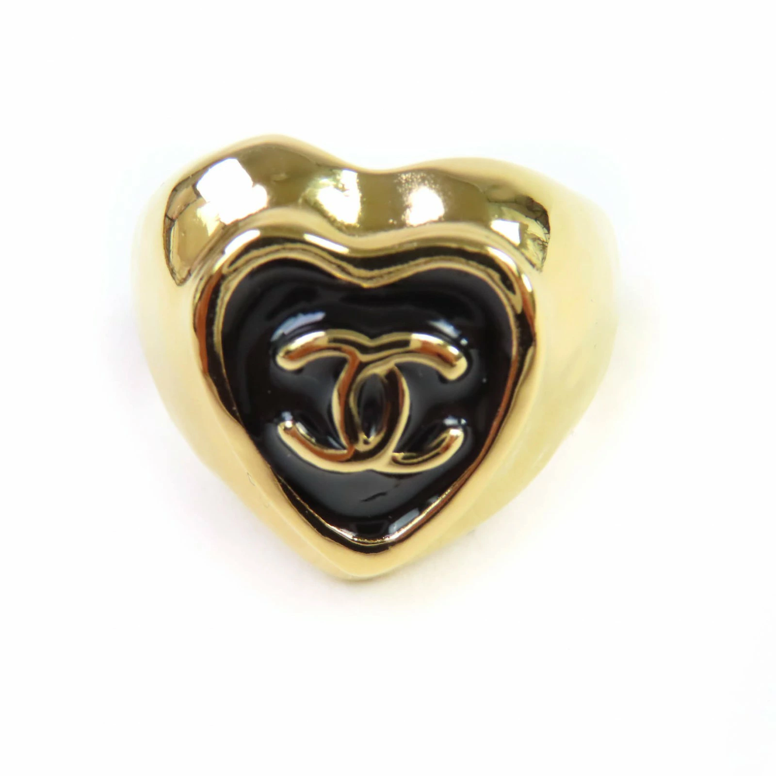 Excellent condition CHANEL L25A Coco Mark Heart Ring in Gold and Black, Japanese size 11, with box and case, Made in France, Women's [Pre-owned]