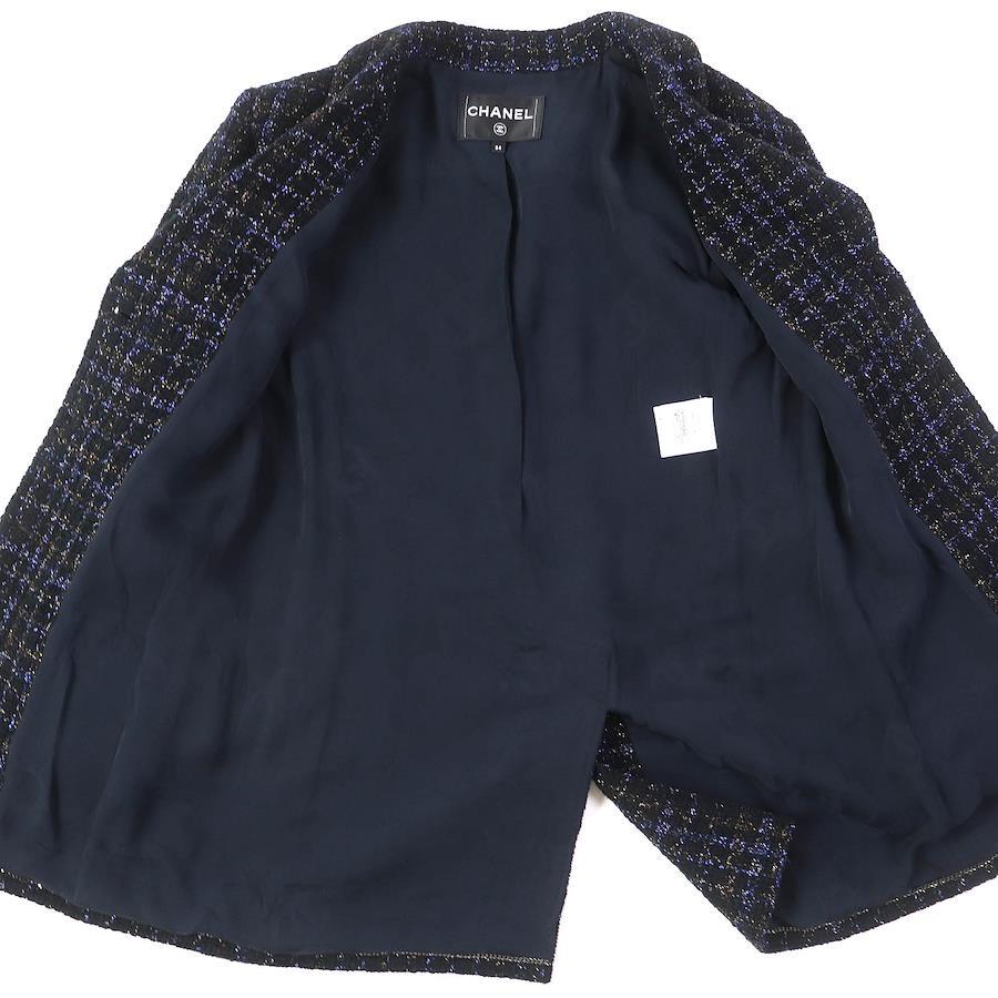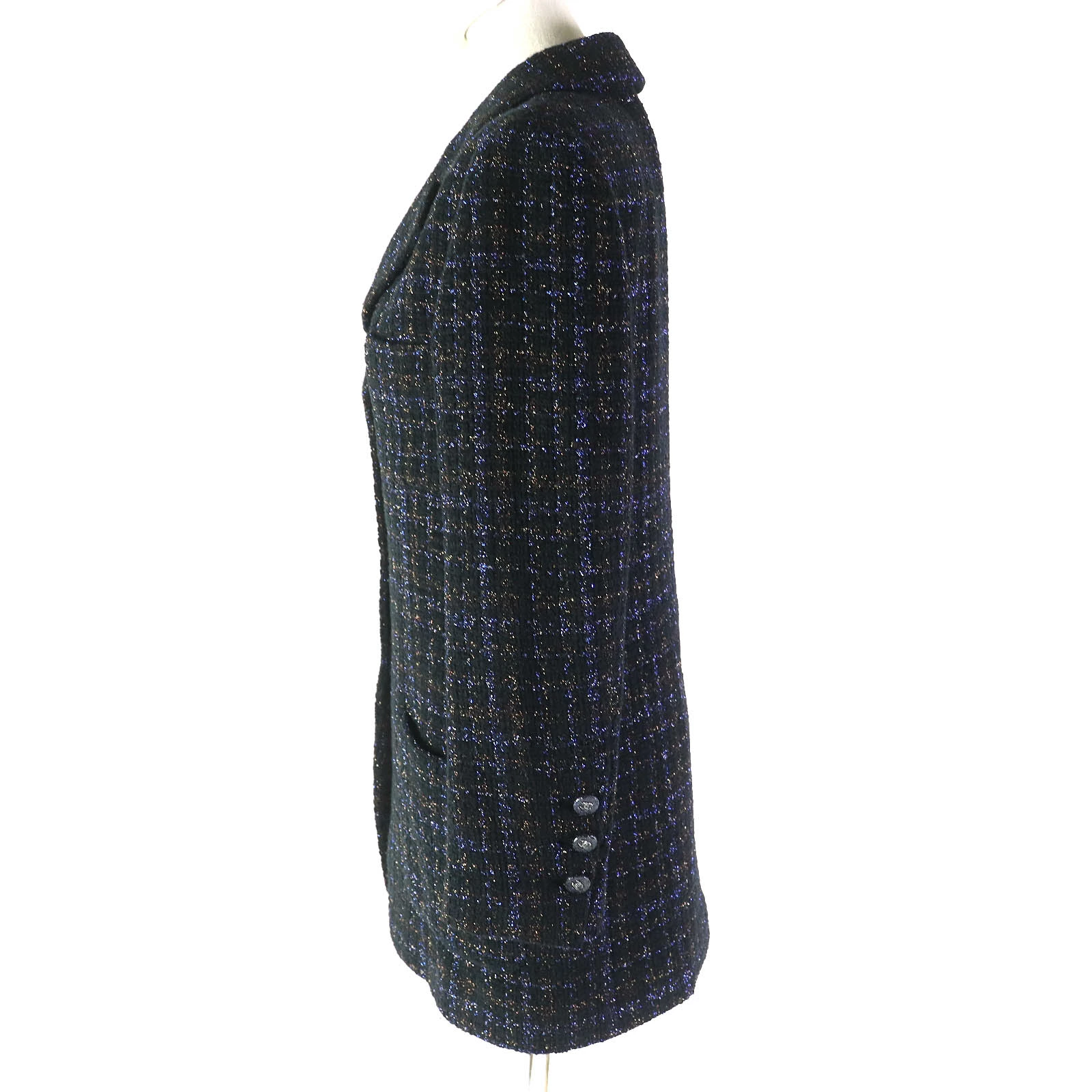 Excellent condition CHANEL P71761 long tailored jacket in black, size 34, made in France, made of cotton and wool with a 100% silk lining, featuring rhinestone Coco buttons and colored lamé tweed. Authentic. Recommended for women. [Pre-owned]