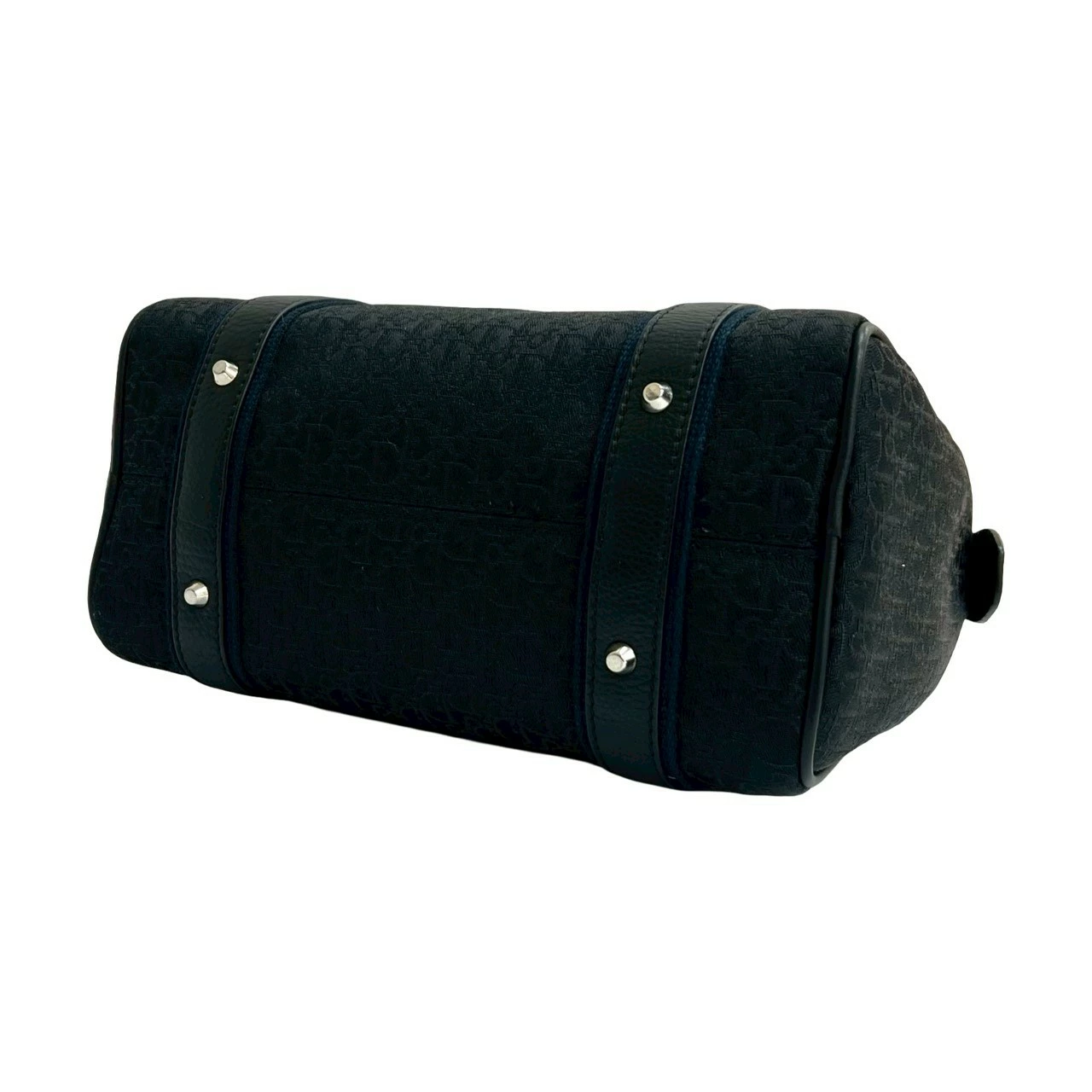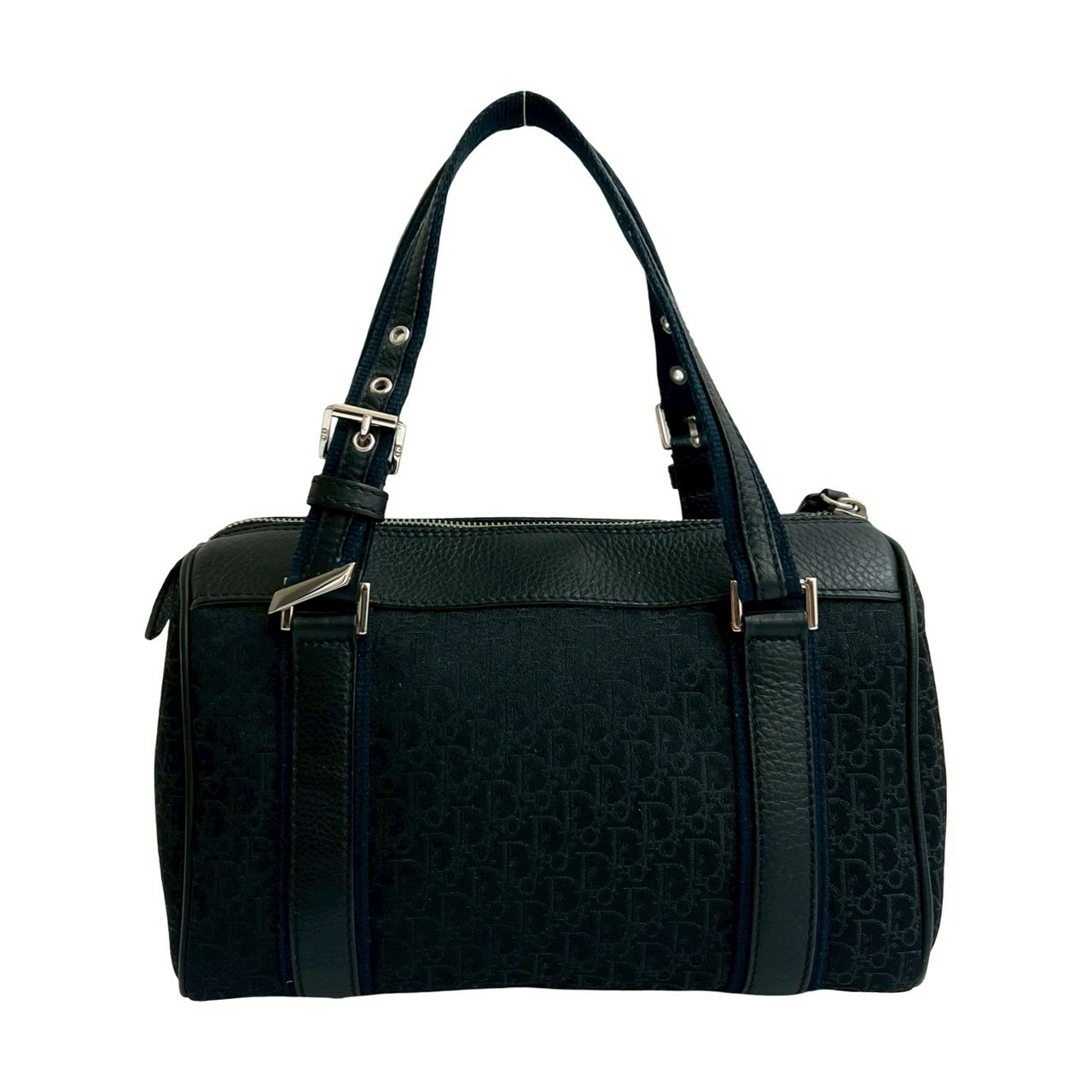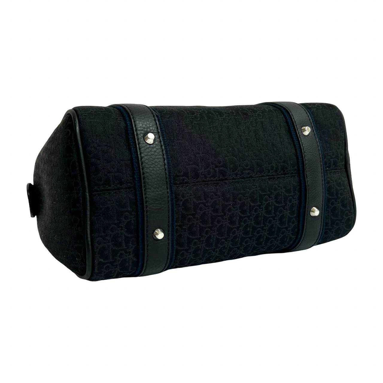 Excellent condition Christian Dior Trotter pattern canvas and leather handbag/mini Boston bag in black and navy (73180) [pre-owned]