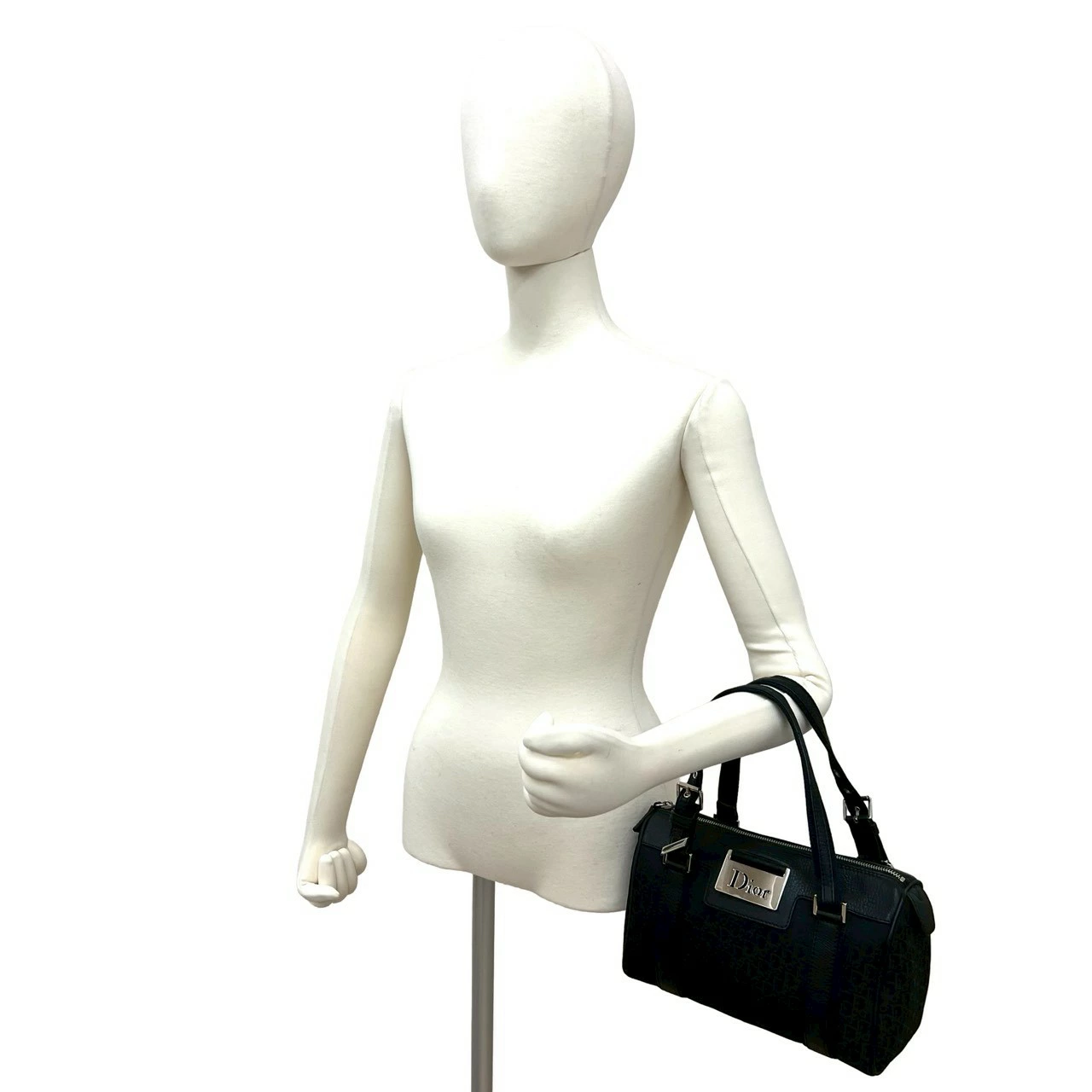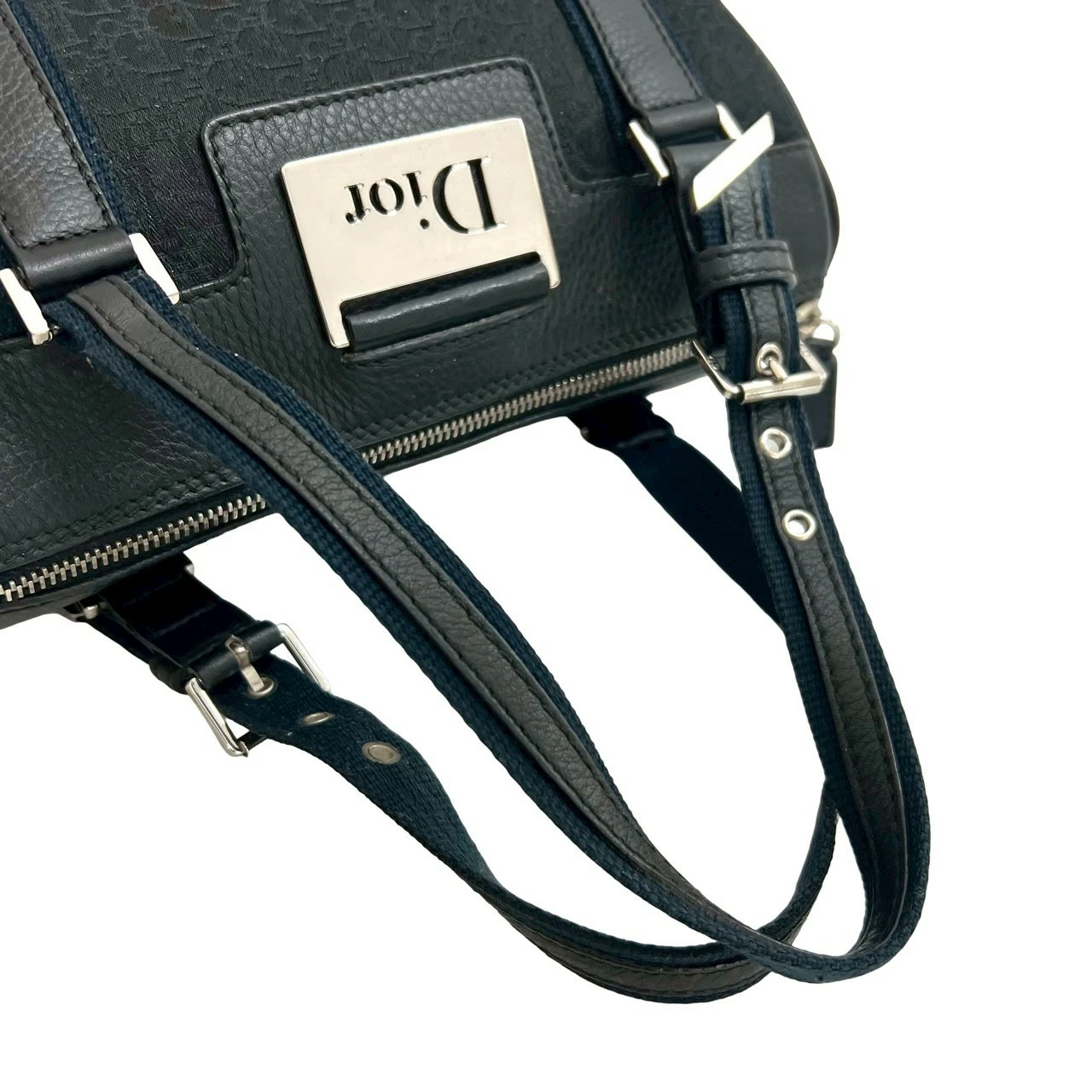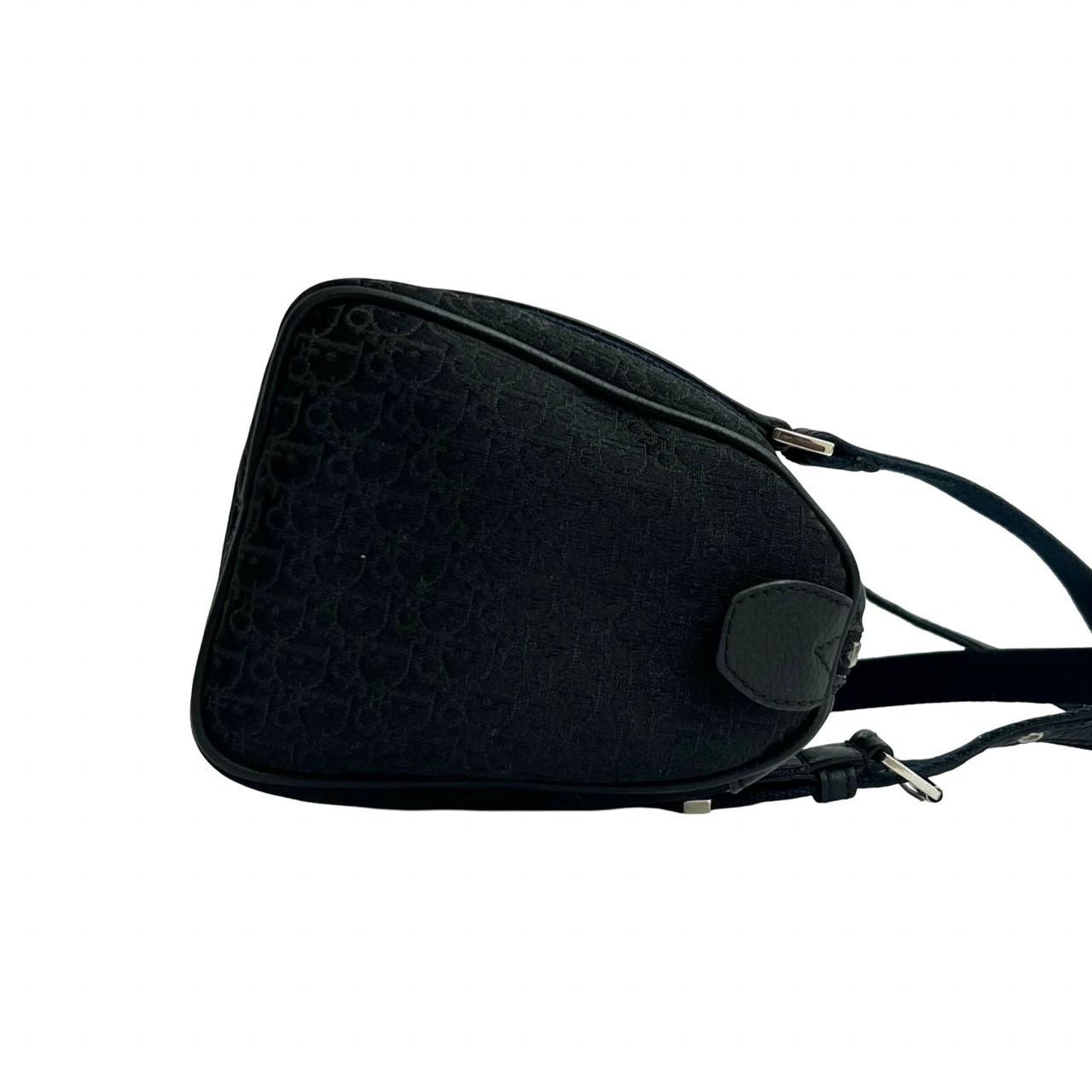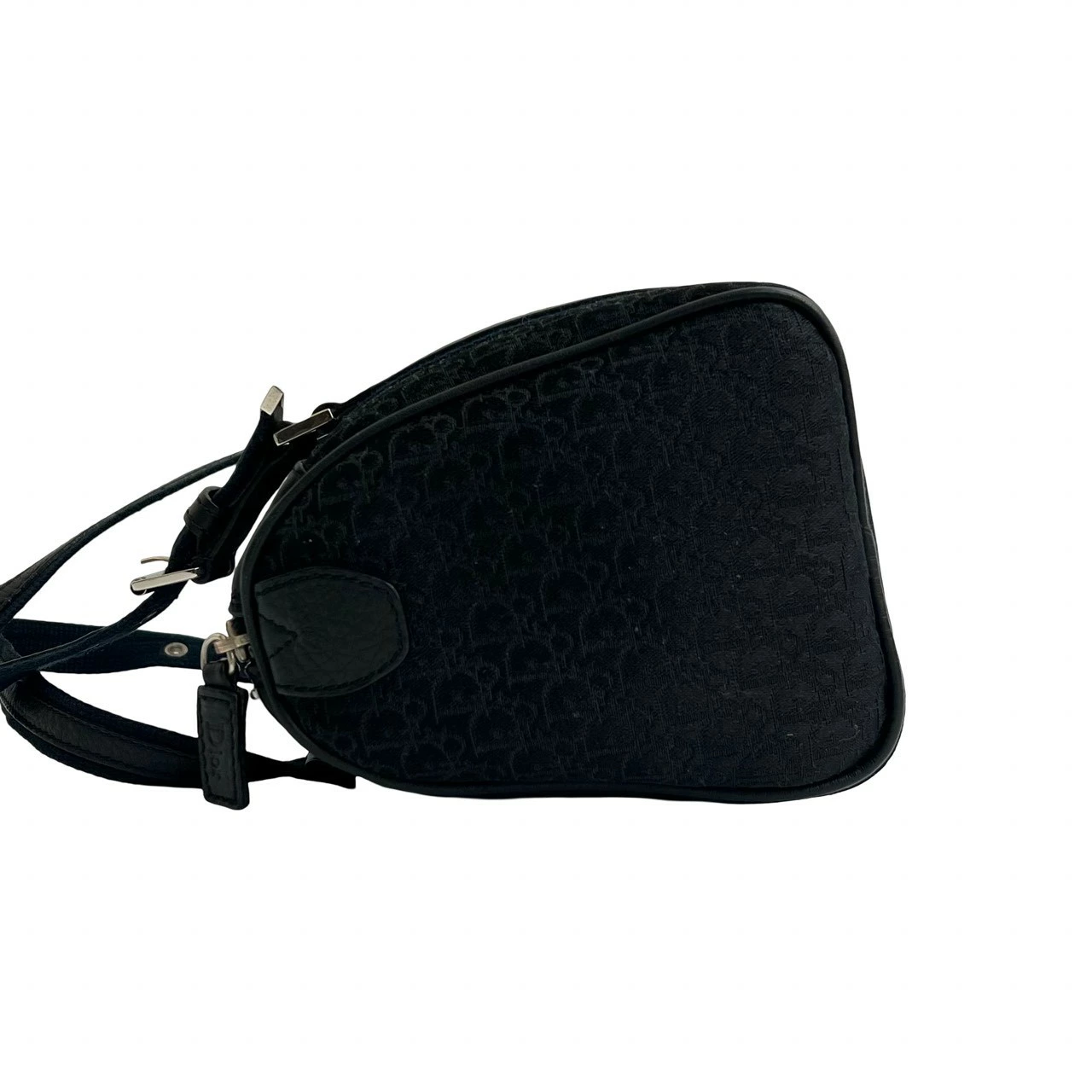 Excellent condition Christian Dior Trotter pattern canvas and leather handbag/mini Boston bag in black and navy (73180) [pre-owned]