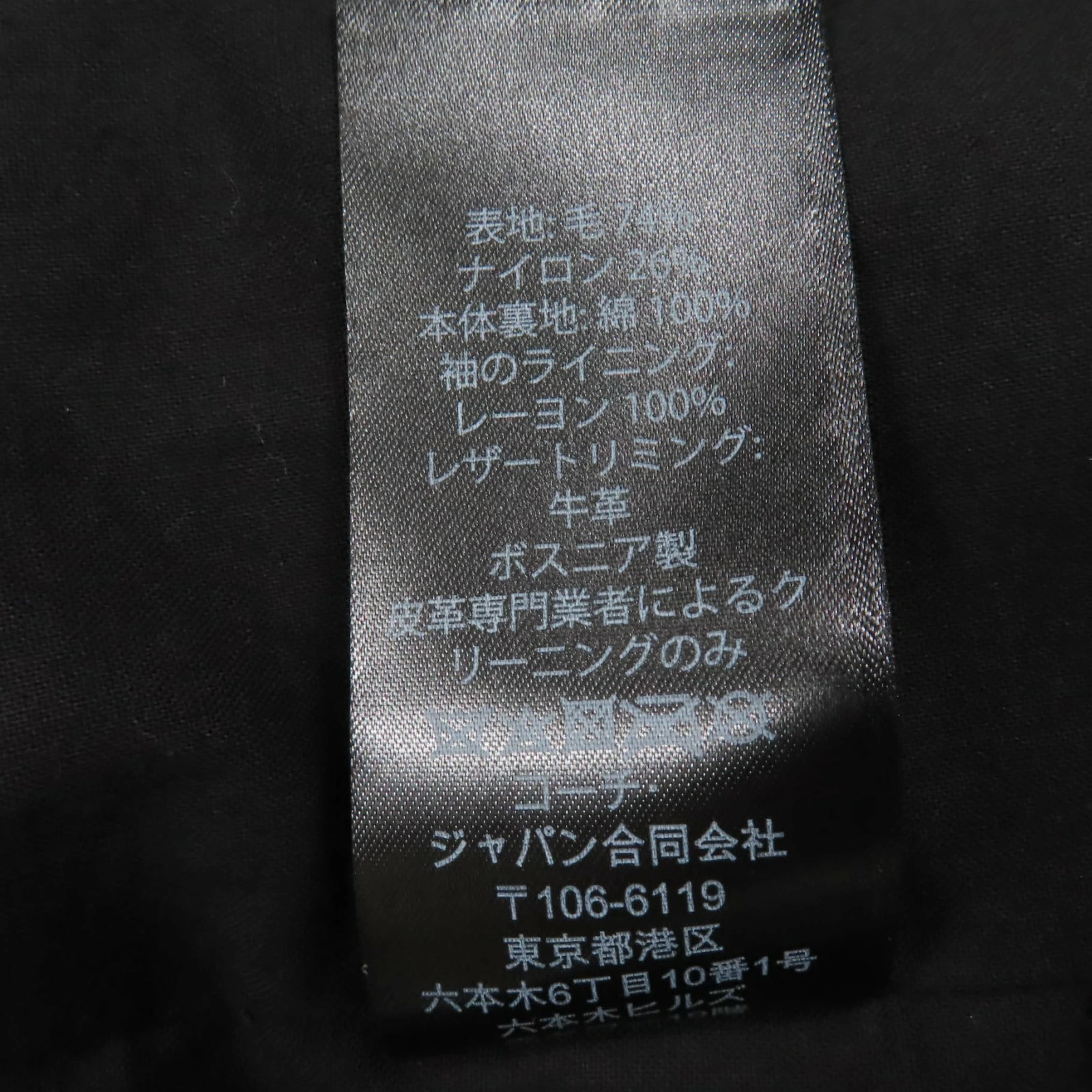 | 素材 (material) | 本体:ウール74% :ナイロン26% 袖裏地:レーヨン100% 裏地:コットン100% 一部:牛革 | ||||||||||||||||