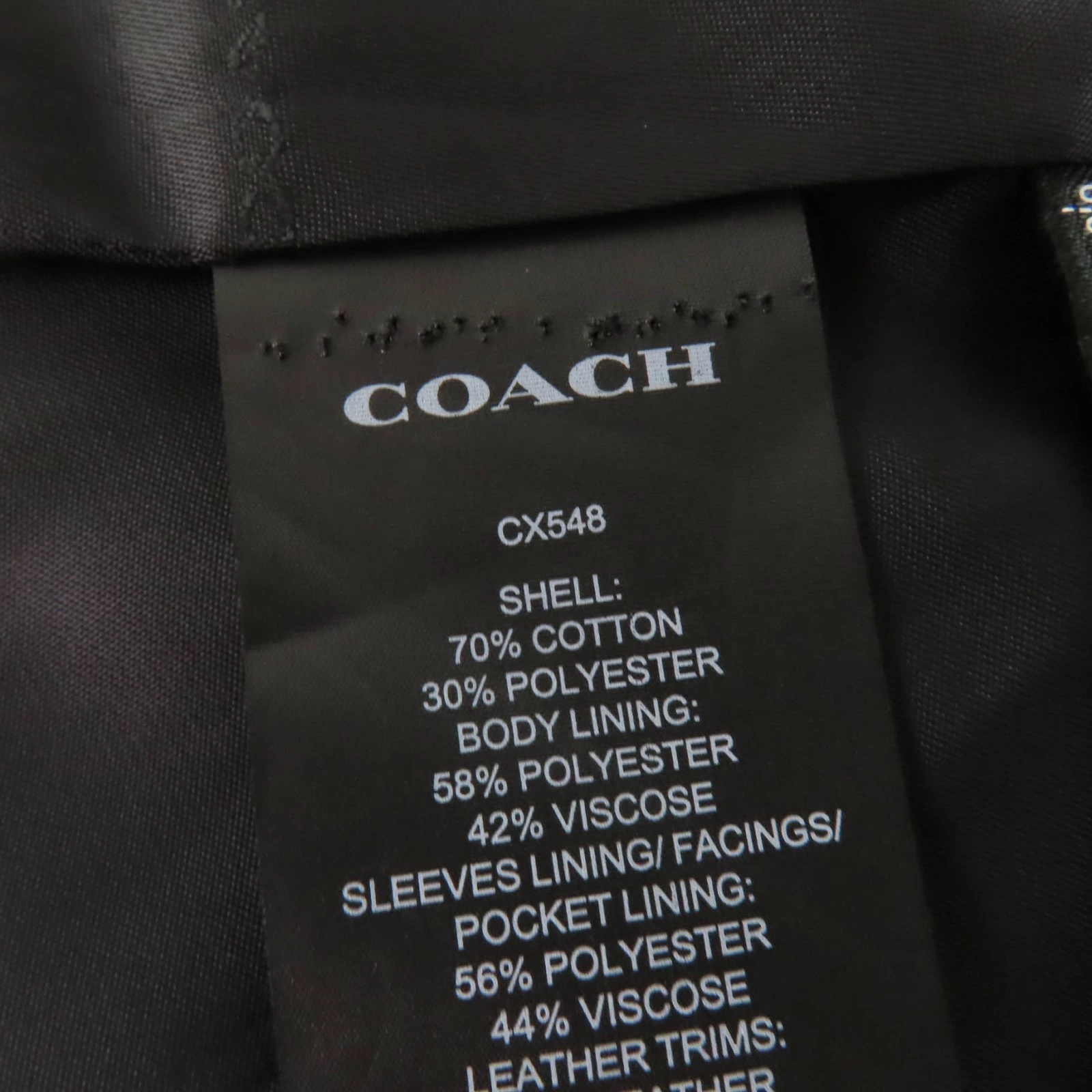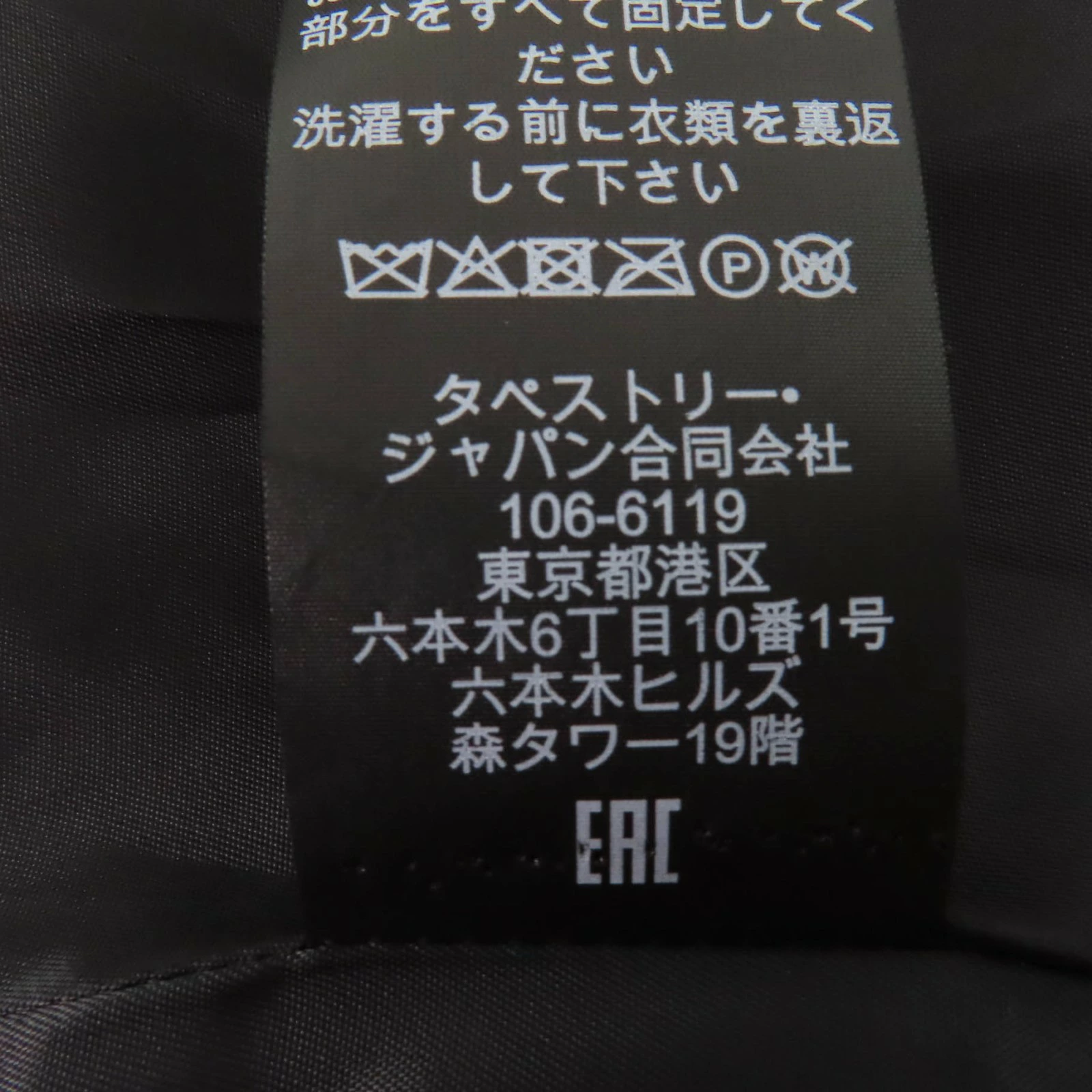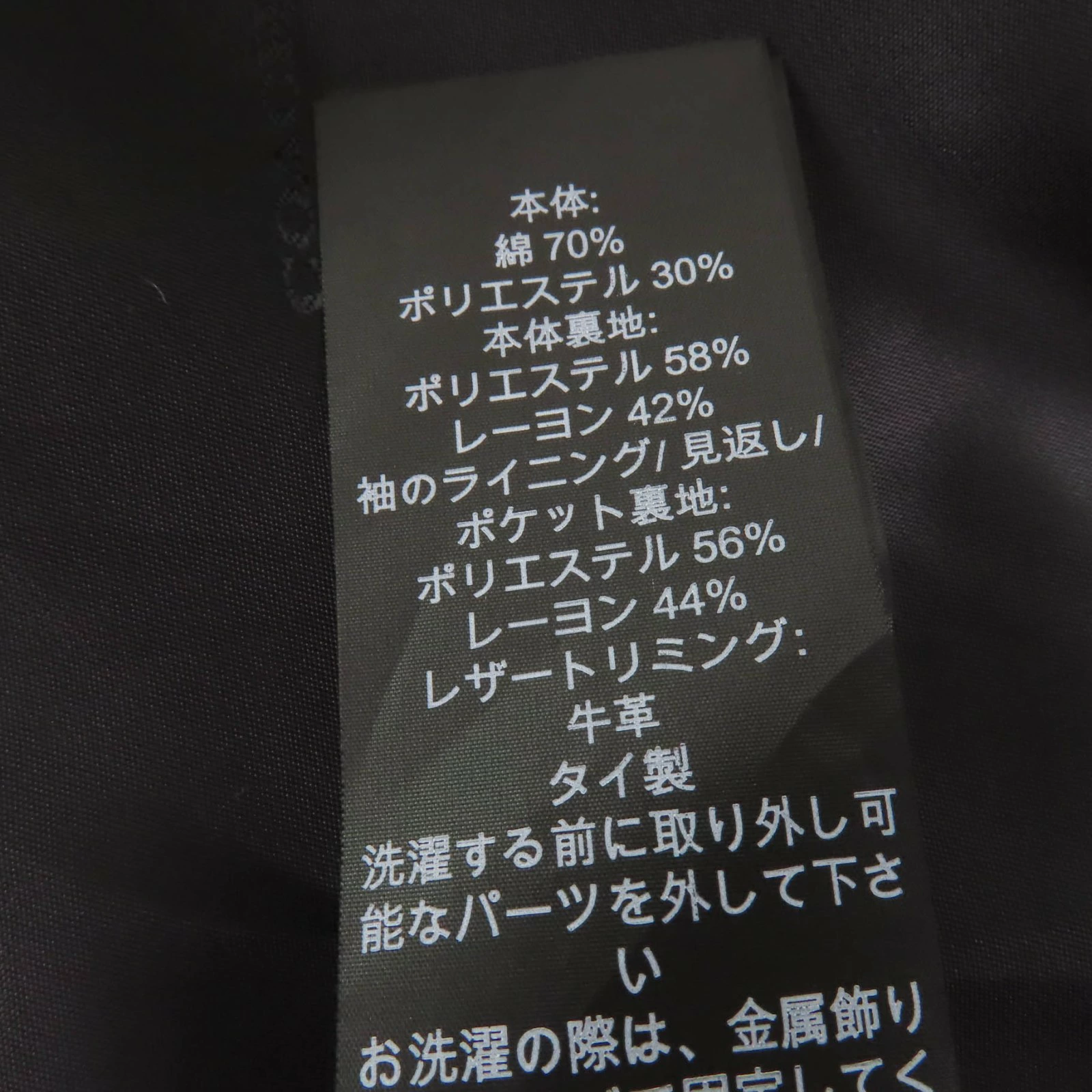 | 素材 (material) | 本体:コットン70% :ポリエステル30% 裏地:ポリエステル58% :レーヨン42% 一部:ポリエステル56% :レーヨン44% 皮革部分:牛革 | ||||||||||||||||