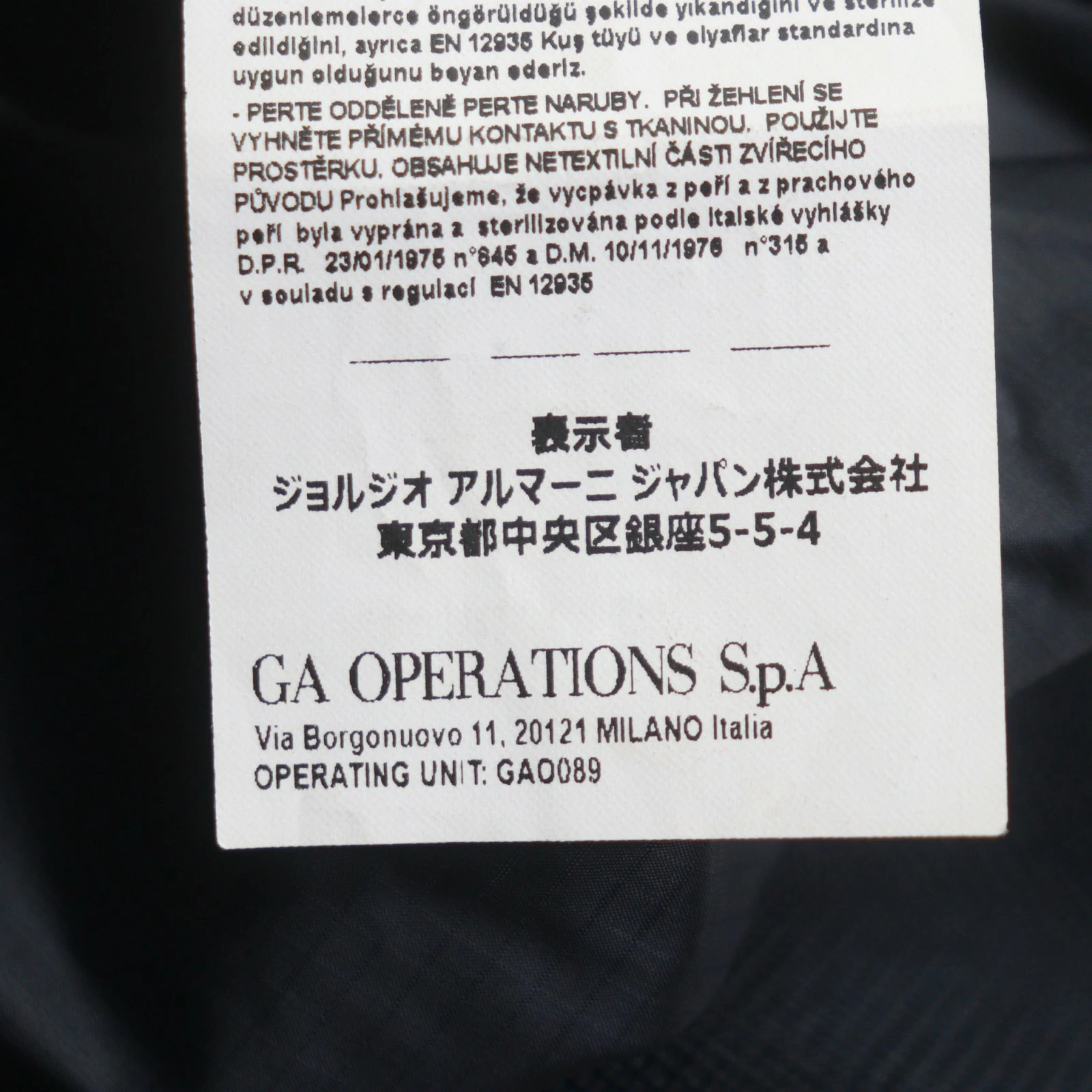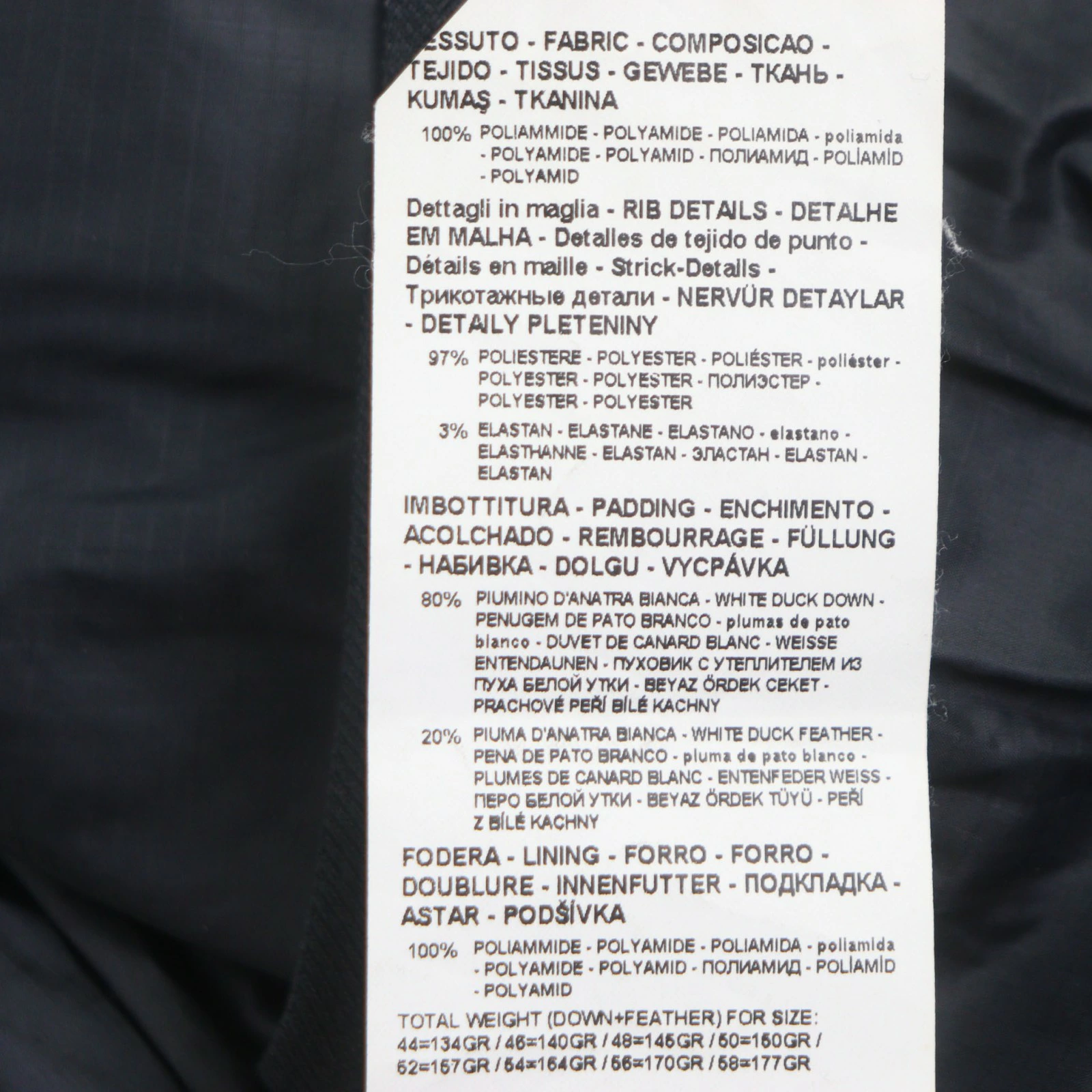 | 素材 (material) | 表地:ポリアミド100% 裏地:ポリエステル97% :エラスタン3% 中綿:ダウン80% :フェザー20% | ||||||||||||||||
