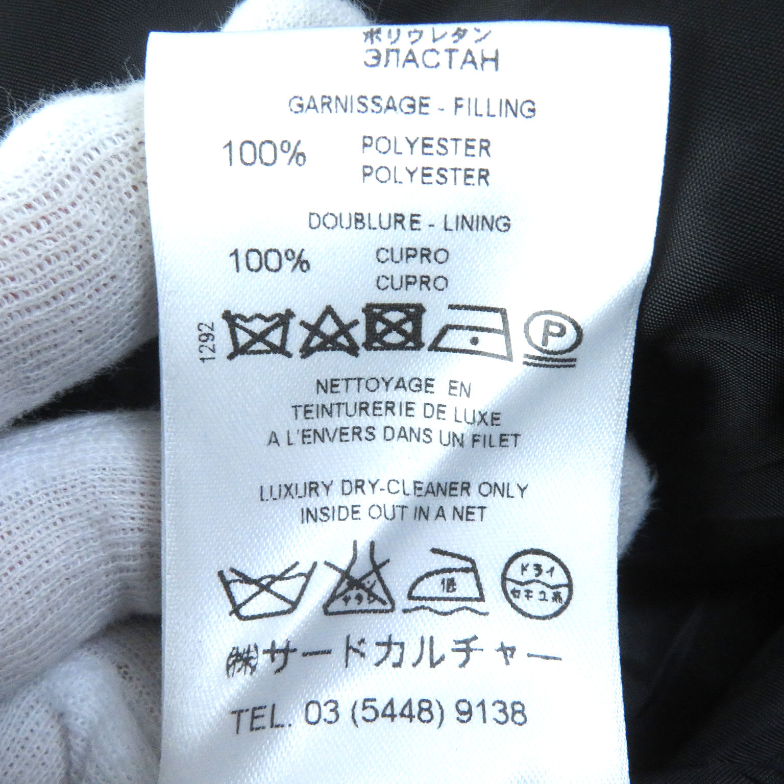 | 素材 (material) | 表地:コットン59% :レーヨン41% 一部:ポリエステル100% 裏地:キュプラ100% 中綿:ポリエステル100% 一部:ウール95% :ナイロン4% :ポリウレタン1% | ||||||||||||||||
