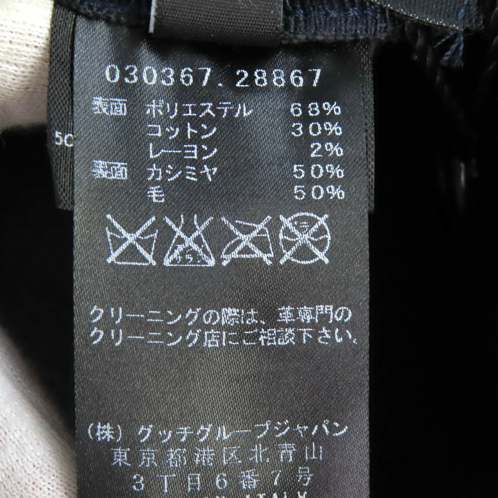 | 素材 (material) | 表地:ポリエステル60% :コットン30% :レーヨン2% 裏地:カシミヤ50% :ウール50% | ||||||||||||||||