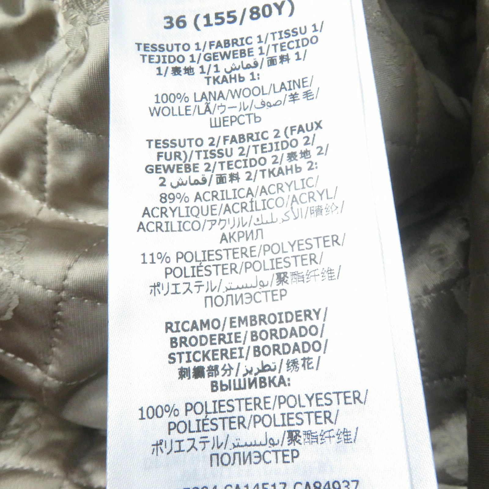 | 素材 (material) | 本体:ウール100% 一部:アクリル89% :ポリエステル11% 中綿:ポリエステル100% 一部:コットン51% :レーヨン49% 皮革部分:牛革 一部:ポリエステル100% 裏地:レーヨン100% | ||||||||||||||||