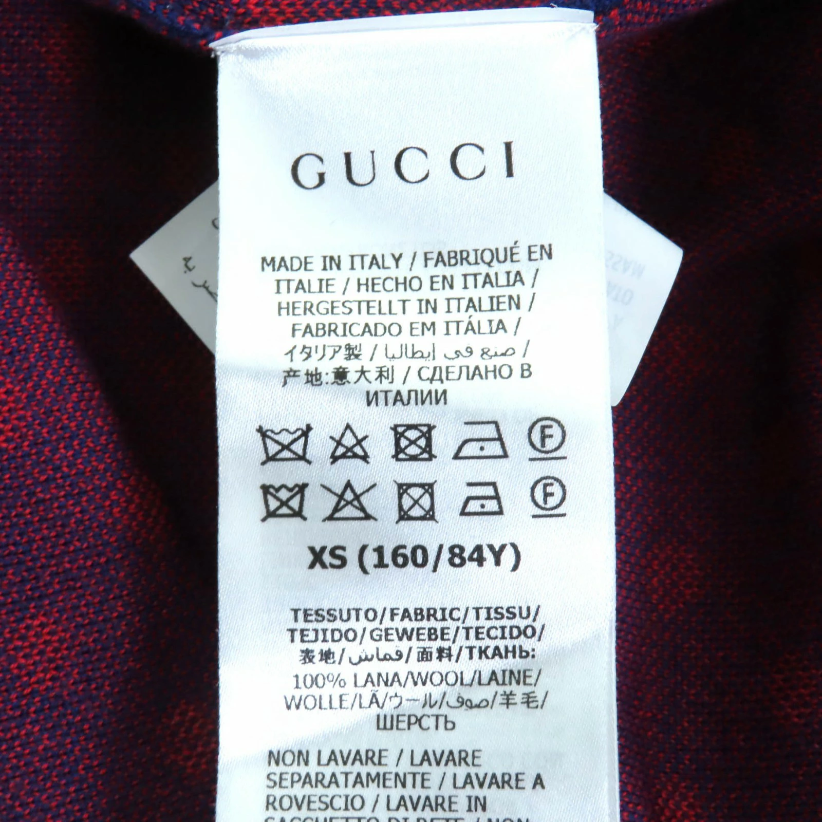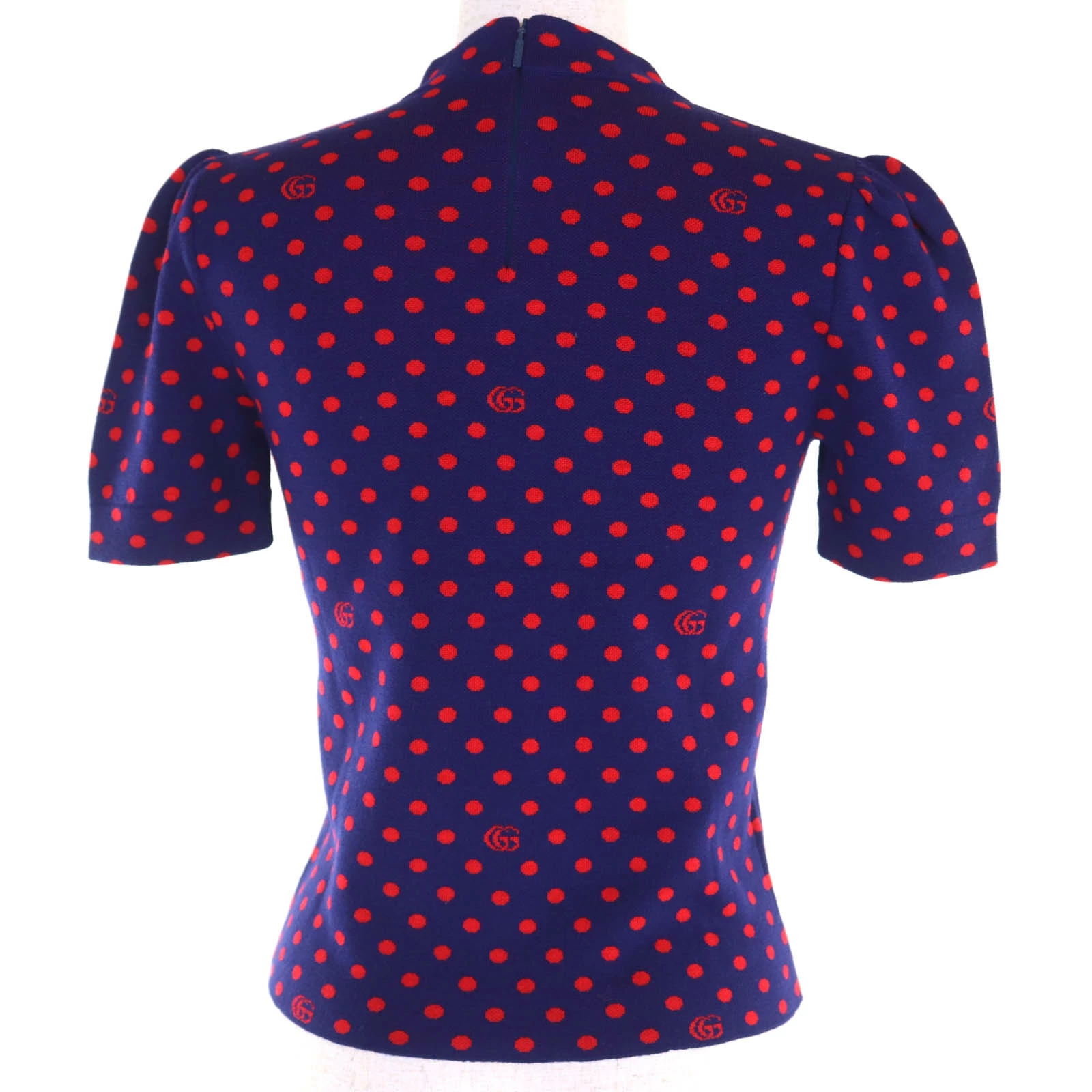 Excellent condition: GUCCI 623606 100% wool double G polka dot crew neck short sleeve knit sweater, navy and red, size XS, made in Italy, authentic, women's [pre-owned]