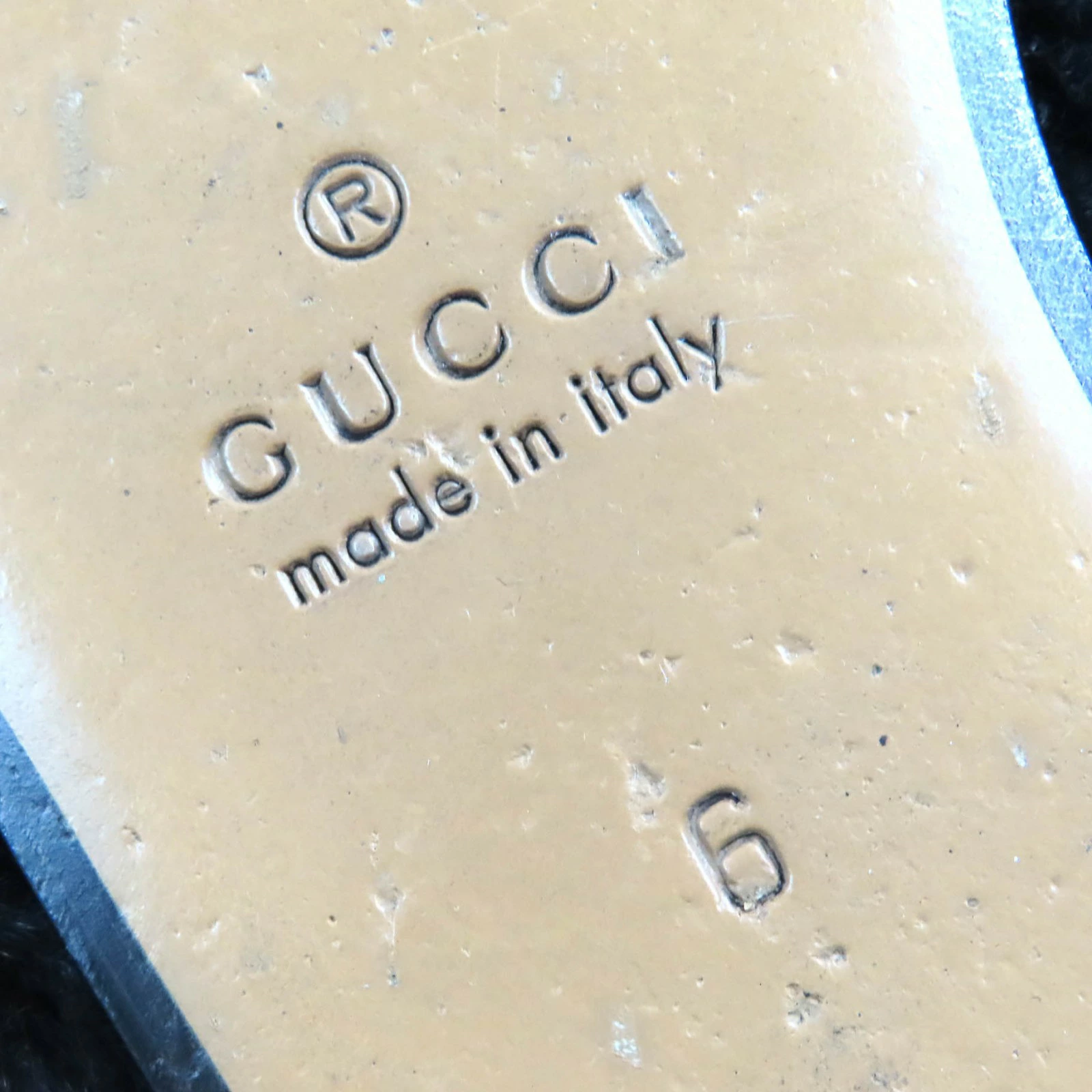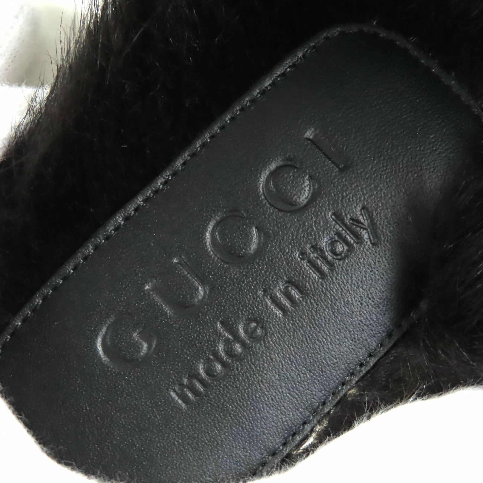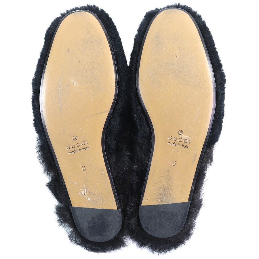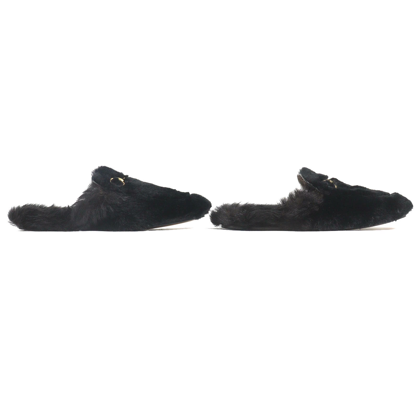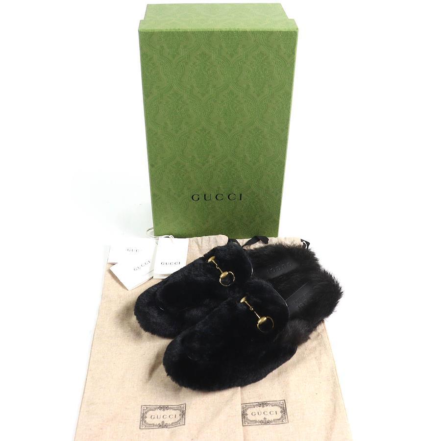 Excellent condition: GUCCI Horsebit leather and fur mule slippers, black and gold, size 6, with box and dust bag, made in Italy, men's [pre-owned]