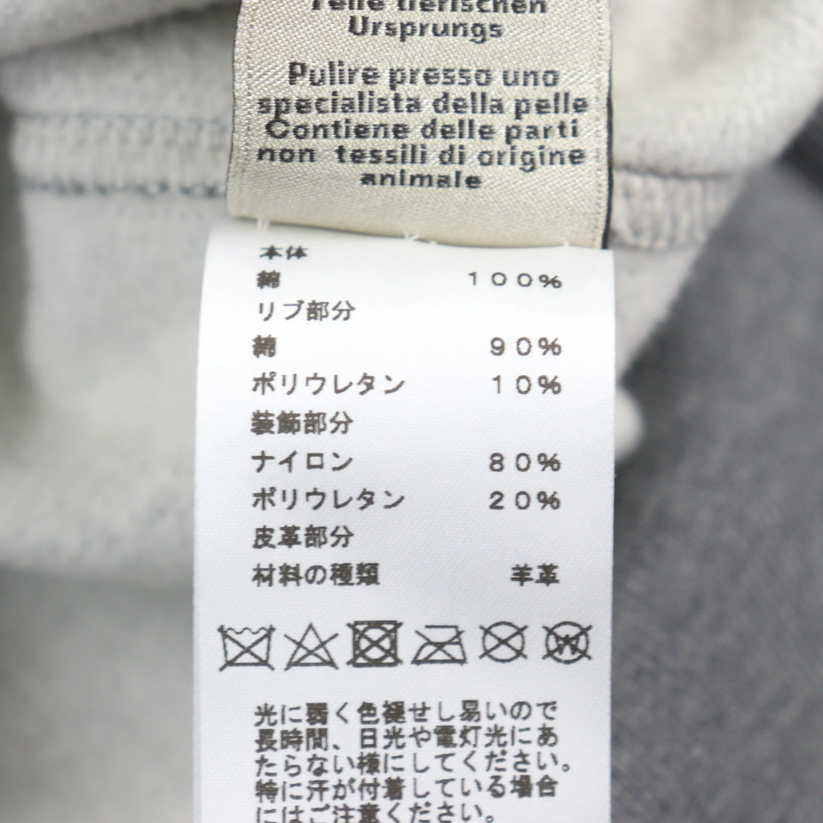 | 素材 (material) | 本体:コットン100% 一部:コットン90% :ポリウレタン10% :ナイロン80% :ポリウレタン20% 皮革部分:羊革 | ||||||||||||||||