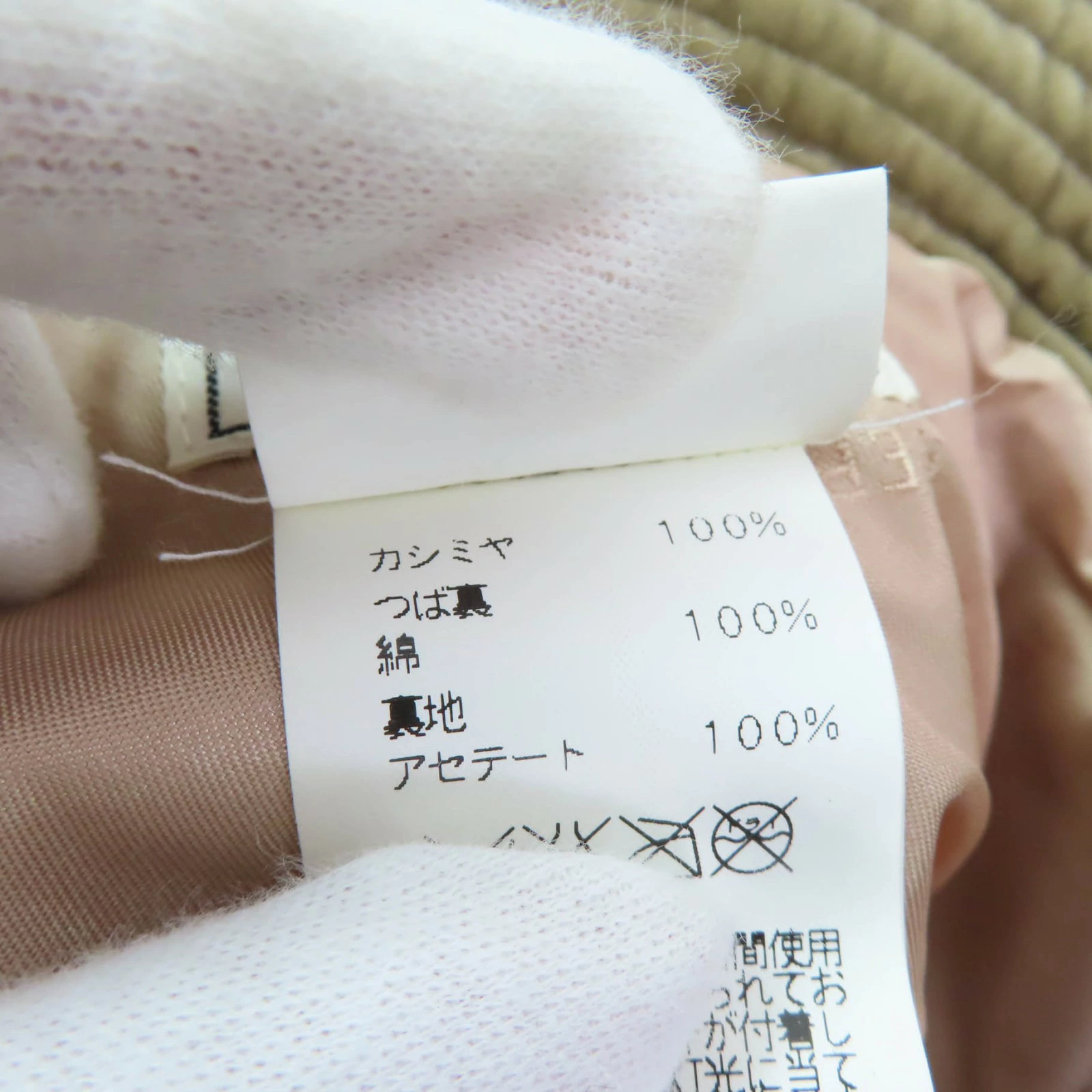 | 素材 (material) | 本体:カシミヤ100% 一部:コットン100% 裏地:アセテート100% | ||||||||||||||||