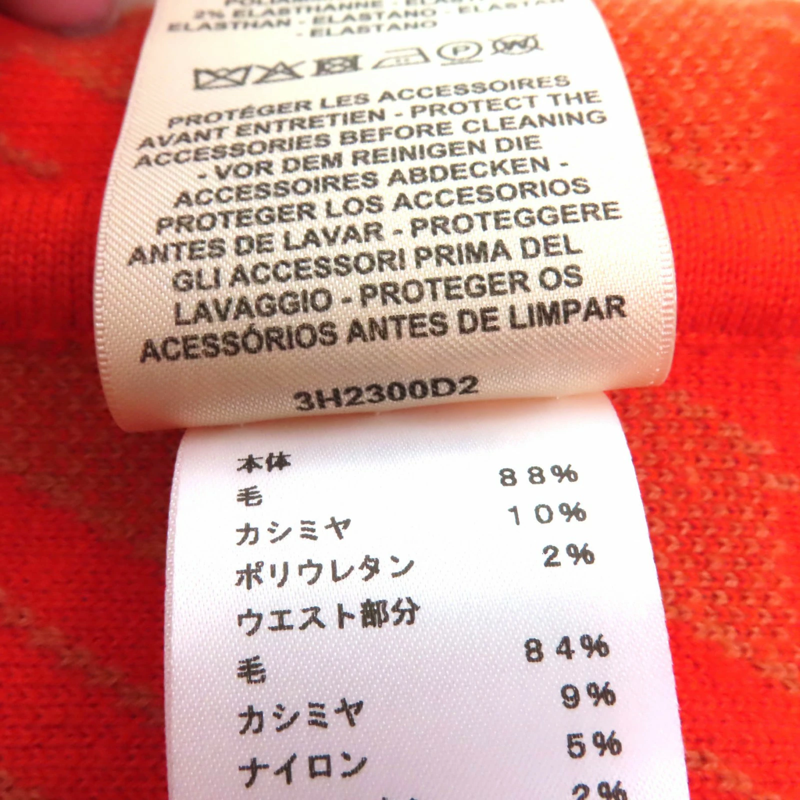 | 素材 (material) | 本体:ウール88% :カシミヤ10% :ポリウレタン2% 一部:ウール84% :カシミヤ9% :ナイロン5% :ポリウレタン2% :ウール90% :カシミヤ10% | ||||||||||||||||