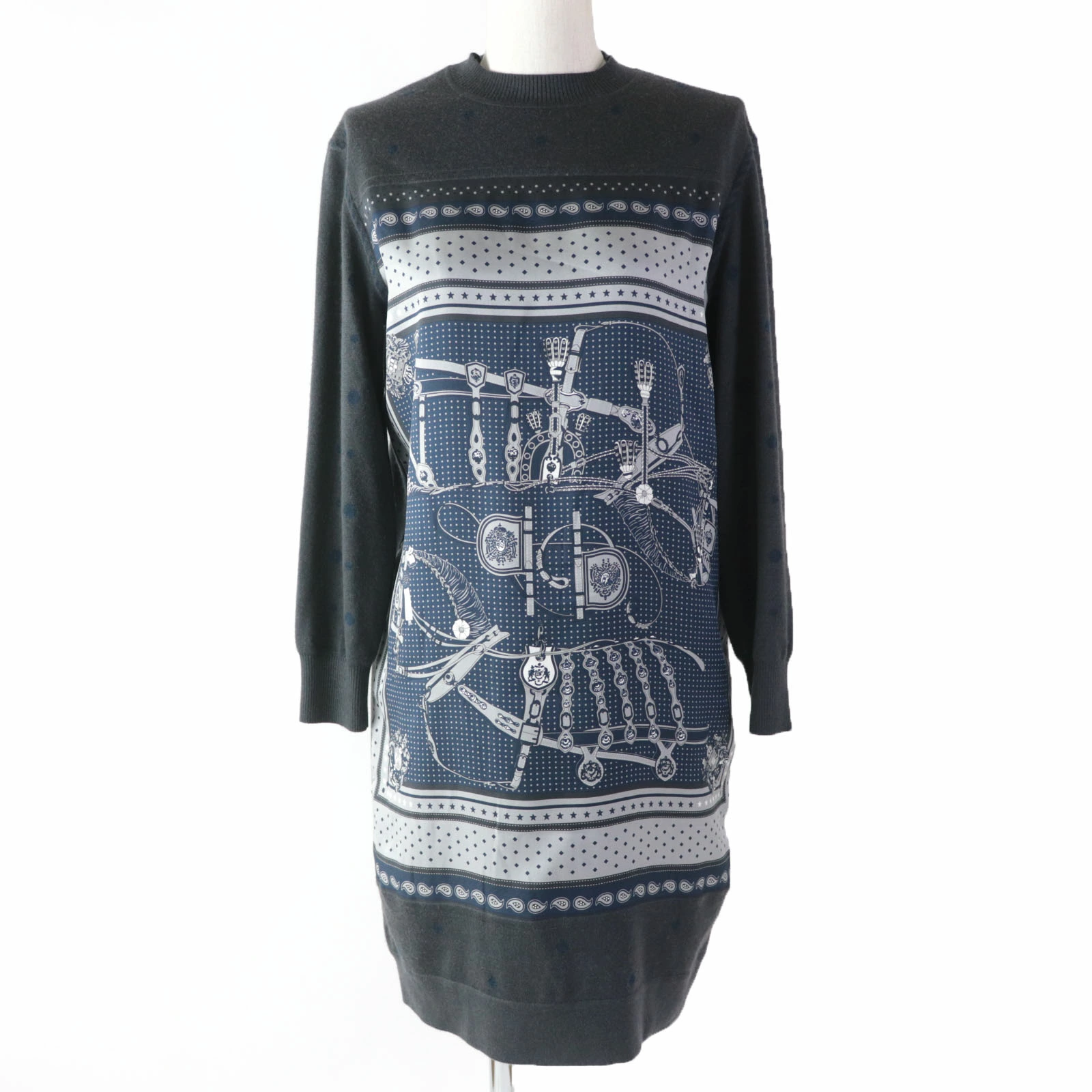 Excellent condition HERMES HARNAIS DE COUR (2H2825DS) Court Harness Silk Cashmere Twill Laine Long Sleeve Dress, Gray, Size 34, Made in France, Authentic, Women's [Pre-owned]