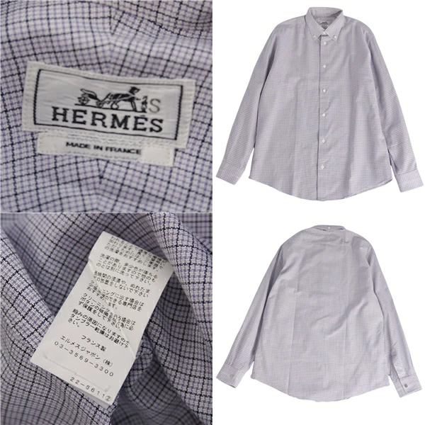エルメス HERMES シャツ ロングスリーブ 長袖 ボタンダウン チェック コットン トップス メンズ フランス製 グレー サイズ41/16
