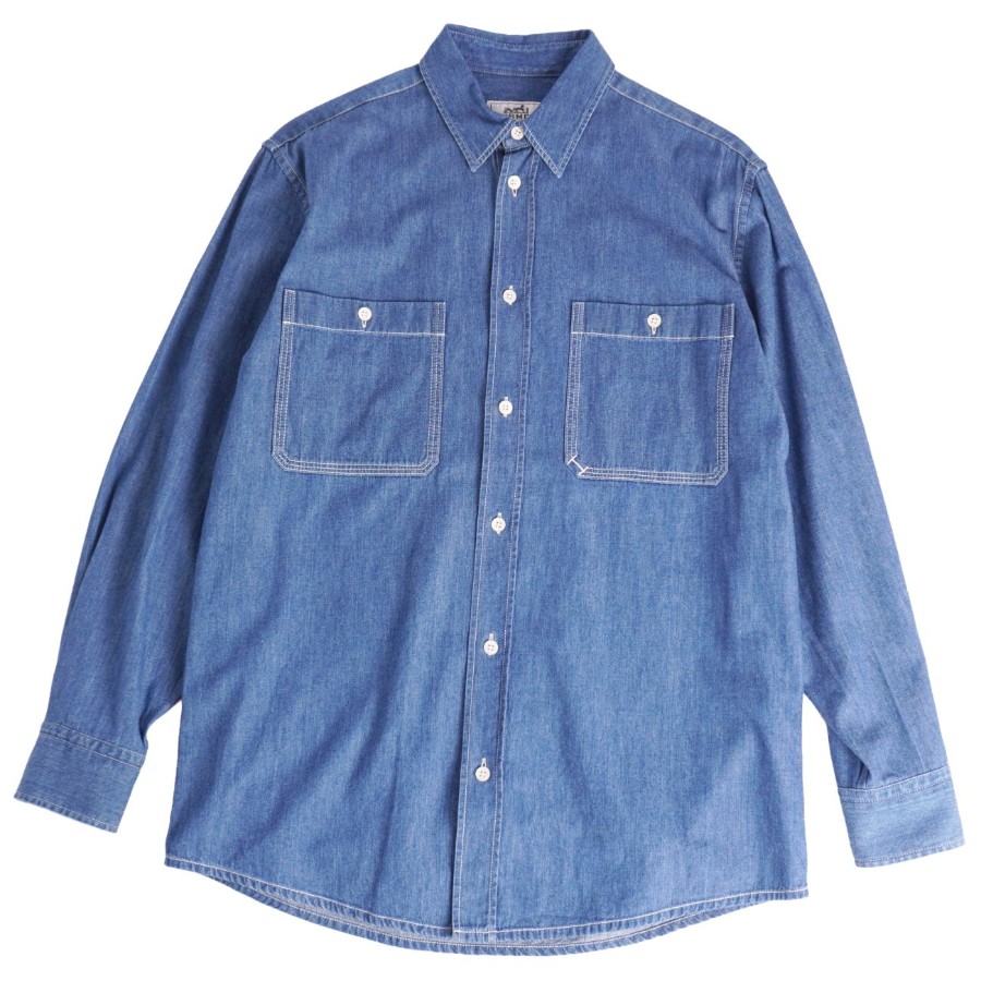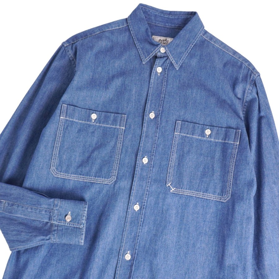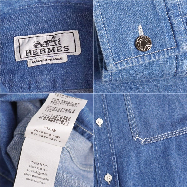 エルメス HERMES シャツ 23AW デニムシャツ ロングスリーブ 長袖 コットン セリエボタン トップス メンズ フランス製 インディゴブルー サイズ38(15)