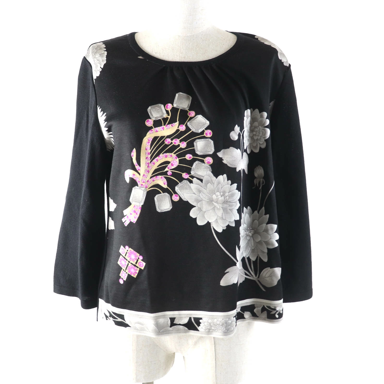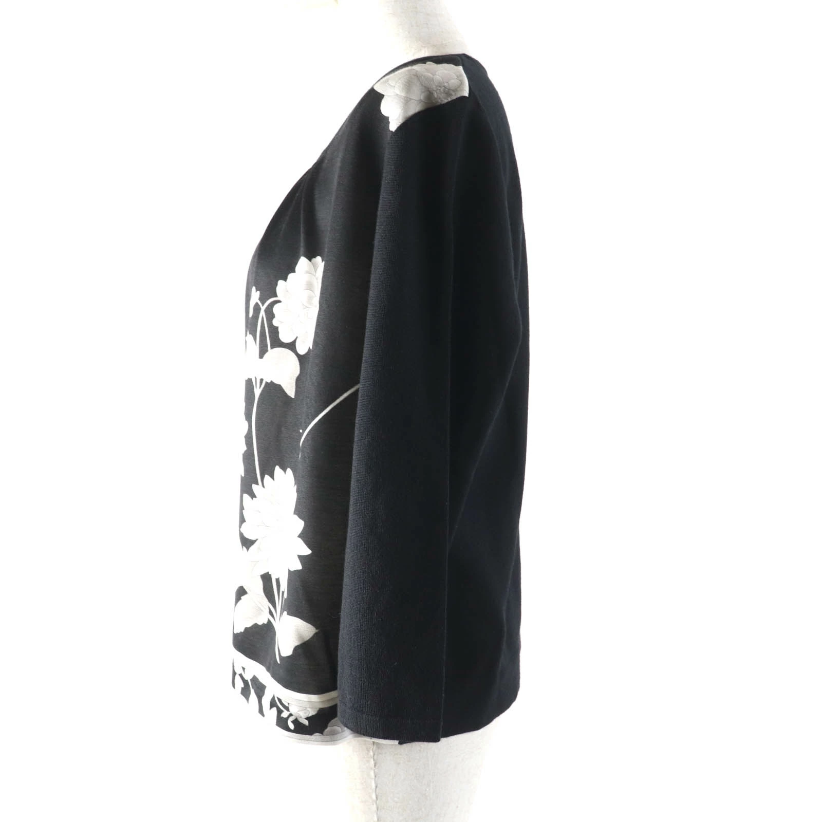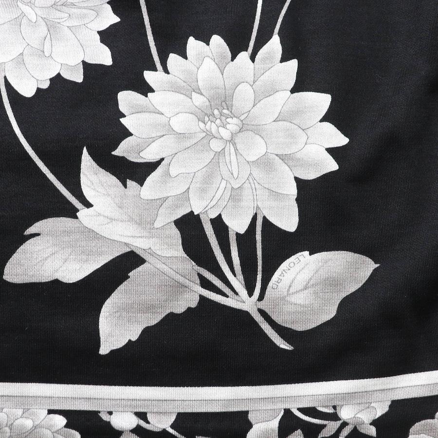 Excellent condition LEONARD FASHION 0387717 wool and silk blend floral print crew neck, 3/4 sleeve knit, black, size 42, made in Japan, authentic, women's [pre-owned]