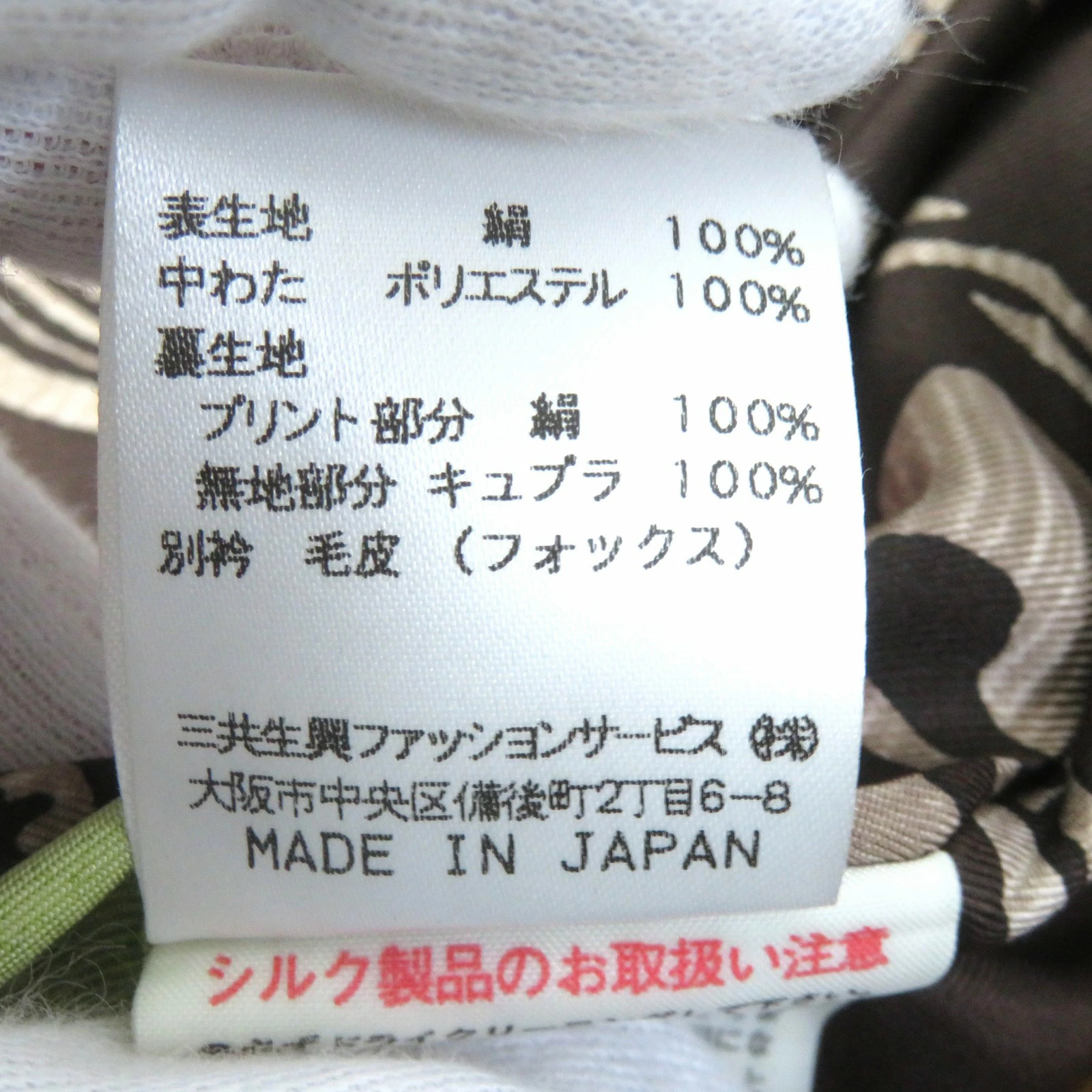 | 素材 (material) | 表地:シルク100% 中綿:ポリエステル100% ファー:フォックス 表地:シルク100% 中綿:ポリエステル100% ファー:フォックス 裏地(プリント):シルク100% 裏地(無地):キュプラ100% | ||||||||||||||||