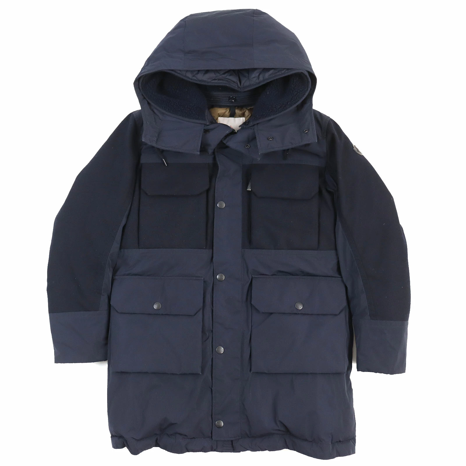 Excellent condition: MONCLER 2018 PERRAULT leather logo patch hooded down jacket, navy, size 0, authentic, pre-owned, men's.