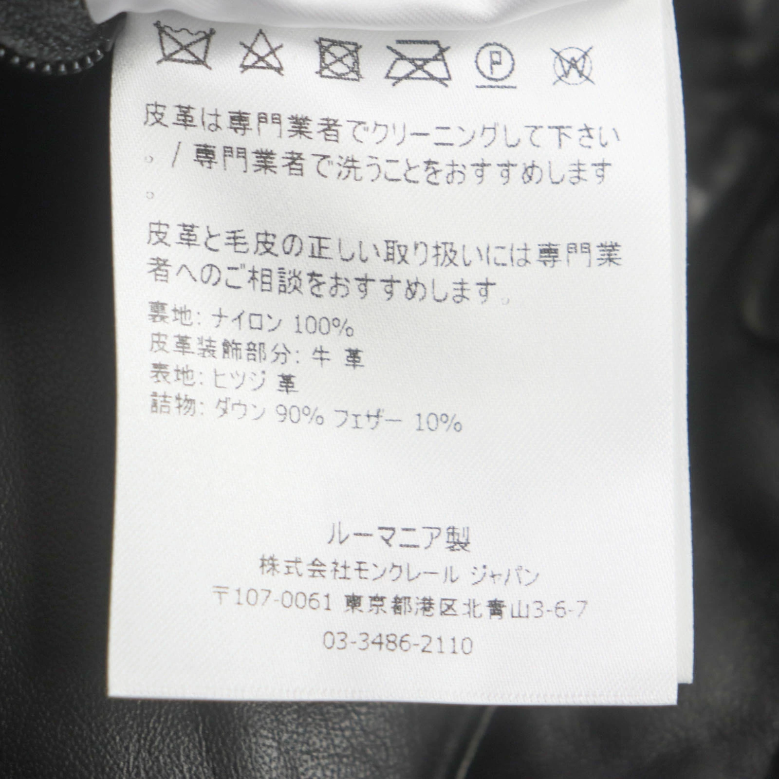 | 素材 (material) | 裏地:ナイロン100% 中綿:ダウン90% :フェザー10% 表:ヒツジ革 皮革装飾部分:牛革 | ||||||||||||||||