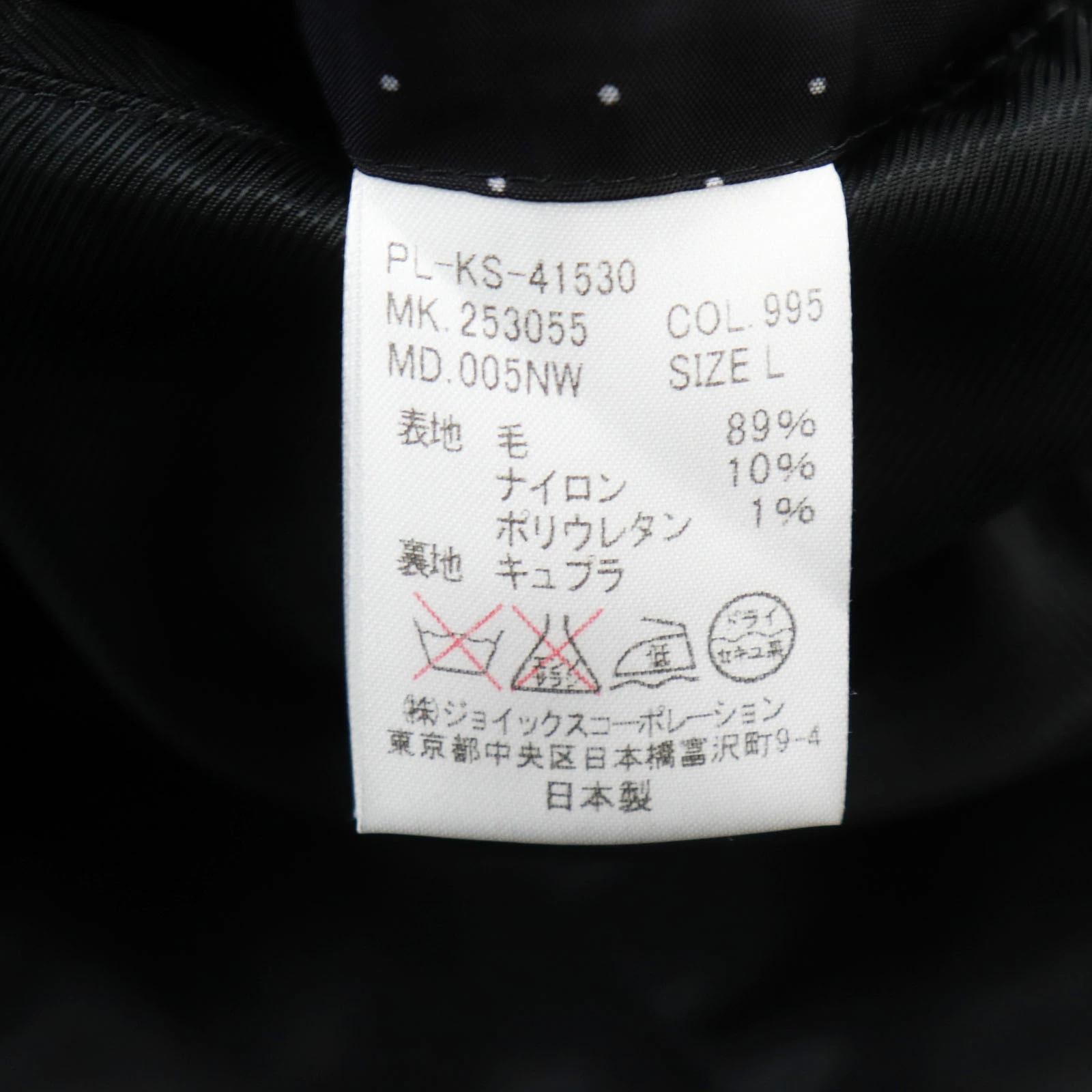 | 素材 (material) | 表地:ウール89% :ナイロン10% :ポリウレタン1% 裏地:キュプラ | ||||||||||||||||