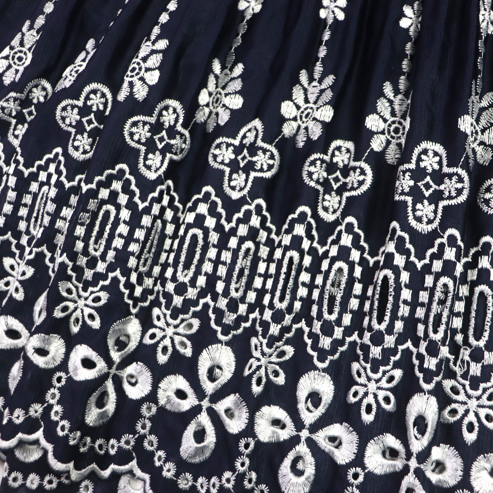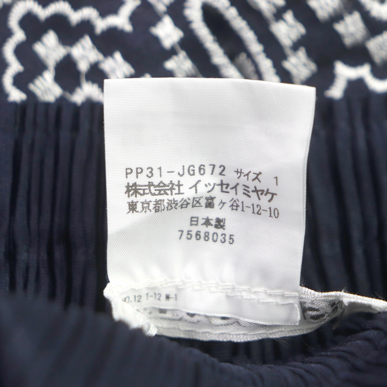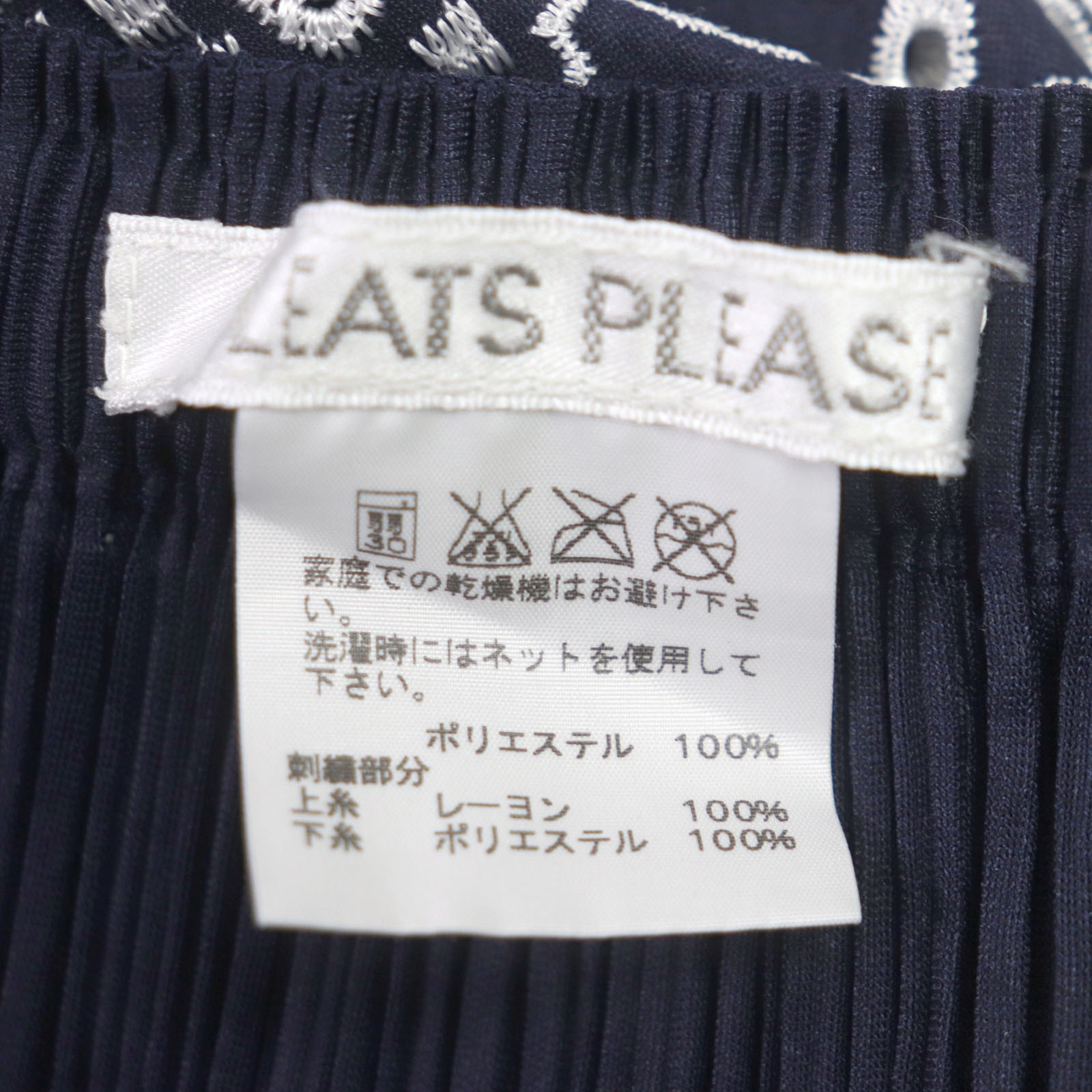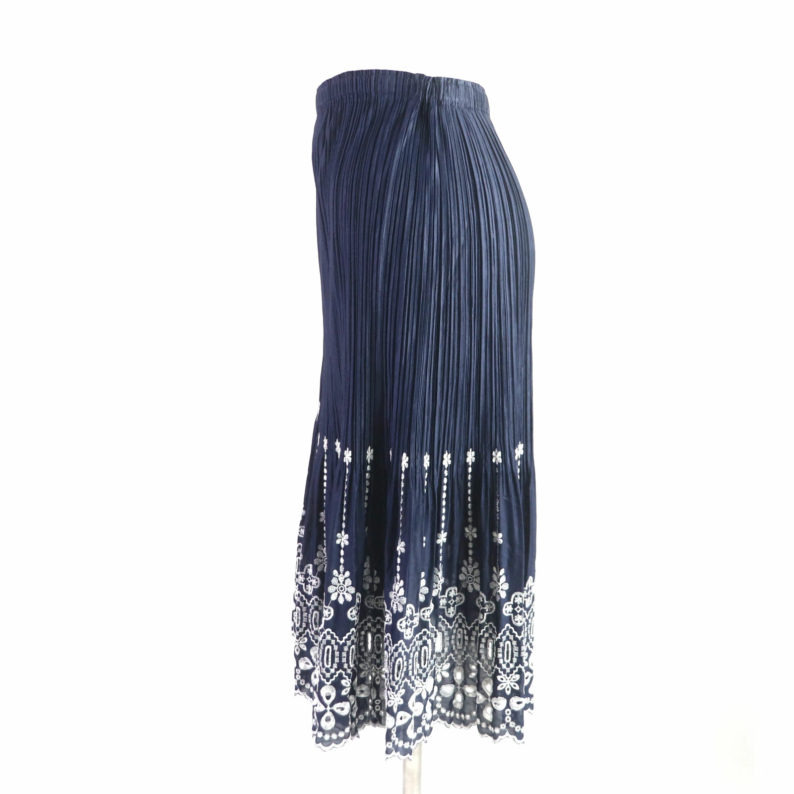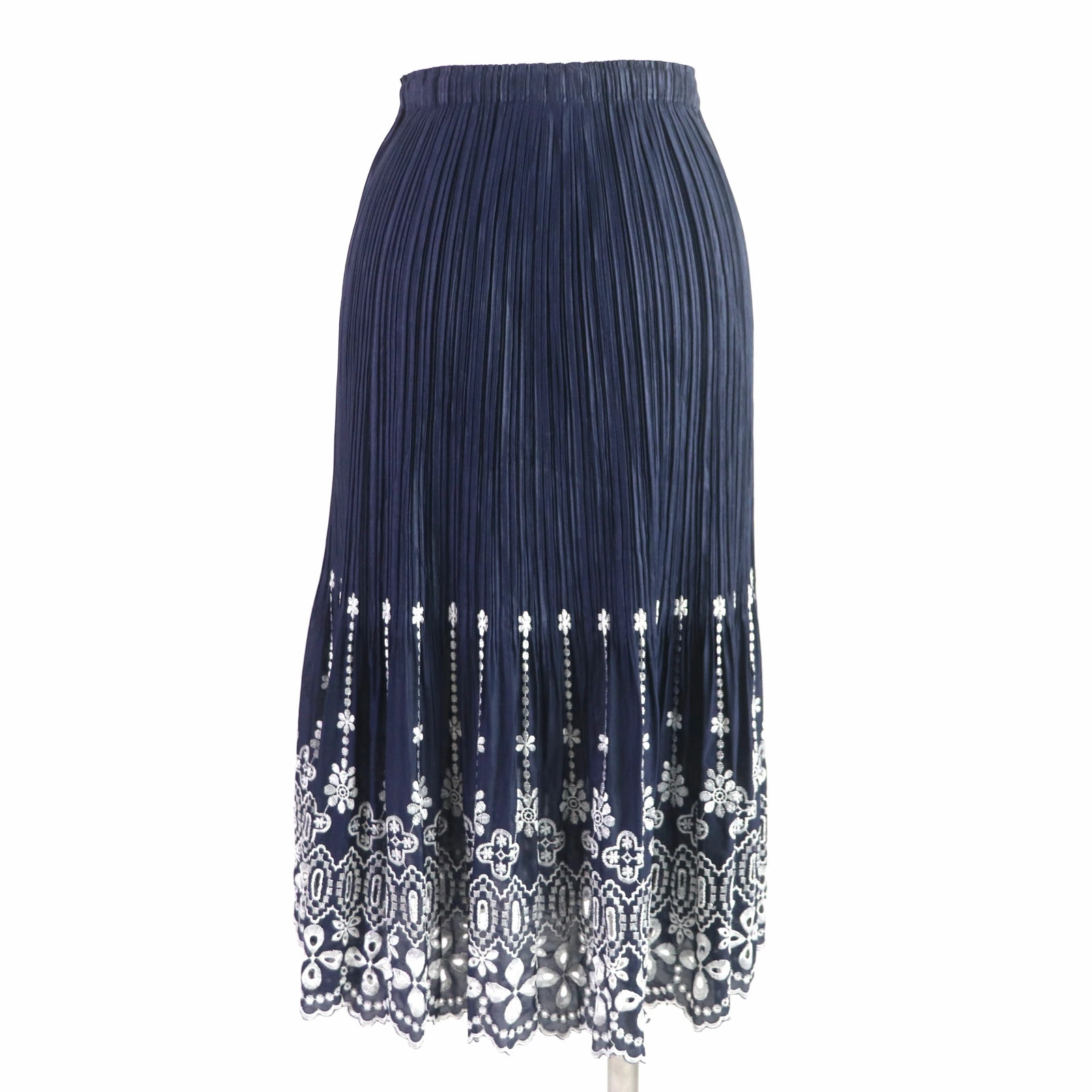 Excellent condition: PLEATS PLEASE Issey Miyake pleated skirt with cutwork lace and embroidery. Navy and white. Size 1. Authentic, made in Japan. Women's. Pre-owned.