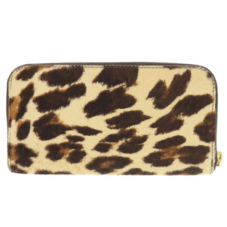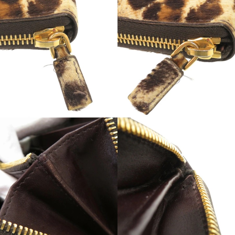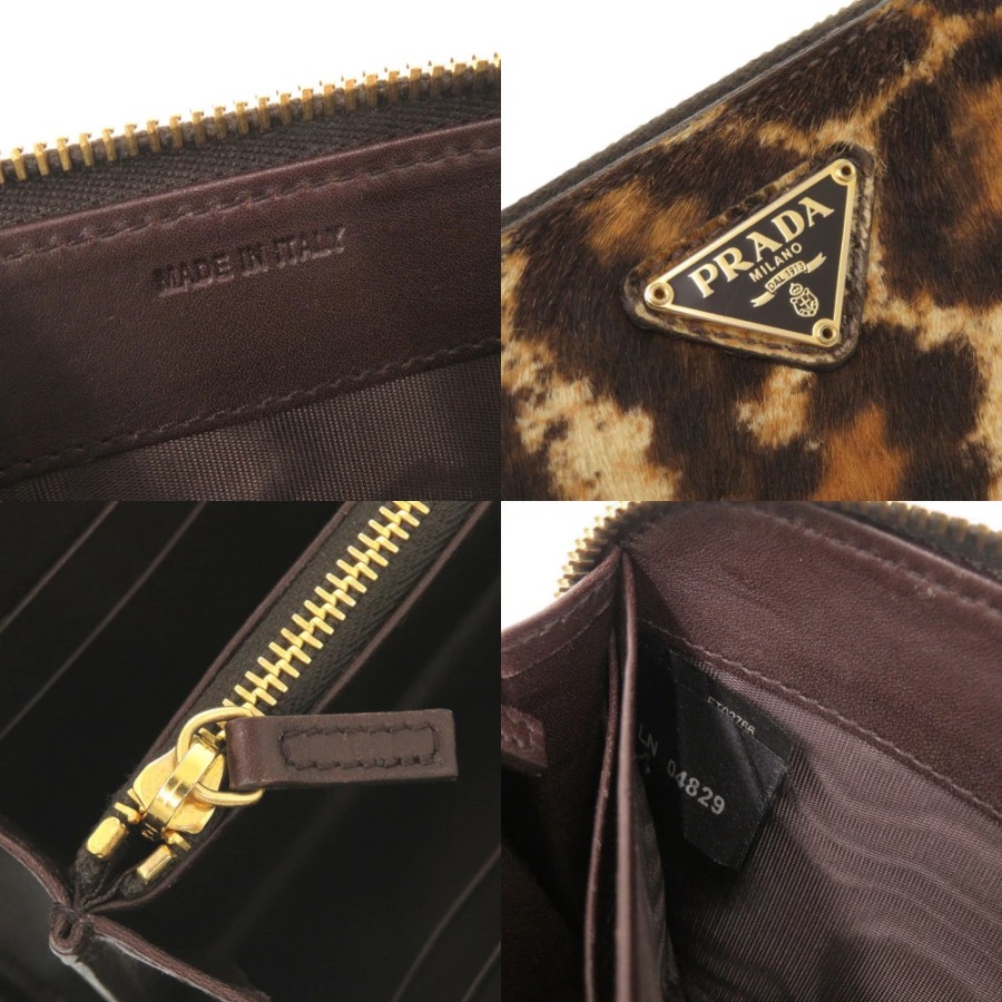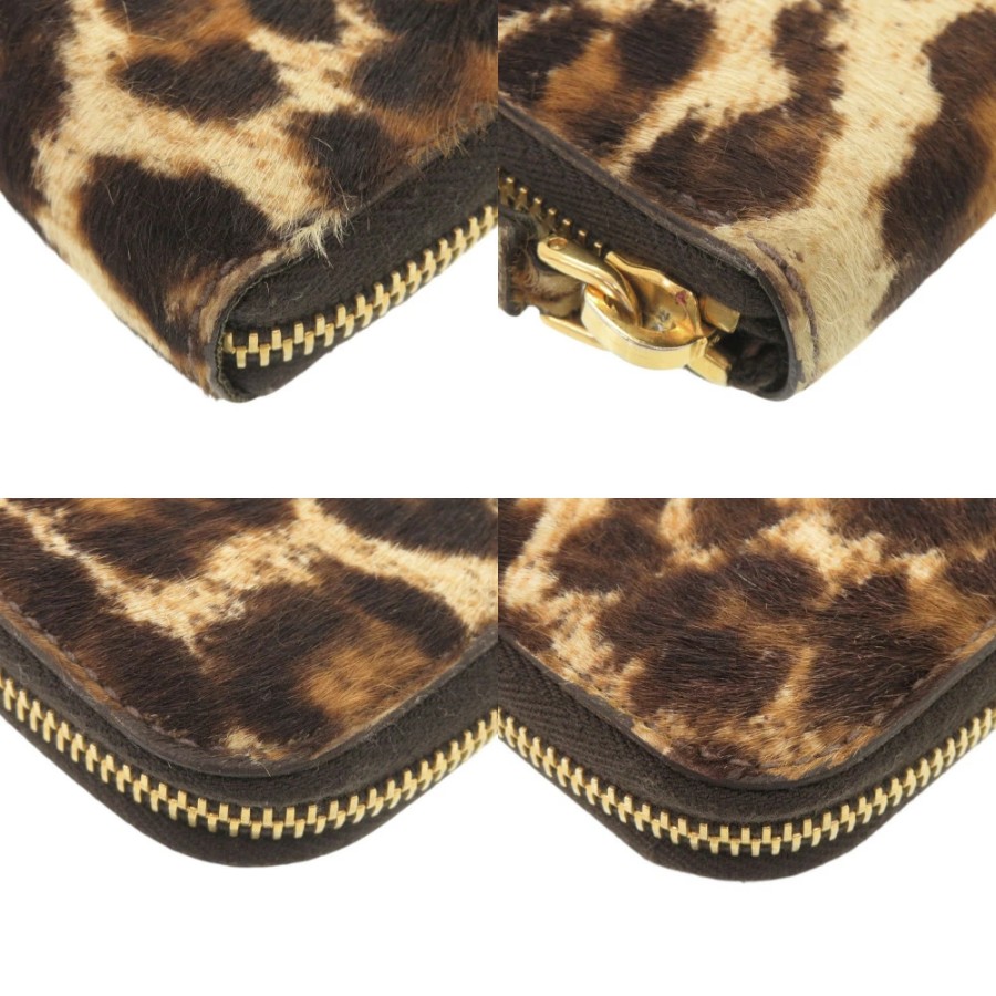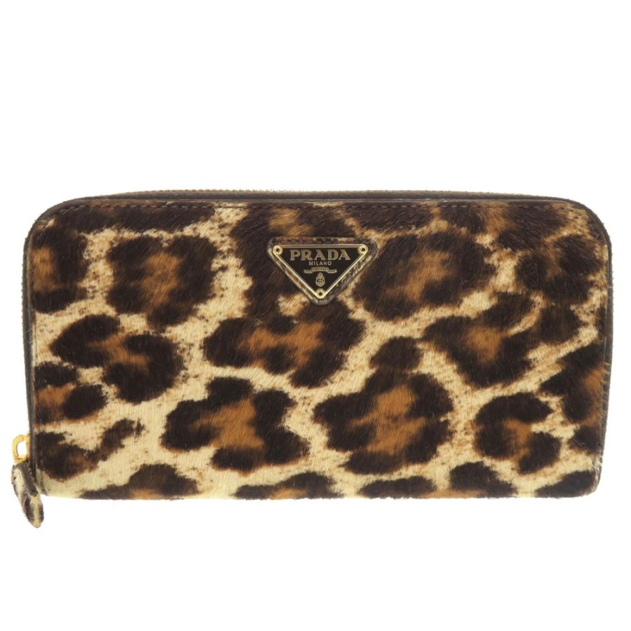 美品 プラダ トライアングルロゴ レオパード柄 ハラコ ラウンドファスナー 長財布 0398【中古】PRADA