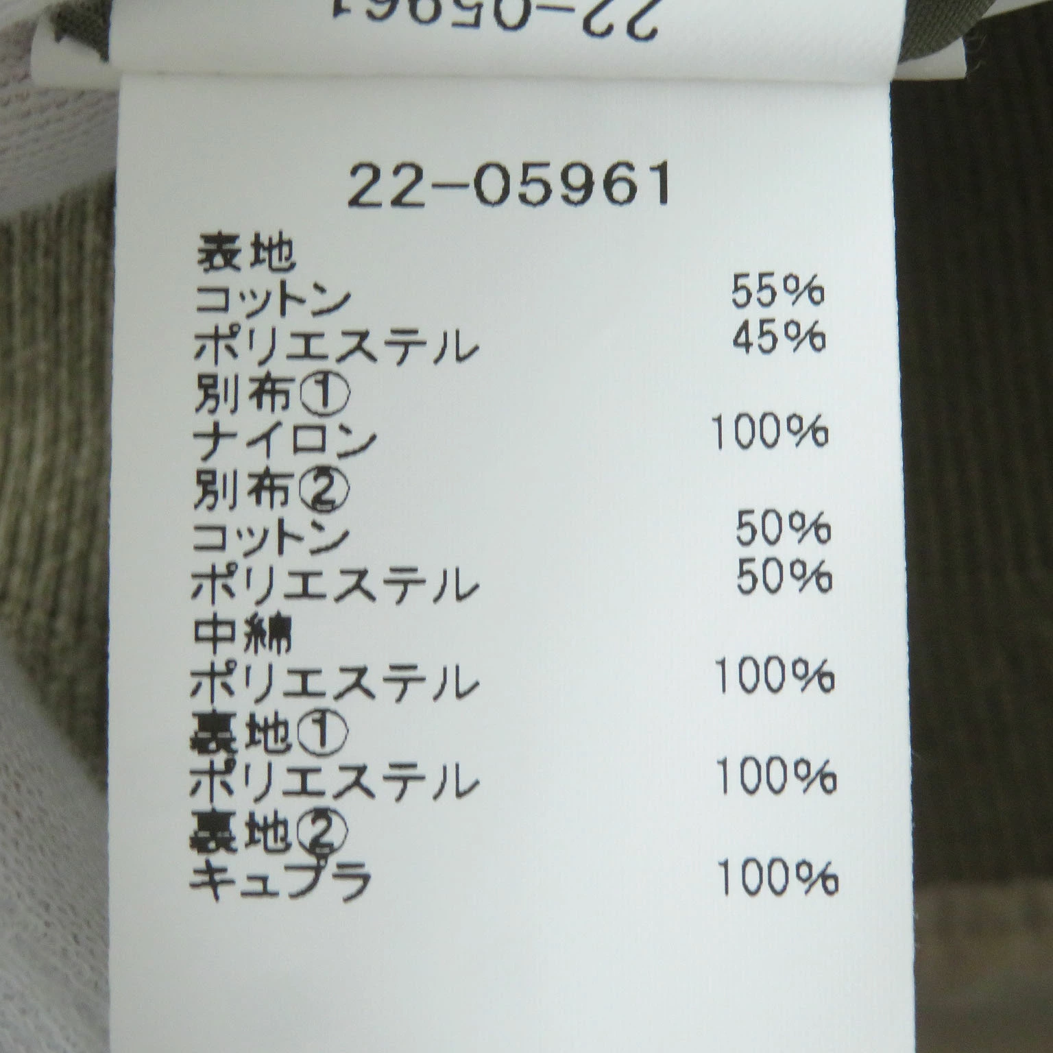 | 素材 (material) | 表地:コットン55% :ポリエステル45% 一部:ポリエステル100% :コットン50% :ポリエステル50% 中綿:ポリエステル100% 裏地:ポリエステル100% 裏地:キュプラ100% | ||||||||||||||||