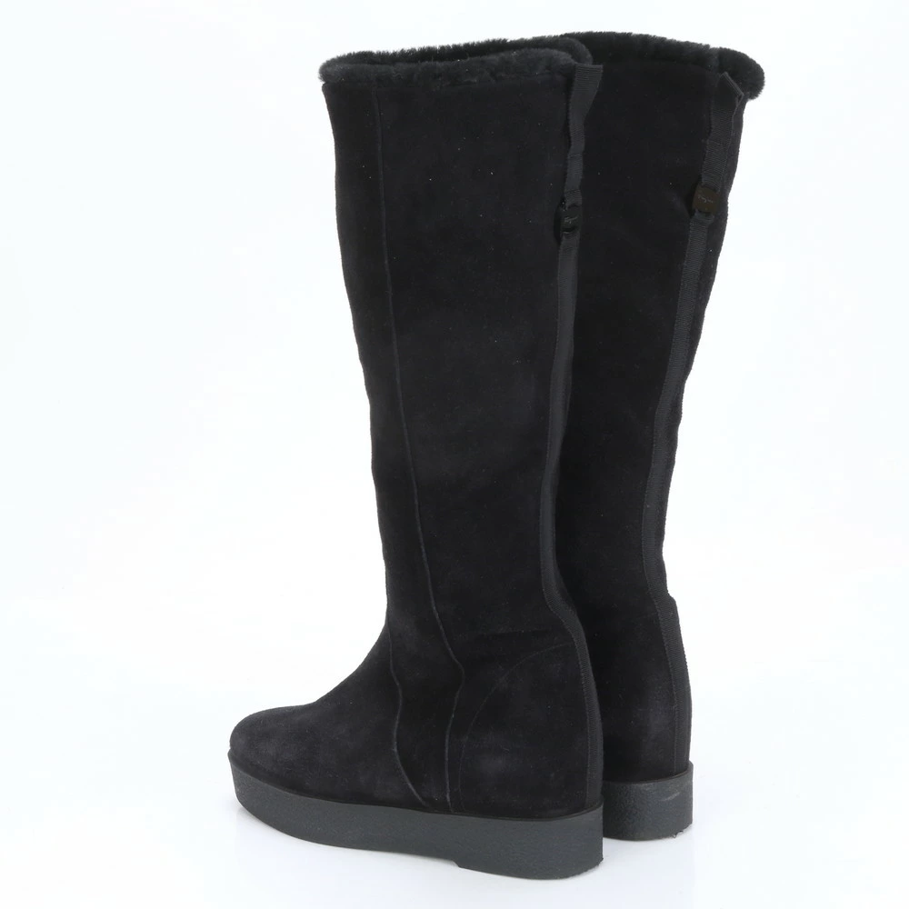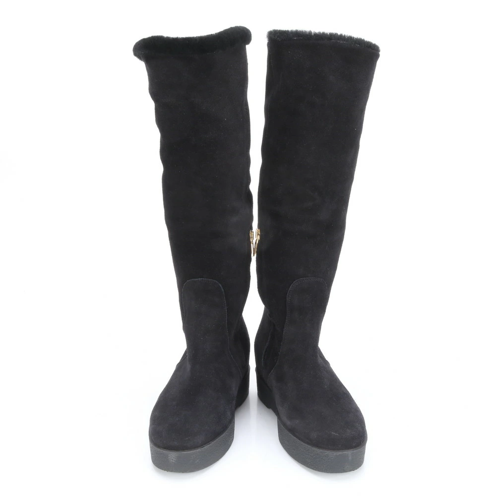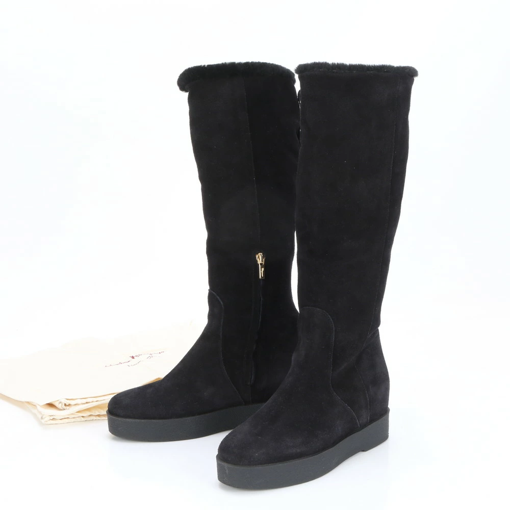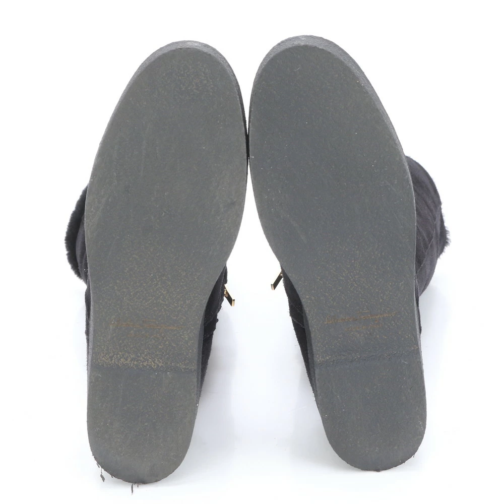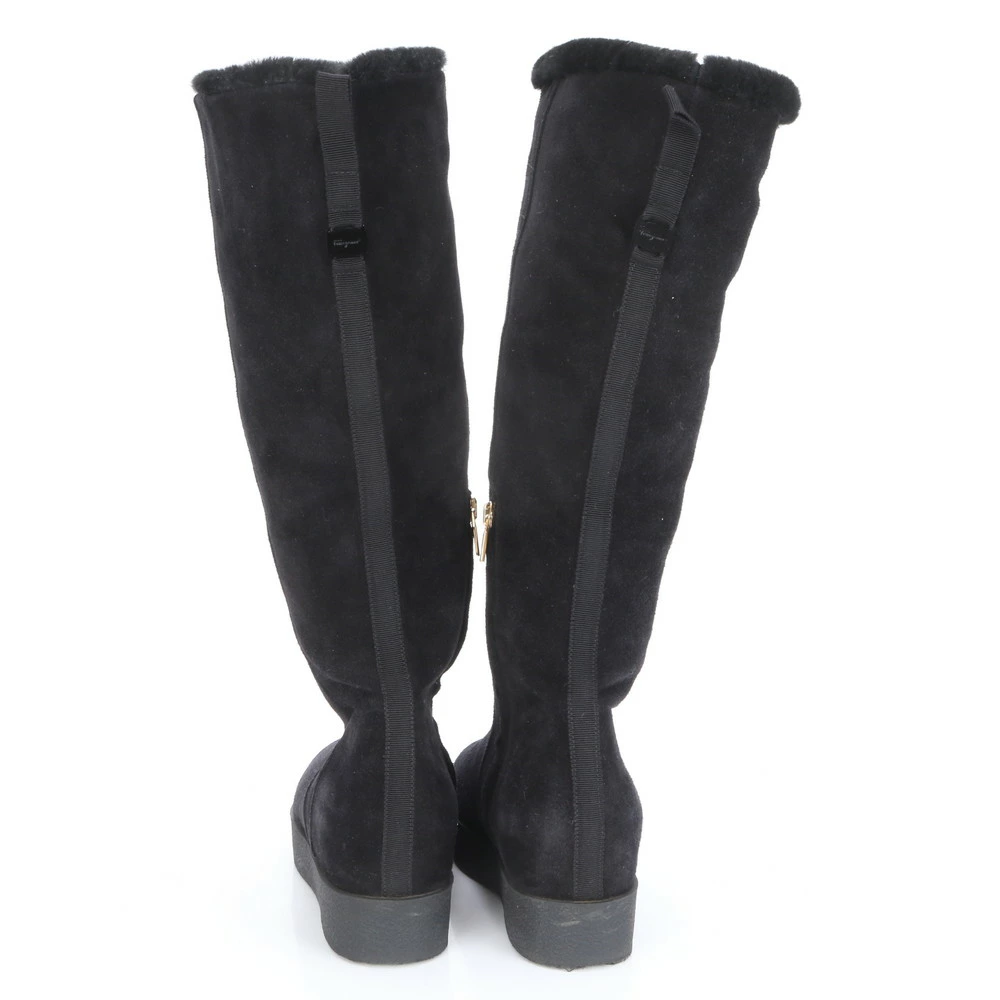Excellent condition Salvatore Ferragamo Vara long mouton boots in black, size 7 (24.5cm), with boa leather accents. Women's MLM BO28-10.