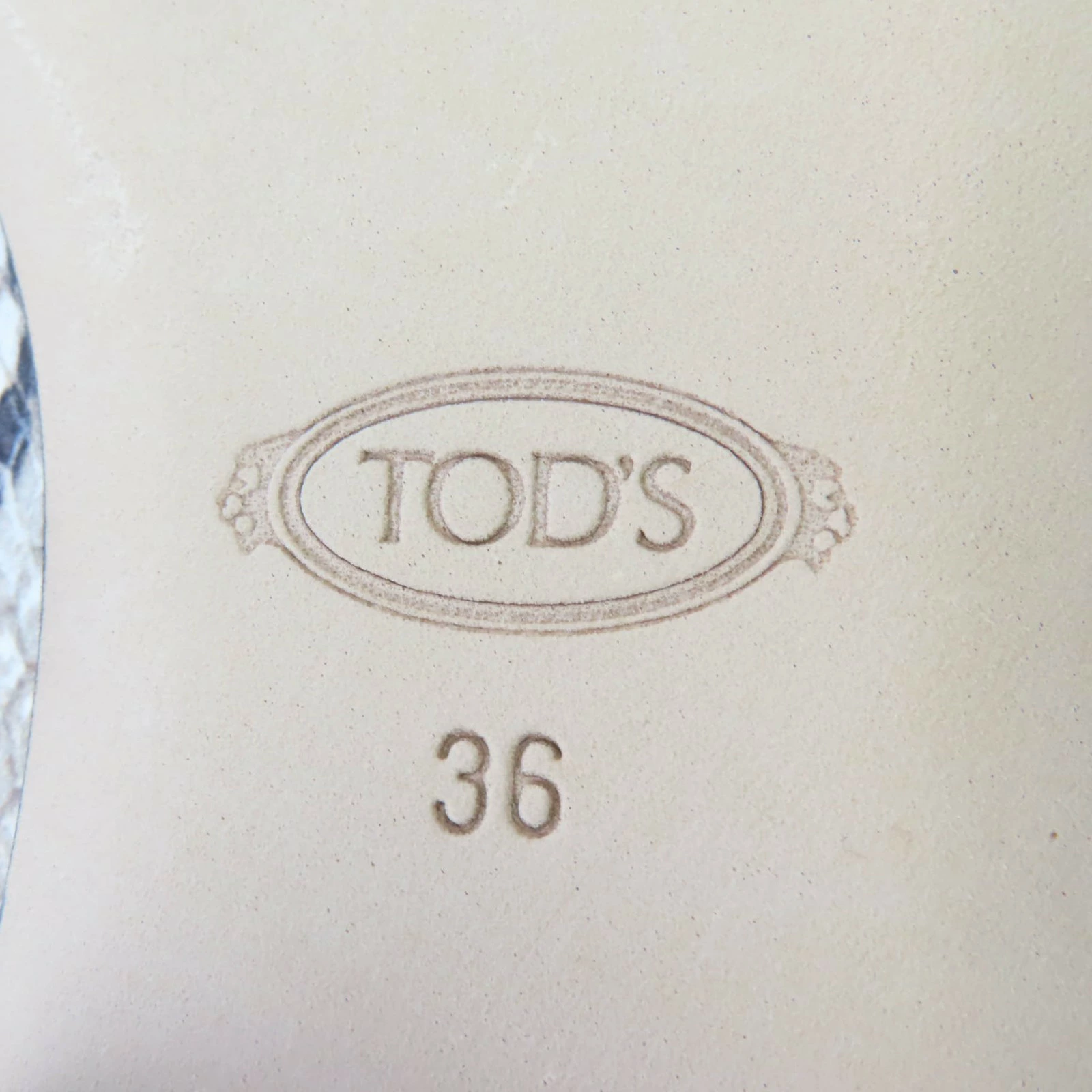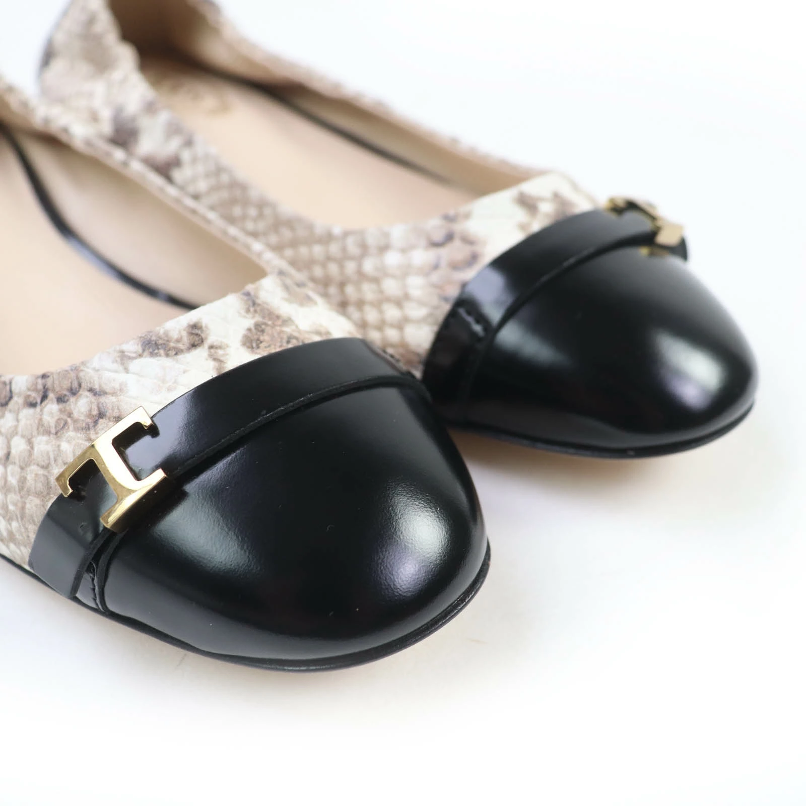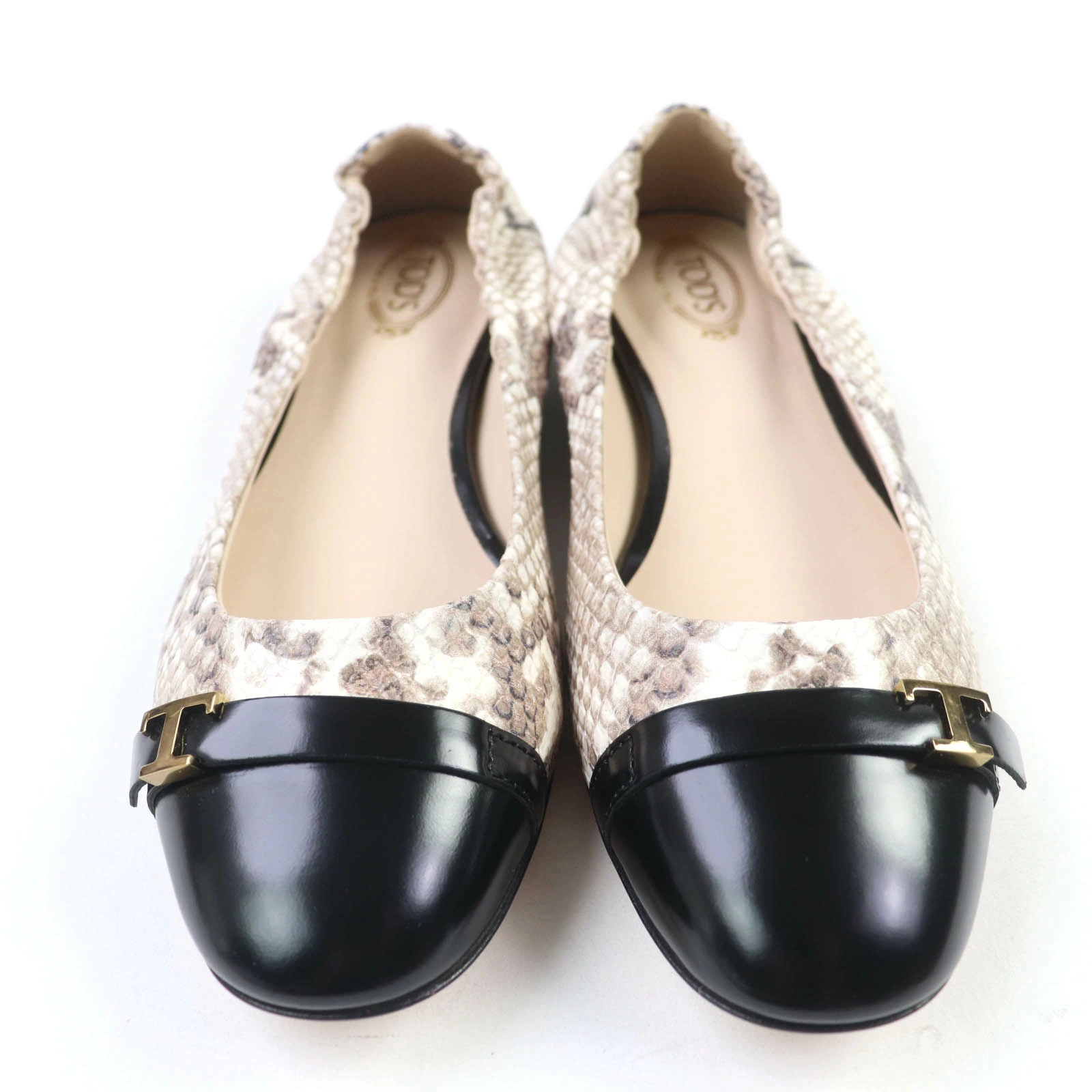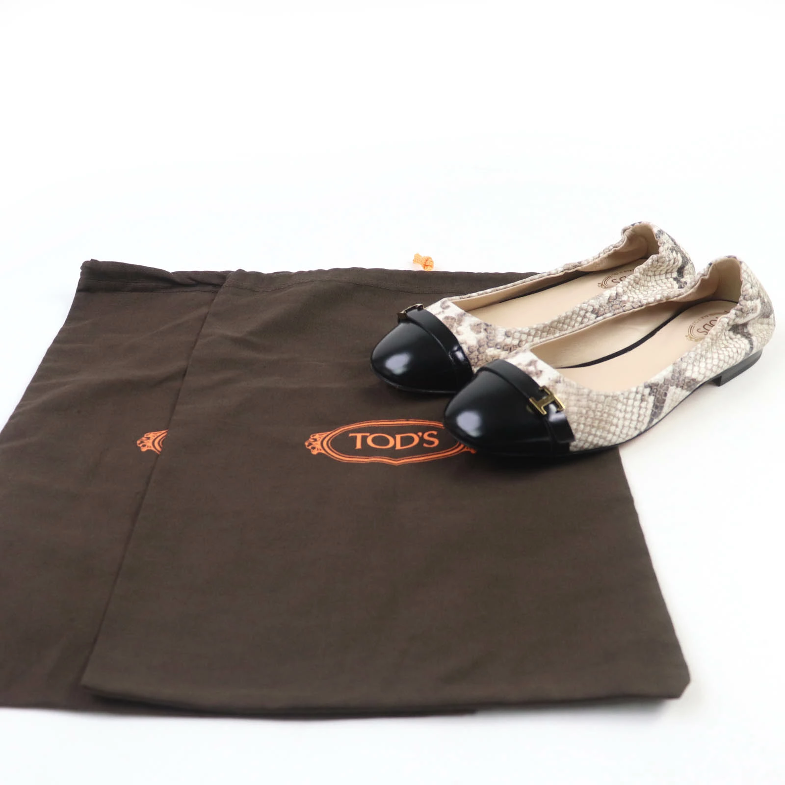 Excellent condition TOD'S T Timeless python-embossed leather flats/pumps in brown and black, size 36, with dust bag, made in Italy. Pre-owned.