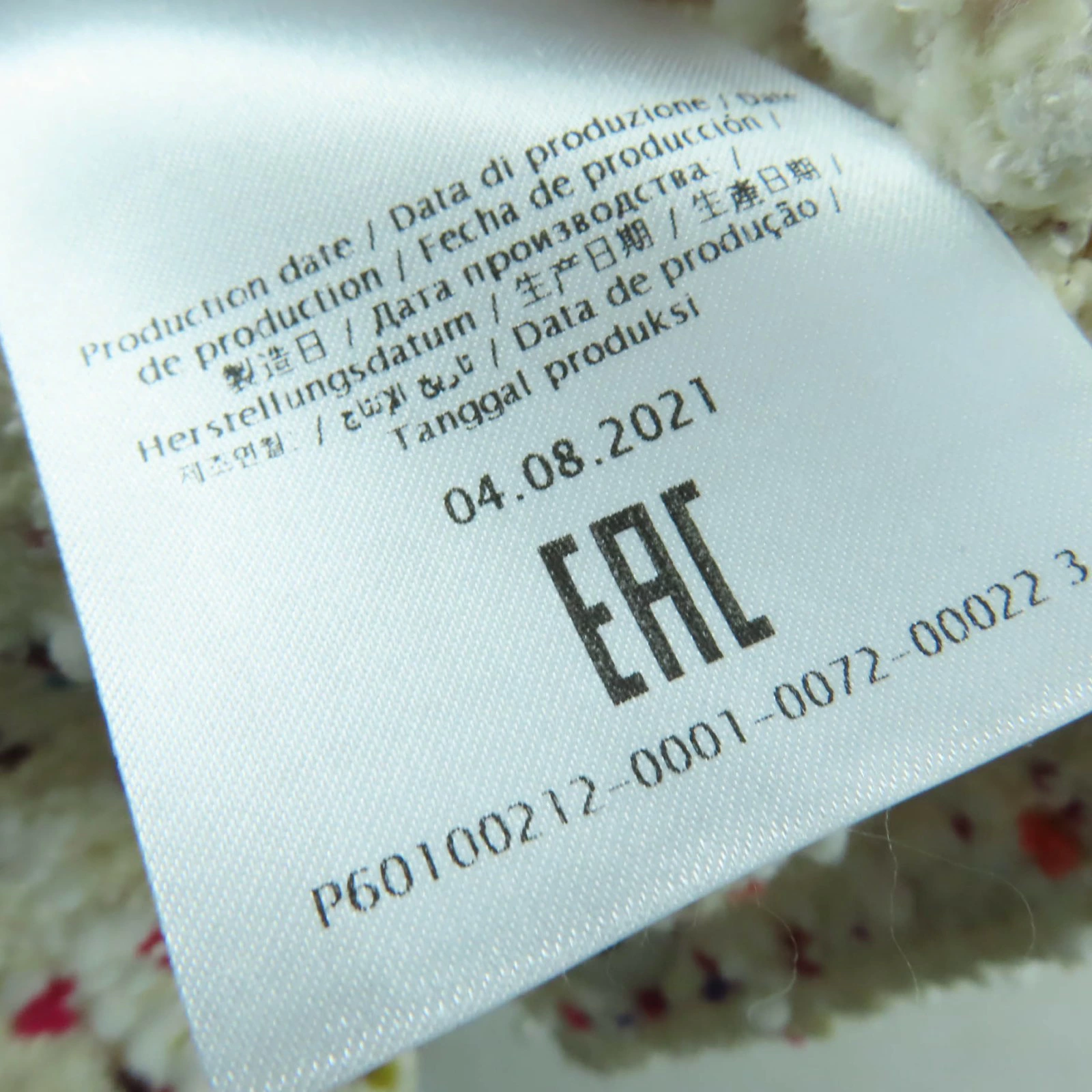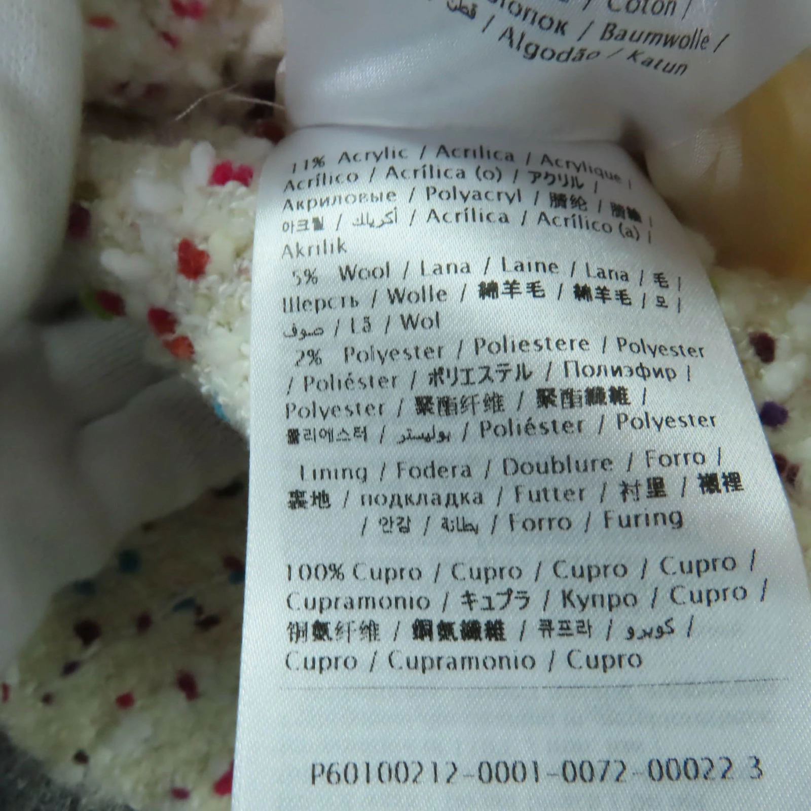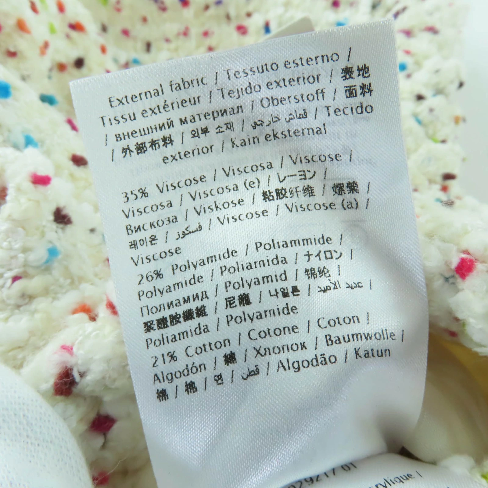 | 素材 (material) | 本体:レーヨン35% :ナイロン26% :コットン21% :アクリル11% :ウール5% :ポリエステル2% 一部:コットン54% :ポリエステル46% 裏地:レーヨン63% :シルク29% | ||||||||||||||||