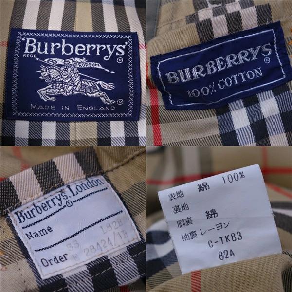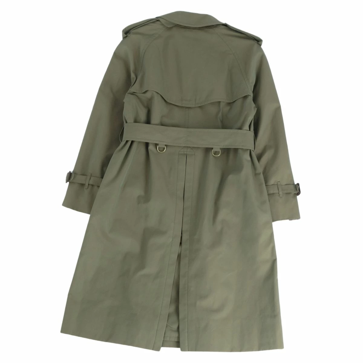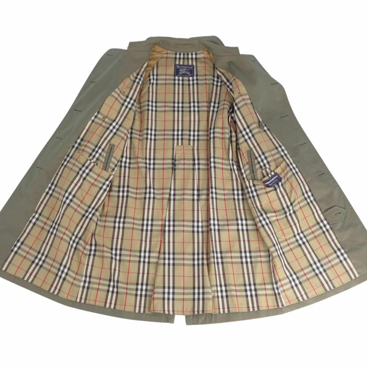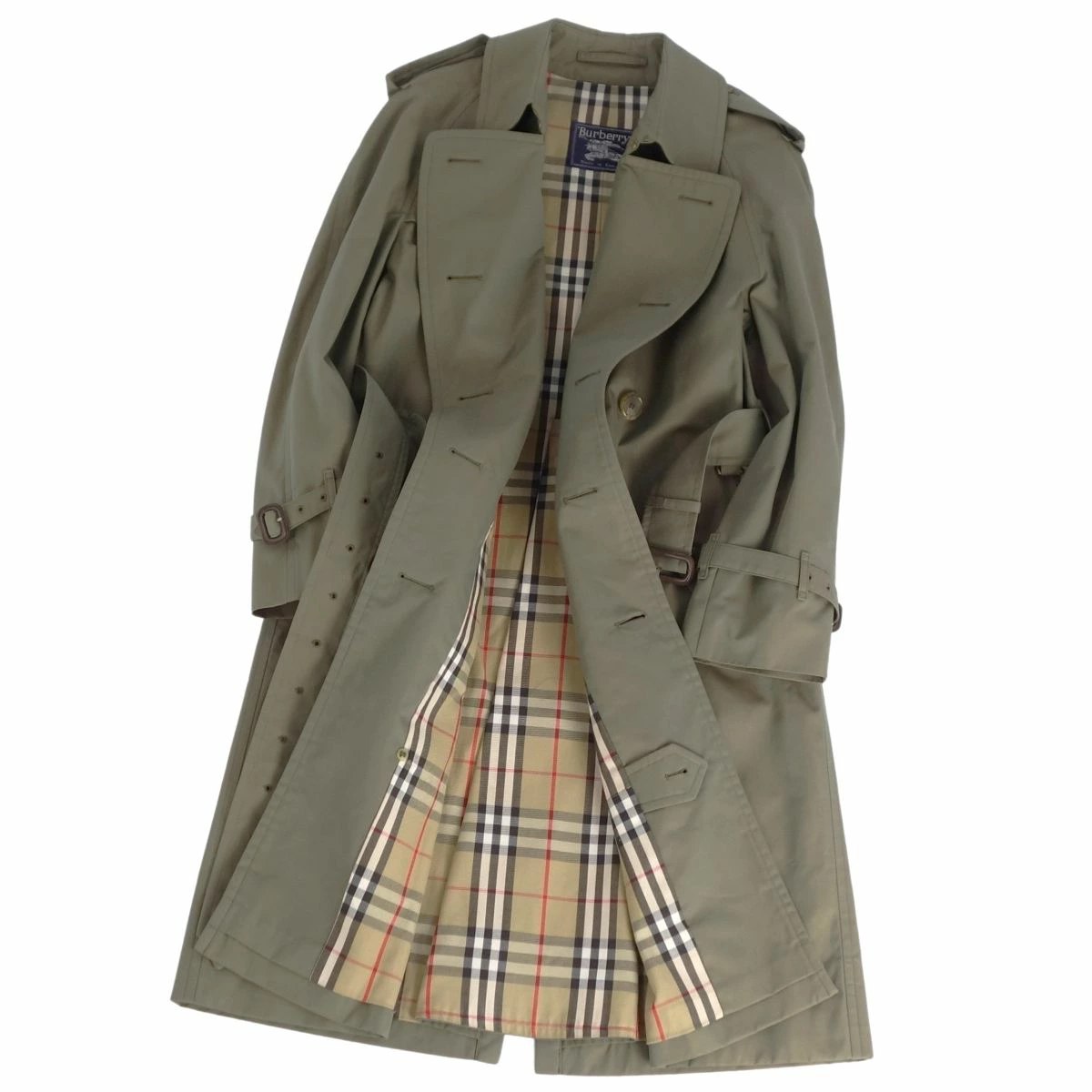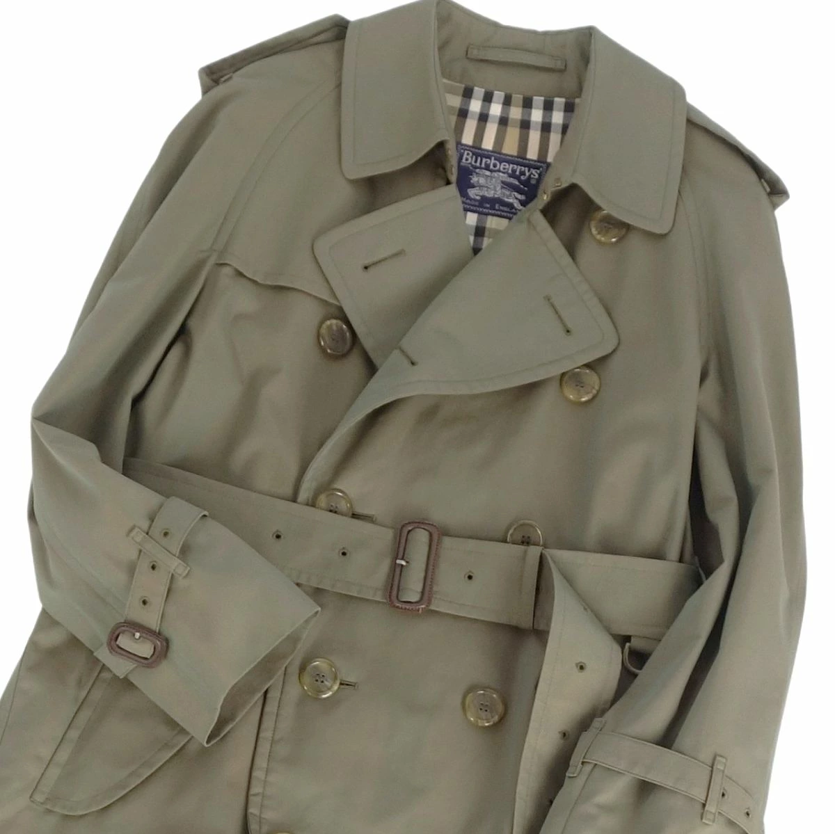 ■商品名Vintage バーバリー Burberrys コート トレンチコート 英国製 裏チェック コットン100% アウター メンズ カーキグリーン サイズS■状態説明・希少かつ絶大な人気を誇る1980年代頃のVintage Burberrys、クラシカルで美しいシルエットが魅力的な王道トレンチコートです♪・表地はコットンギャバジン、裏地はアイコニックなチェックデザイン、肩パットなしで美しいショルダーラインです◎・イングランド製・国内正規取扱品です。・USEDですが気になるようなキズや汚れなどはなく全体的にキレイな状態です!・ネーム刺繍がございます。【季節感:春秋冬】【付属品:ベルト】■素材コットン100%■カラーカーキグリーン■表記サイズS■実寸サイズ着丈:約105cm身幅:約53cmゆき丈:約85cm袖丈(脇下から):約43cm肩幅(エポレット~エポレット):約49cm■状態ランクA 使用感の少ない全体的にキレイなUSED品■店舗管理番号ce07er-rm10r07838 mens_s