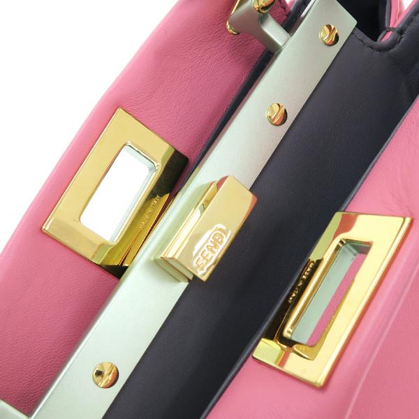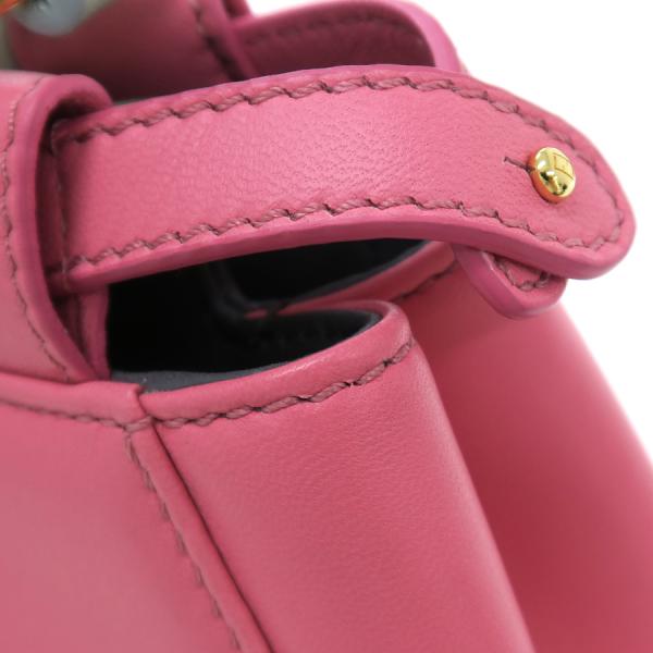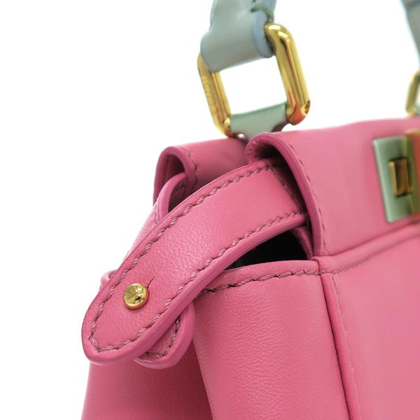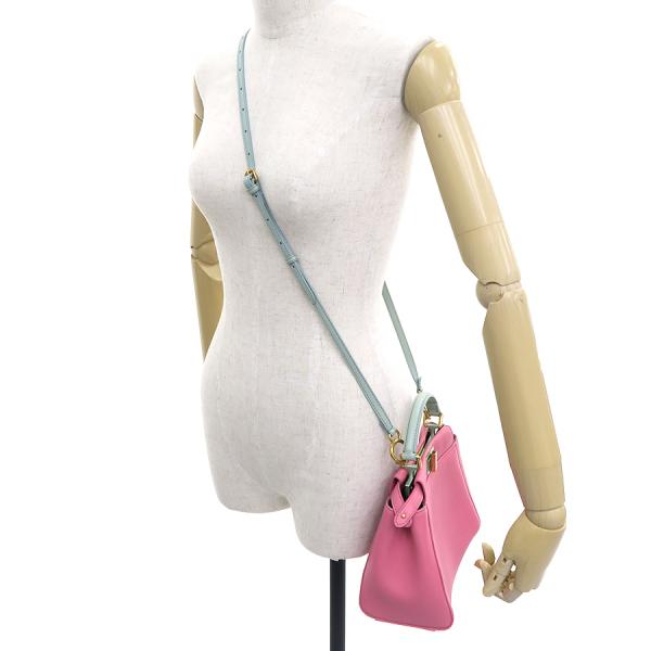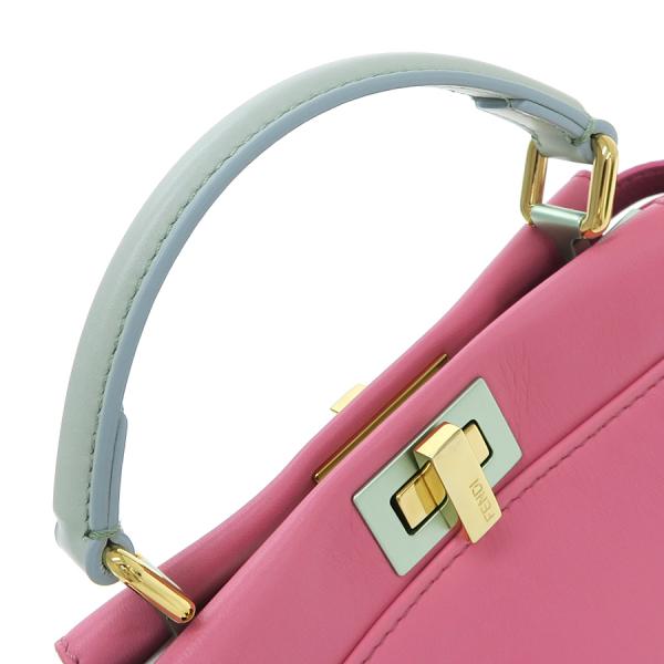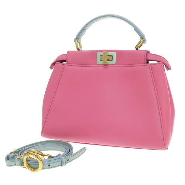 フェンディのミニピーカブーが入荷しました☆ 色合いがとっても可愛い珍しいカラーリングで高級感も兼ね備えたオススメ商品♪ 間口はターンロック式、収納スペースは二層になっており、内側にはファスナーポケット×1、スリット×1が御座います!少々の型崩れ、表面と内側の薄汚れ、持ち手や角等の縁にスレが少々あり、金具の小傷くすみが見受けられます。使用感は少な目な印象で、まだまだキレイ目なコンディションを保っています!コーディネートのアクセントにもピッタリなカラーとなりますので是非お問い合わせ下さい!!