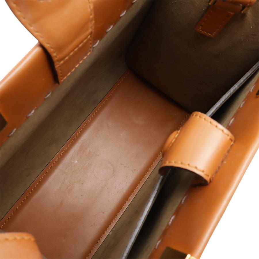 【コメント】若干使用感がございますが、比較的状態の良いお品物でございます。直線的なデザインと洗練されたディテールが際立つ、スモールサイズのサンシャイン バッグ。万能でゆとりのある、都会的なトートバッグです。ブラウンのカーフレザーにホットスタンプで「FENDI ROMA」のレタリングを飾り、べっ甲柄のハードなプレキシガラス製ハンドルをあしらったデザイン。ライニングを施した容量にゆとりのある内側のコンパートメント、同色のレザーで仕上げた縁、ゴールド仕上げのメタルパーツ。2本のハンドルと調節・取り外し可能なショルダーストラップが付いているため、ハンドバッグ、ショルダーバッグ、クロスボディバッグとして活躍します。