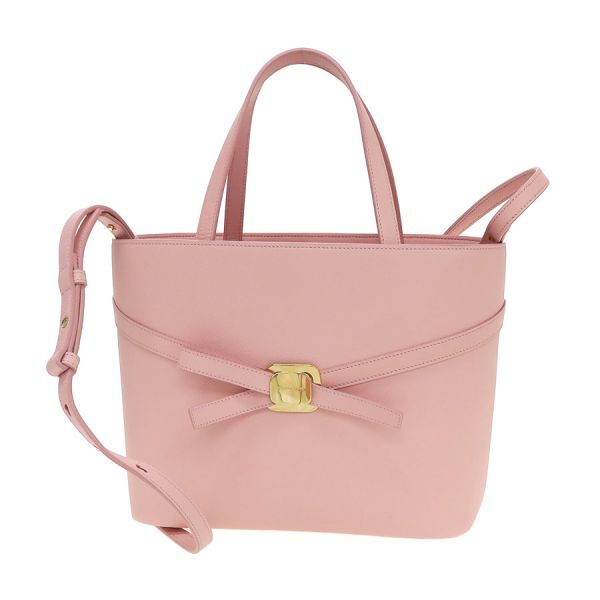 フェラガモのニューヴァラ・プレートトートバッグのご紹介です!フェミニンなピンクカラーが大人可愛いアイテム♪間口はリボンタイプで、内側にはファスナーポケットがございます。ハンド・ショルダーの2WAYタイプでその日の気分に合わせてお持ちいただけますよ。☆状態は、本体の多少の型崩れ、表面のスレ・薄汚れ、角スレ、ハンドルやショルダーのスレ・クセ、内部のスレ、金具の小傷やくすみなどが見受けられますが、目立つダメージはなくまだまだご愛用いただけますよ♪