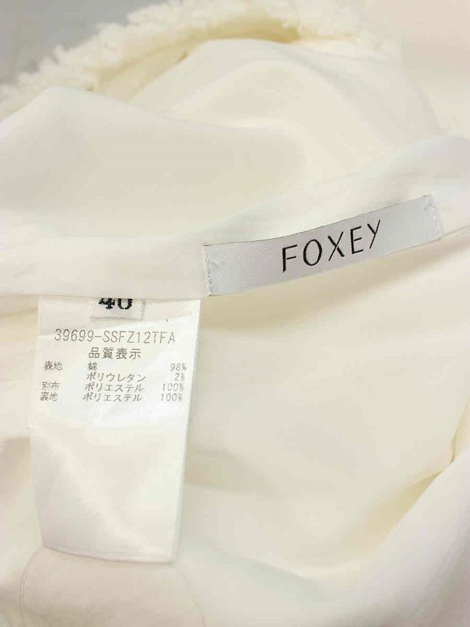 【管理番号】0250998g0194304【ブランド・アイテム】FOXEY BOUTIQUE スカート【性別タイプ】レディース【表記サイズ】40【実寸サイズ】総丈:約60cmウエスト:約68cm【カラー】ホワイト【素材】画像参照【状態の詳細】USED品のため、ある程度の使用感やダメージが見受けられるお品物となります。【汚れ・シミ】ウェスト付近に色付き、全体的に変色がございます。【傷・ツレ】特に目立つものはございません。【毛玉・毛羽立ち】全体的に若干毛羽立ちがございます。【使用感】あり【こんな方におススメ】少しくらいのシミやダメージが気にならない方におススメ【付属品】付属品なし【備考】販売年月:2019型番:39699