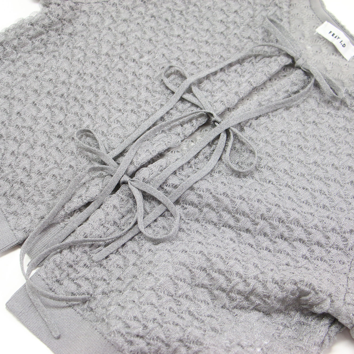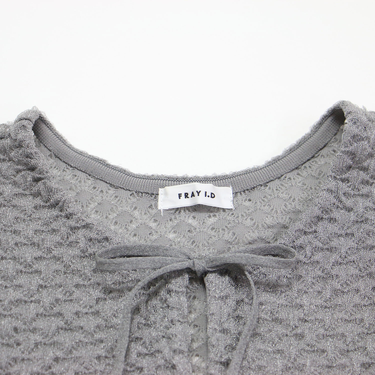 | 商品説明 | ・透け感あり ・ショート丈 ・フロント3段リボンデザイン ・ポコポコジャガード素材 |