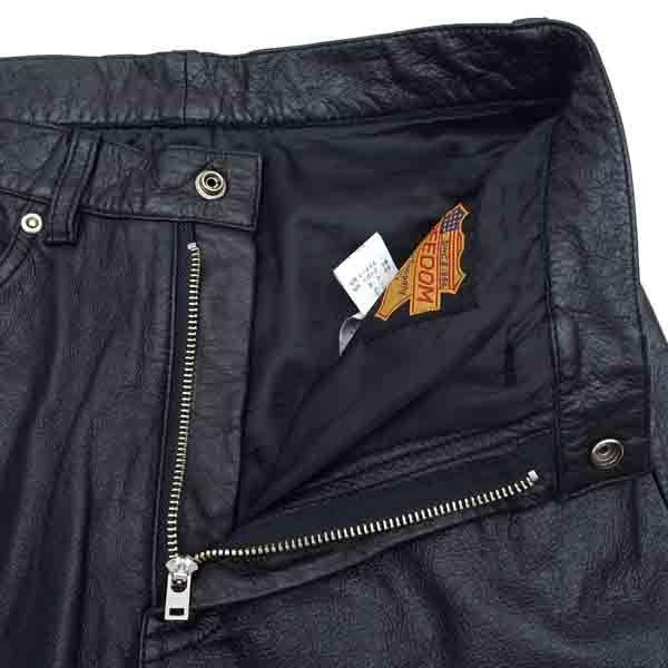 ・メーカー :FREEDOM / フリーダム・サイズ :表記サイズ:73,ウエスト (約cm):74,太腿幅 (約cm):27.5,股上 (約cm):28,股下 (約cm):73.5,裾幅 (約cm):19,・色(柄)の系統:ブラック・デザイン :(メンズ)ボトムス/パンツ・素材 :表地:牛革 裏地:ナイロン50% アセテート50%