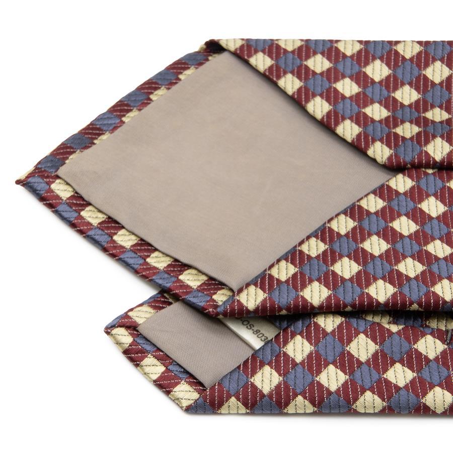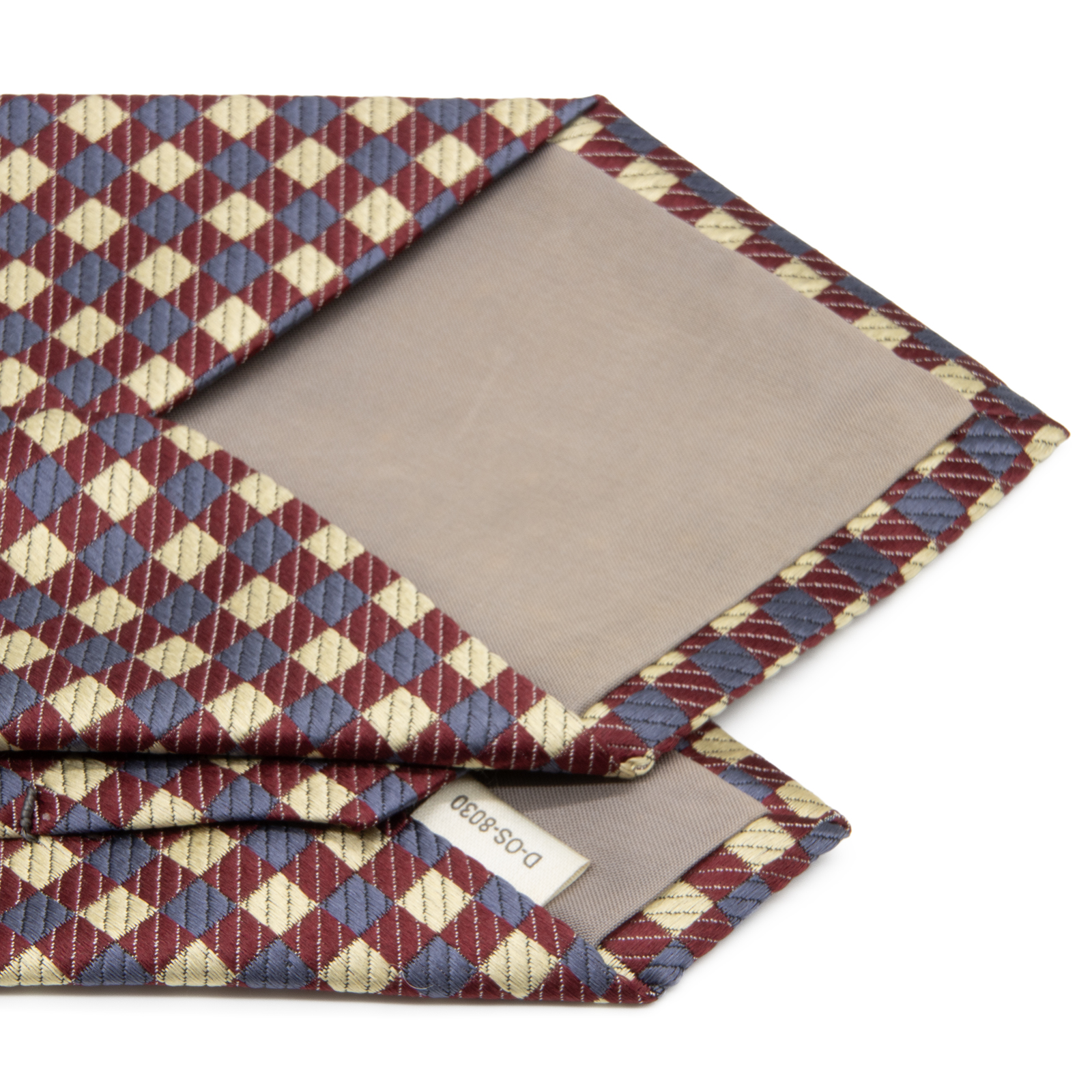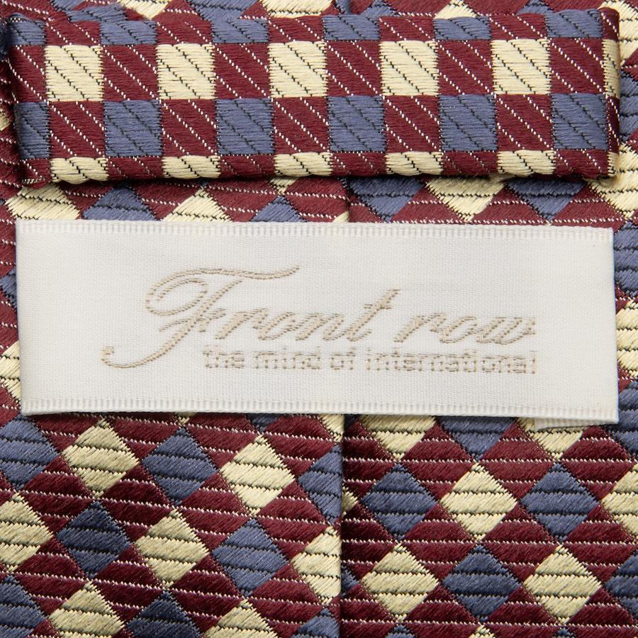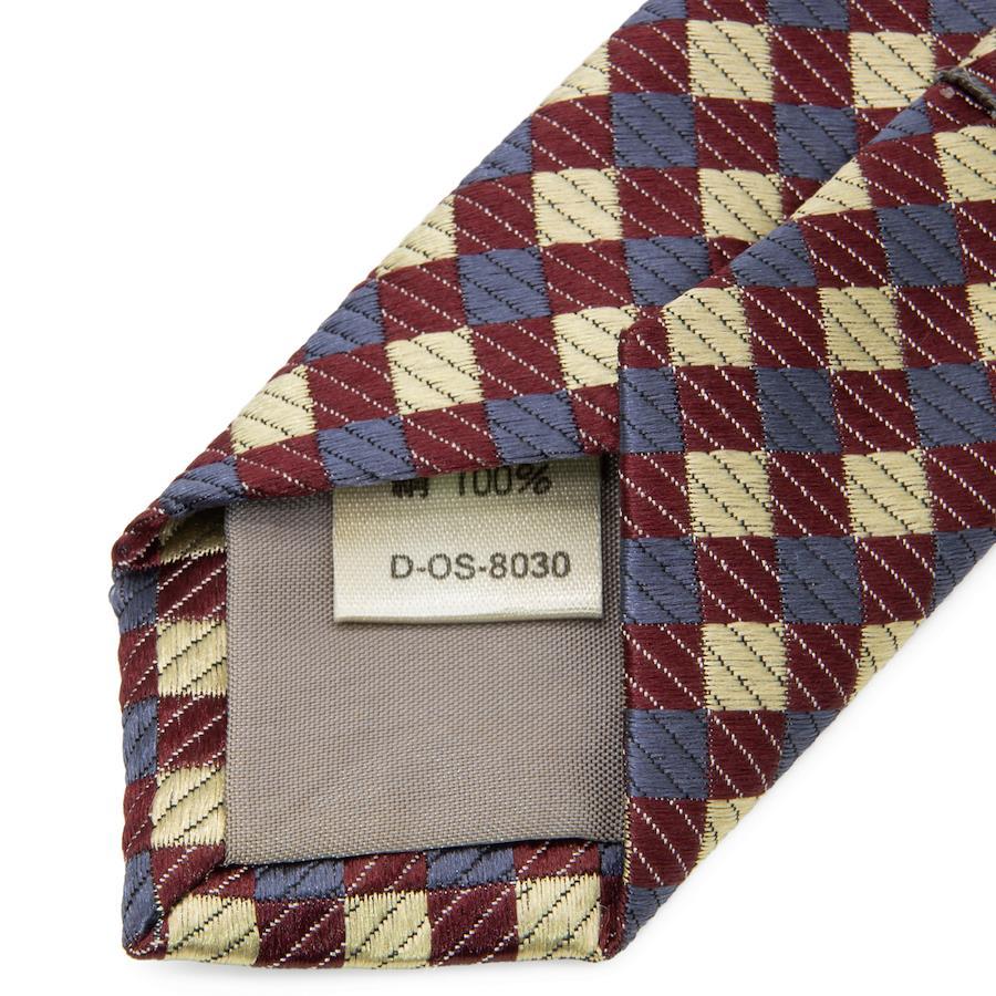 バーガンディーとブルー、ベージュの色彩で織りなされた四角いマークのジャガード織りは、お客様の胸元に洗練された印象を添えます。