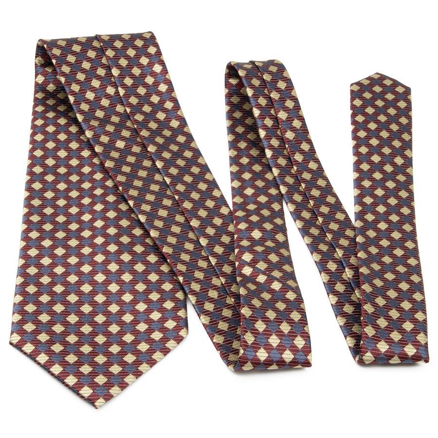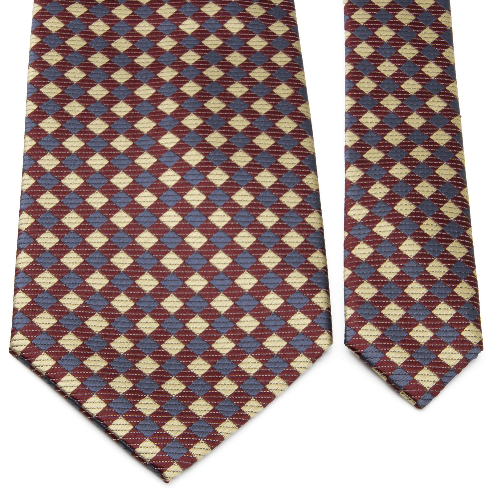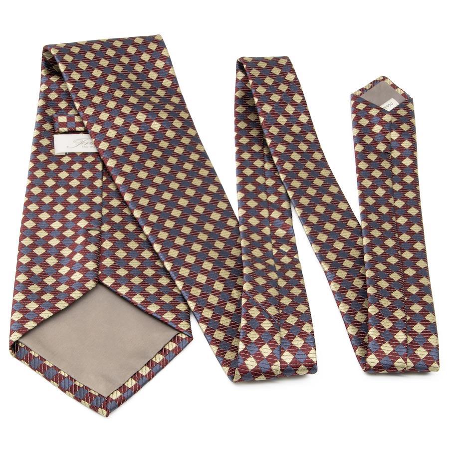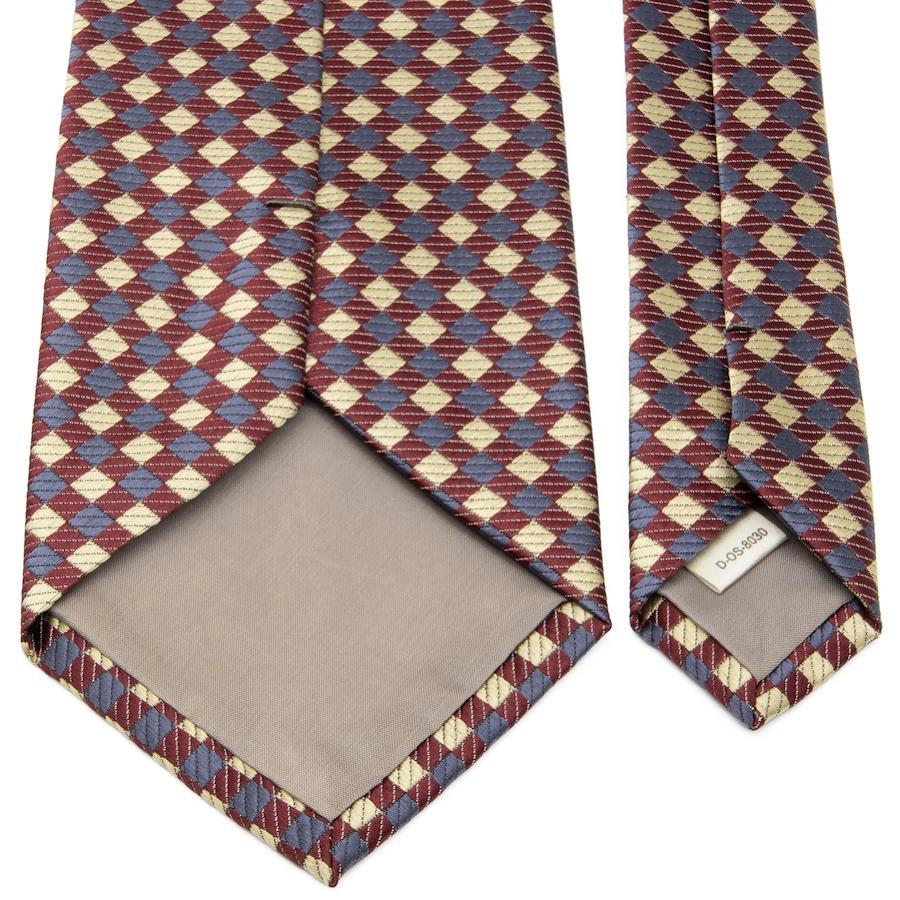 バーガンディーとブルー、ベージュの色彩で織りなされた四角いマークのジャガード織りは、お客様の胸元に洗練された印象を添えます。