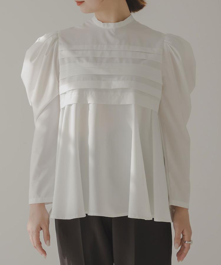 【ディティール】タックデザインが魅力的なフレアブラウス。フロントは立体的なタックディティールで顔回りを華やかに演出。お袖はボリューム感のあるパフスリーブでトレンド感をプラスしました。裾にかけてきれいに広がるフレアシルエットは気になる体型カバーにも◎後ろはファスナー仕様になっており、着脱もらくちんです。上品な雰囲気で1枚で着映え感抜群のアイテムです。【素材】インスタイルもごわつかない軽やかな素材を使用。適度なハリ感と柔らかさを併せ持った風合いです。皺になりにくく、イージーケアなのも嬉しいポイントです。【スタイリング】シンプルな中にディティールの詰まった上品なデザインなのでオケージョンスタイルにぴったり。上からジャケットを羽織ってもごわつきません。ボトム次第でカジュアルにも着られるのでデイリーにはもちろん、お出かけや入卒式などのフォーマルシーンにもおすすめです。**********************透け感:なし ※淡色インナーをおすすめします。裏地:なし伸縮性:なし光沢感:なし生地の厚さ:普通**********************《生産国》中国