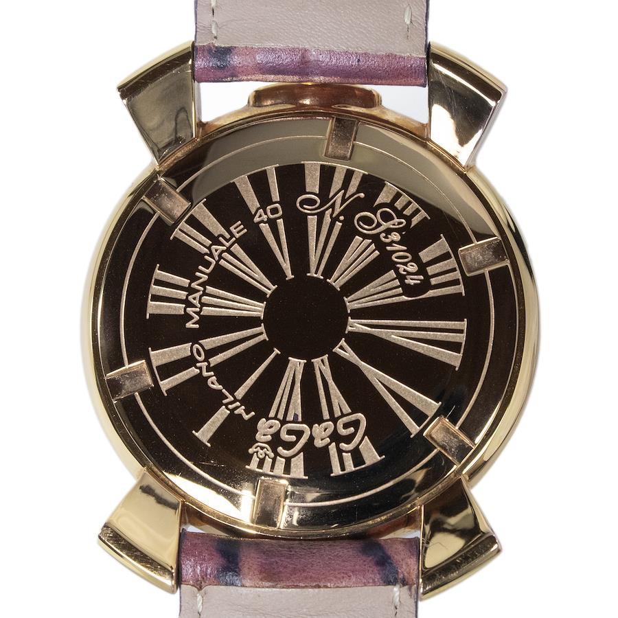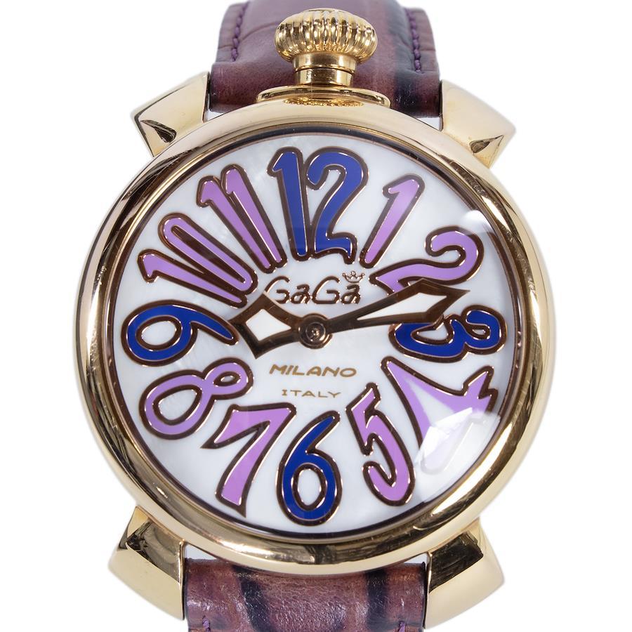 こちらはシェル文字盤が、虹色の輝きで腕元を彩ってくれる、ガガミラノの腕時計でございます。